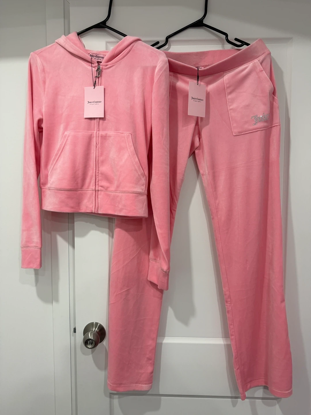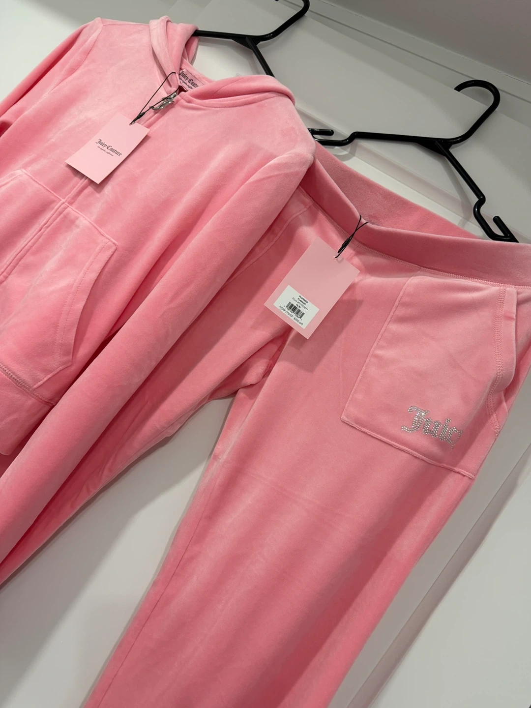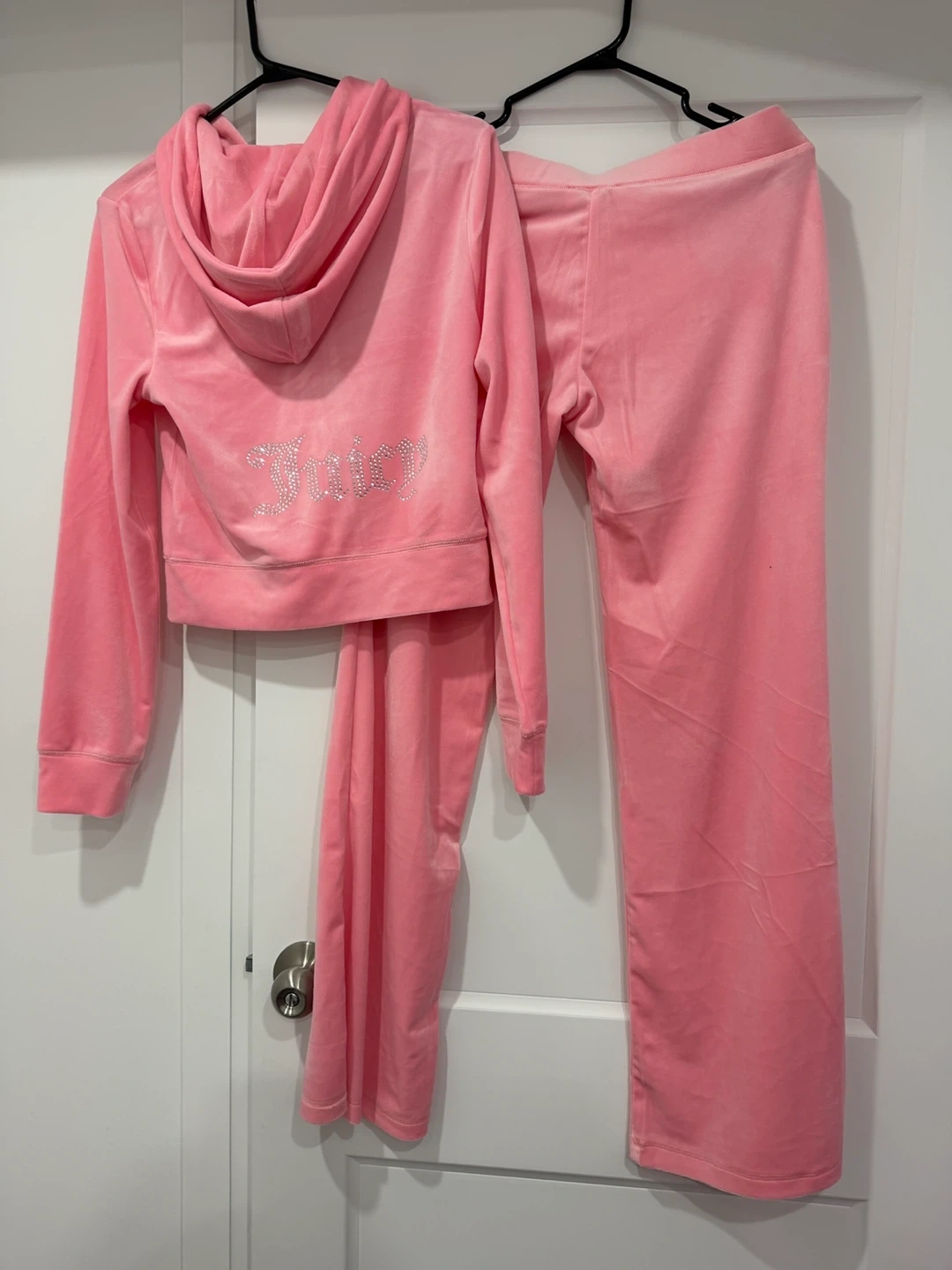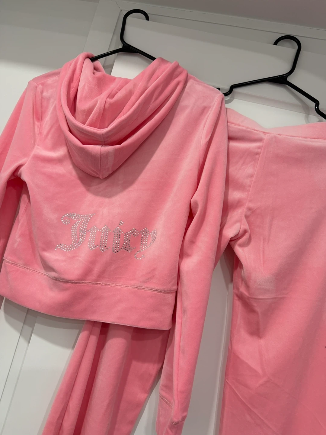 This is a pink flamingo velour tracksuit from Juicy Couture. It includes a zip-up hoodie and matching pants. Both pieces have the Juicy Couture logo embellished with rhinestones. The hoodie features a front pouch pocket and a drawstring hood. The pants have a comfortable elastic waistband.