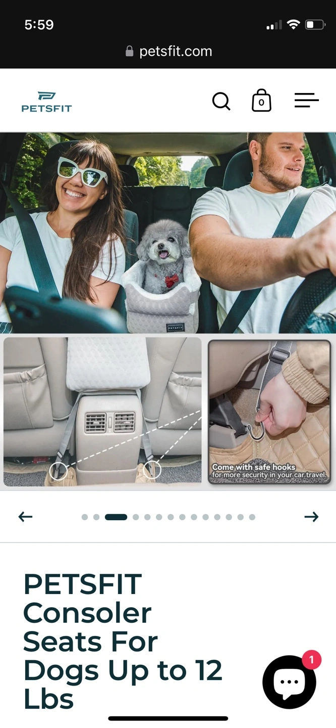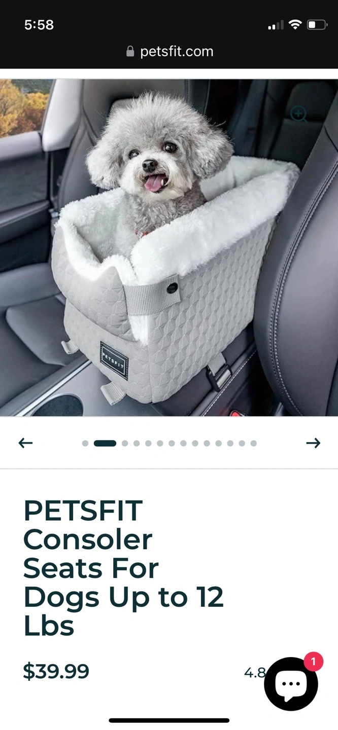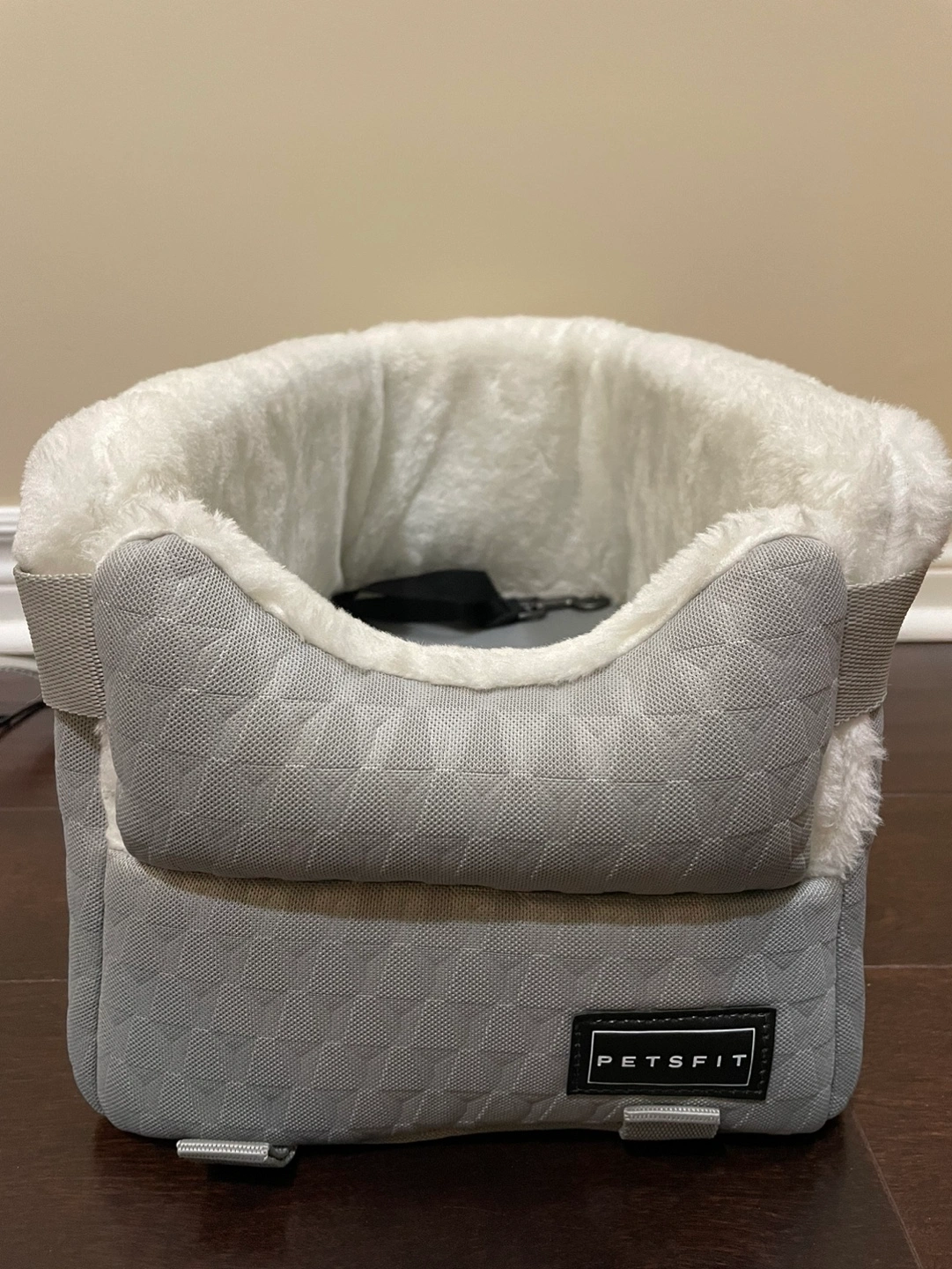 Petsfit dog car seat for small dogs. Fits on the middle console. Too small for my dog. Just tried it once so can’t return. Small spot on the bottom. Size is on the website. For dogs under 12 lbs.