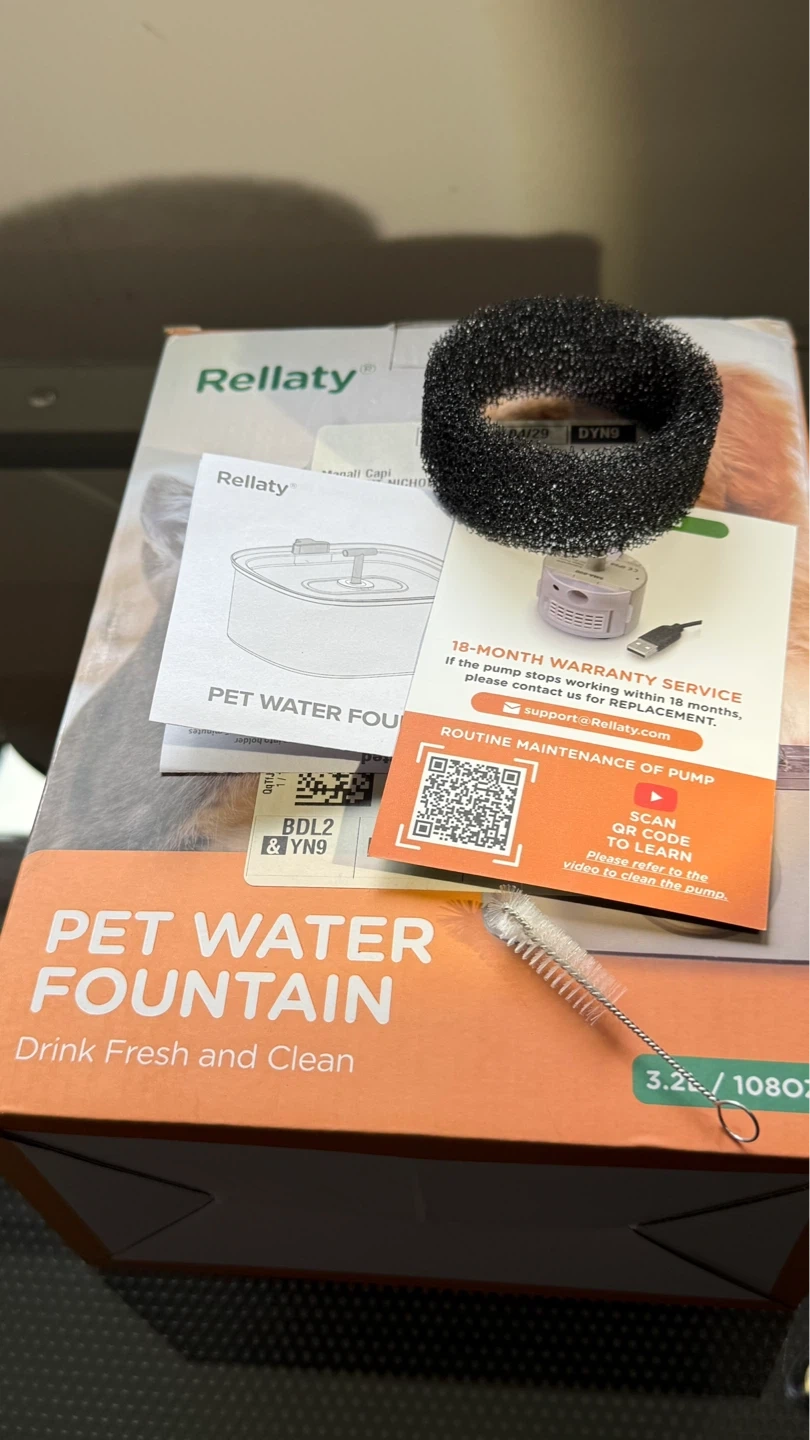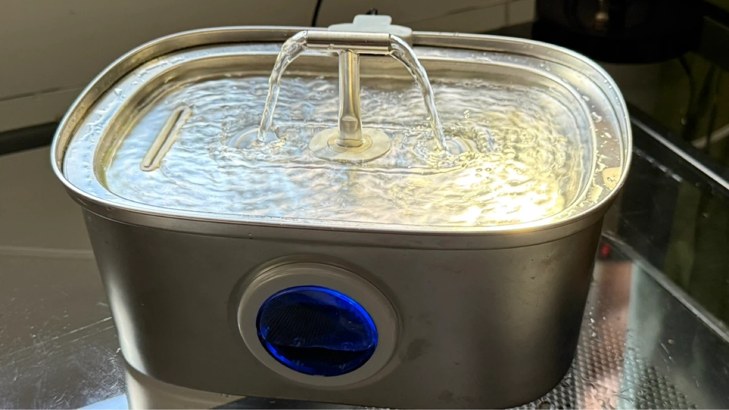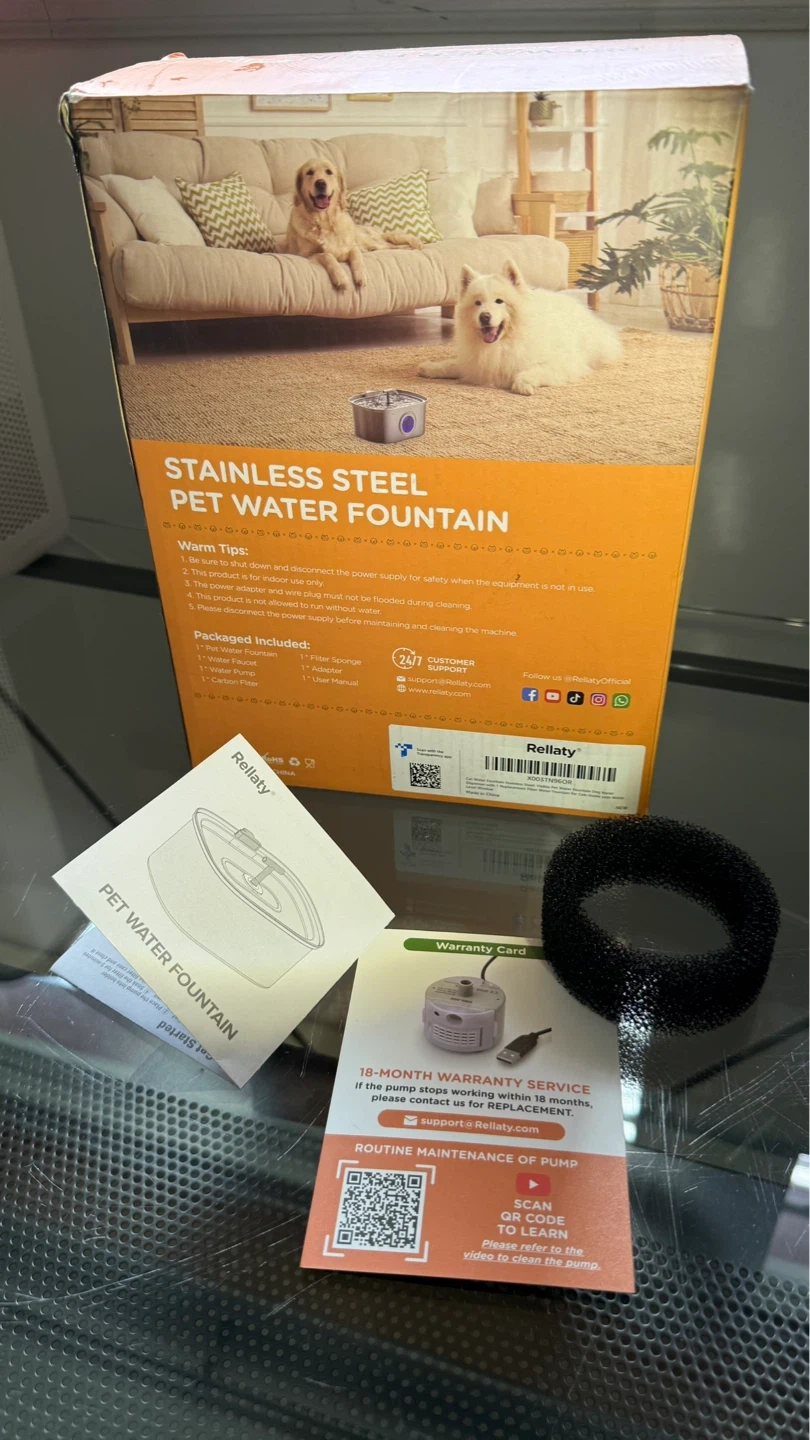 Stainless steel pet water fountain with a 3.2L capacity. It's designed for cats and dogs and comes with a water pump, 2 filters and cleaning brush. Barely used.