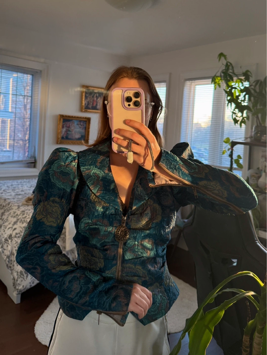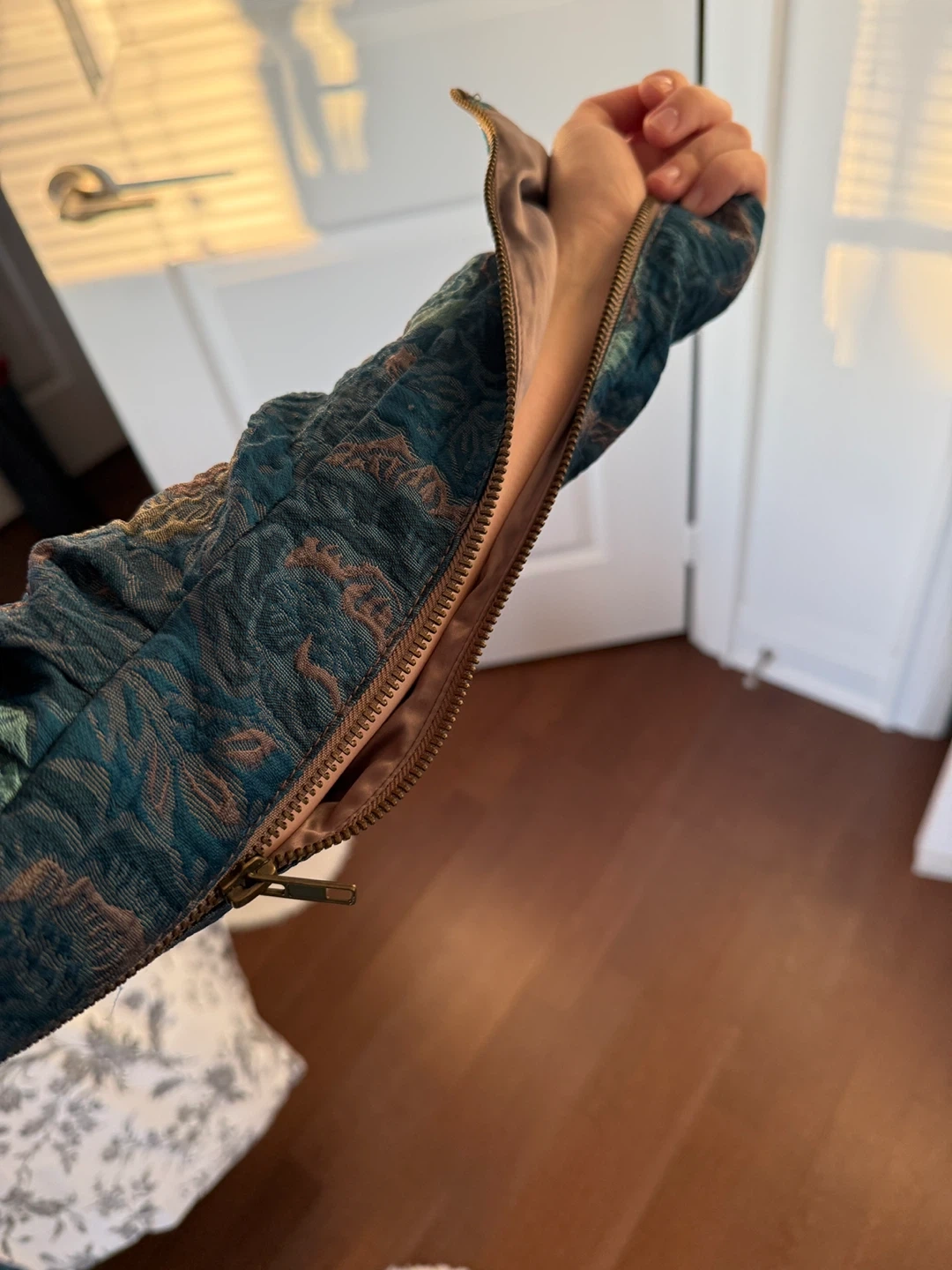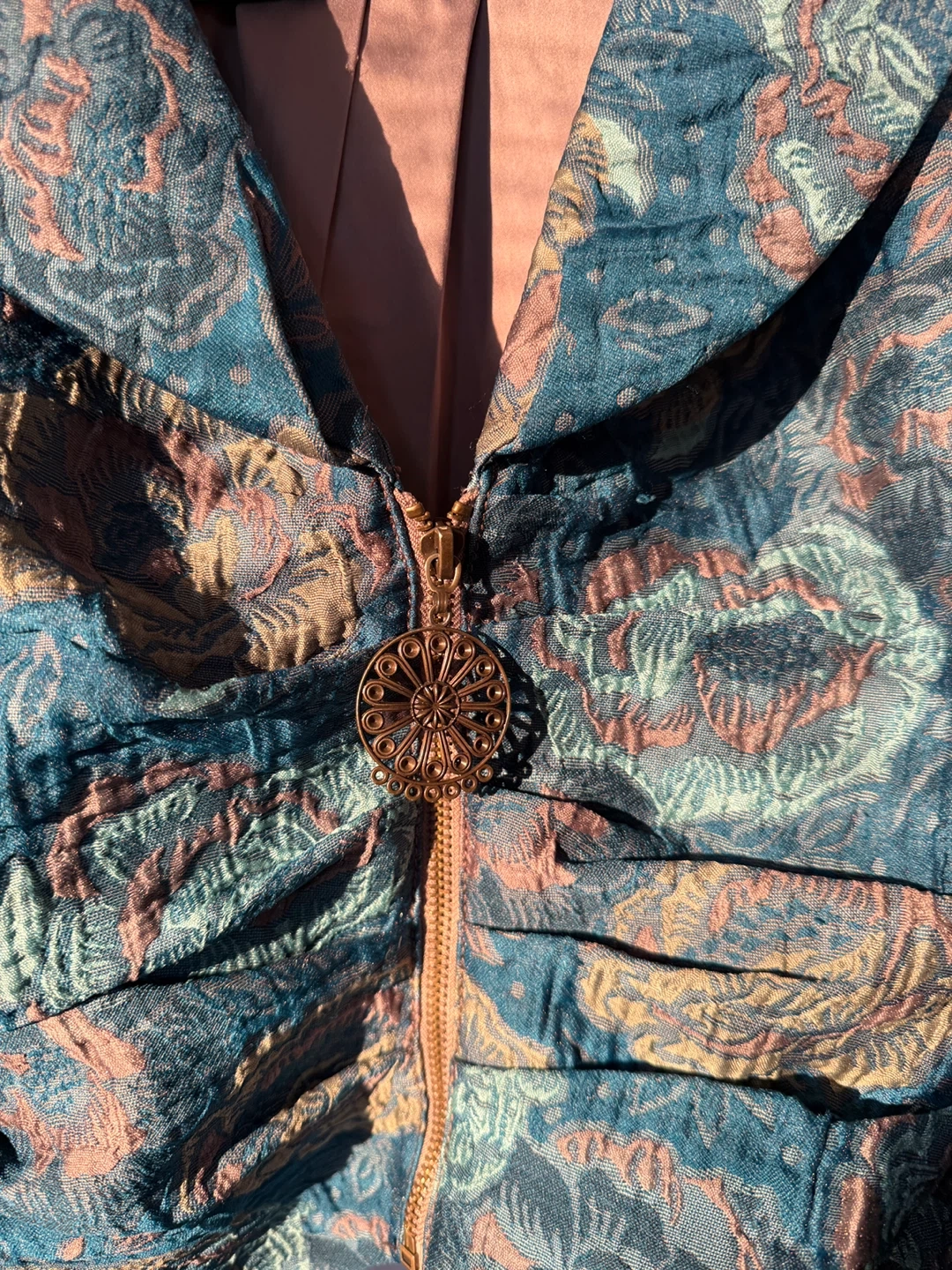 This jacket has a luxurious, textured feel. A unique floral pattern with puff sleeves and a decorative zipper pull. Feels like you’re wearing a piece of art :)