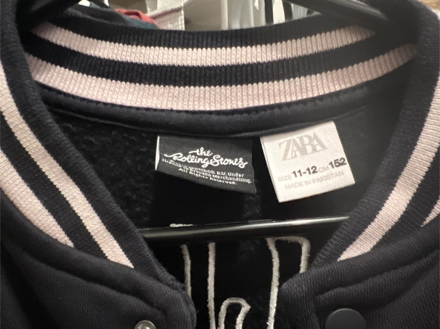 Black and white varsity jacket featuring the Rolling Stones logo and lips. Made in Pakistan. Size 11-12 years, 152 cm. Perfect for any young fan of the iconic band!