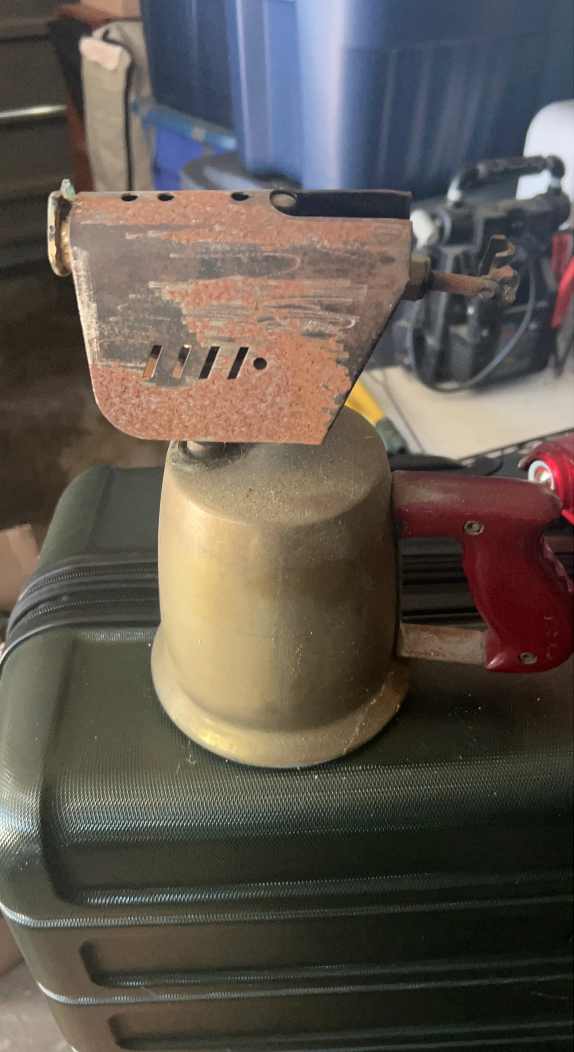 This is a vintage brass blow torch with a red handle. It appears to be functional but shows signs of rust and wear. Great for crafts or antique collections!