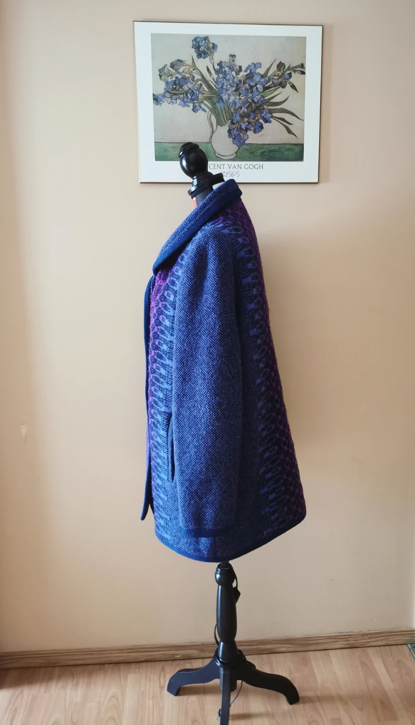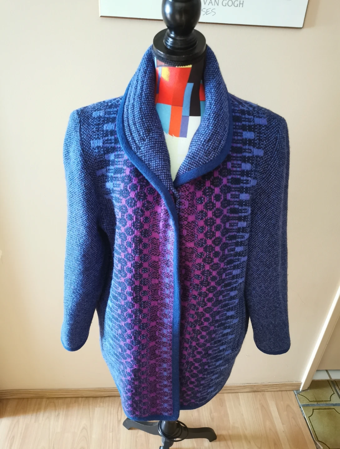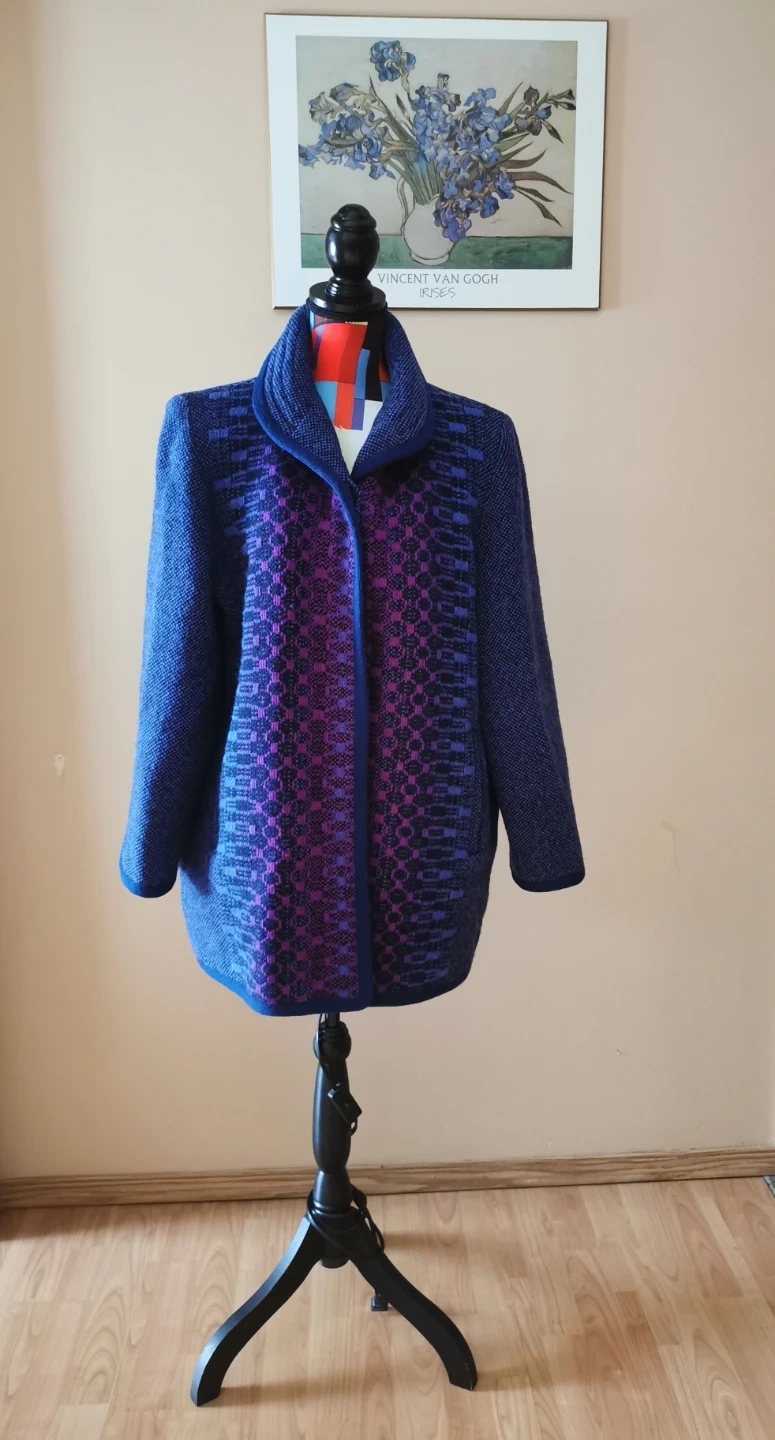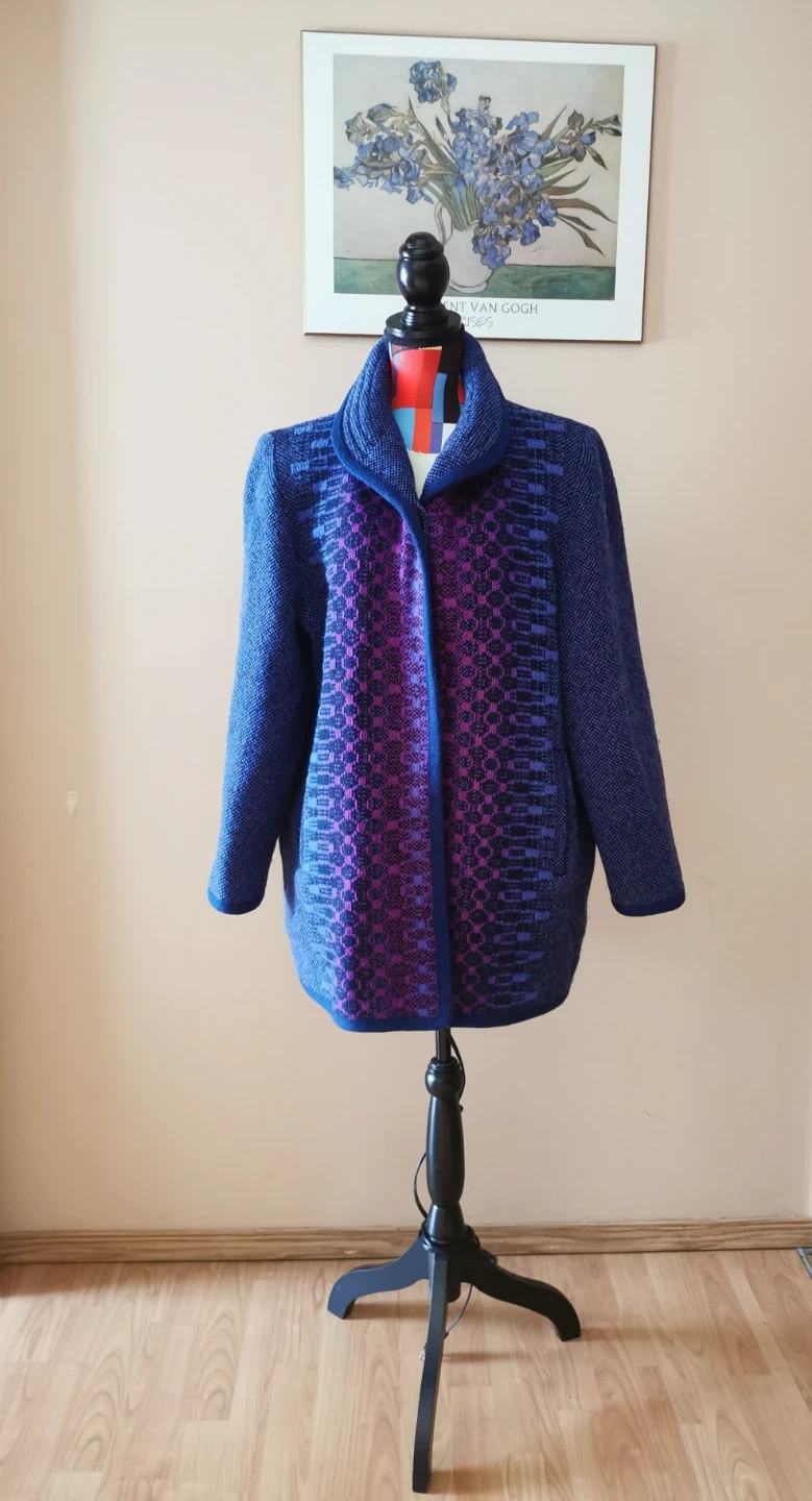 Stunning handcrafted wool jacket by de Weever’s Wovens, made in Aylesford, Nova Scotia, Canada 🇨🇦. Known for their handcrafted garments, this brand specializes in timeless, durable pieces made from 100% wool using traditional weaving techniques. This piece showcases the brand’s signature artisan weaving, featuring a rich textured knit with an eye-catching geometric pattern in vibrant blue and purple tones.