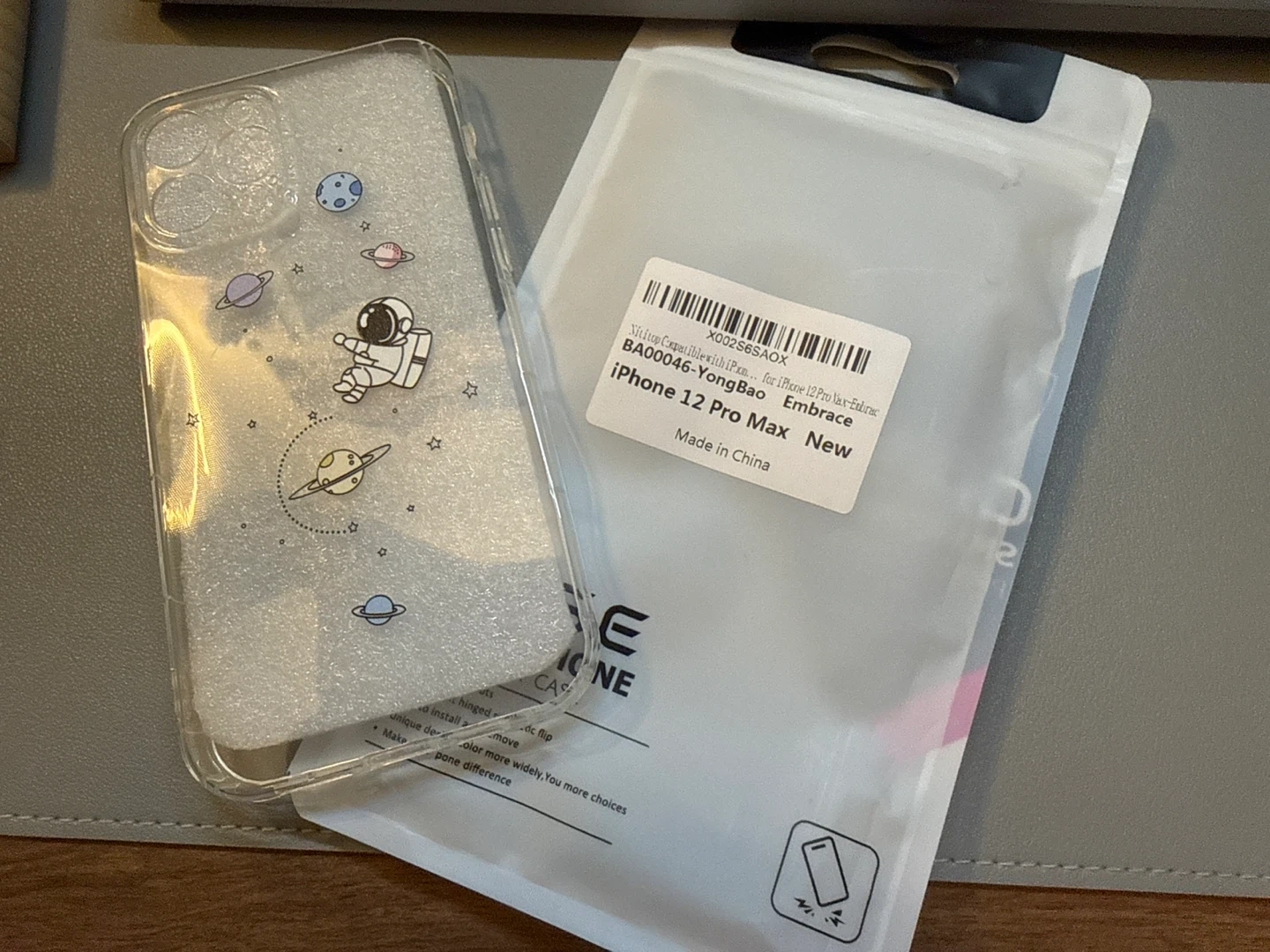 This is a clear case for the iPhone 12 Pro Max with a fun astronaut and planet design. It's made of a flexible material. Protects your phone with a touch of style!
