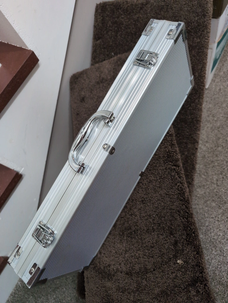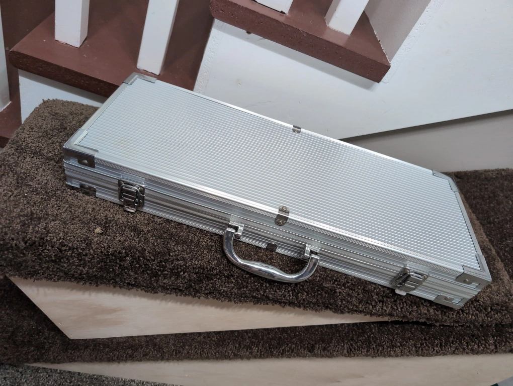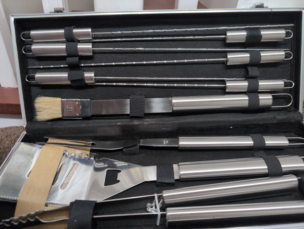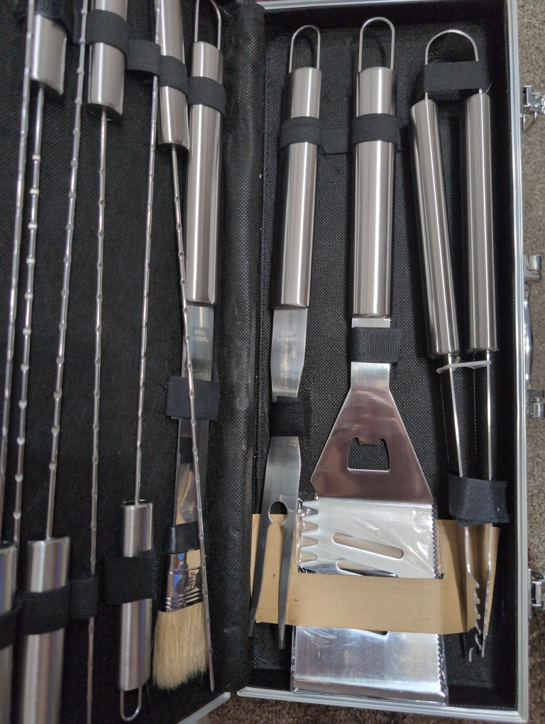 121A great BBQ tool set inside a metallic case. Tools neatly secured with black straps. Including a spatula, tongs, long fork and a brush. Full set of kebab skewers. A relaxing experience awaits, ready to enjoy a great meal?