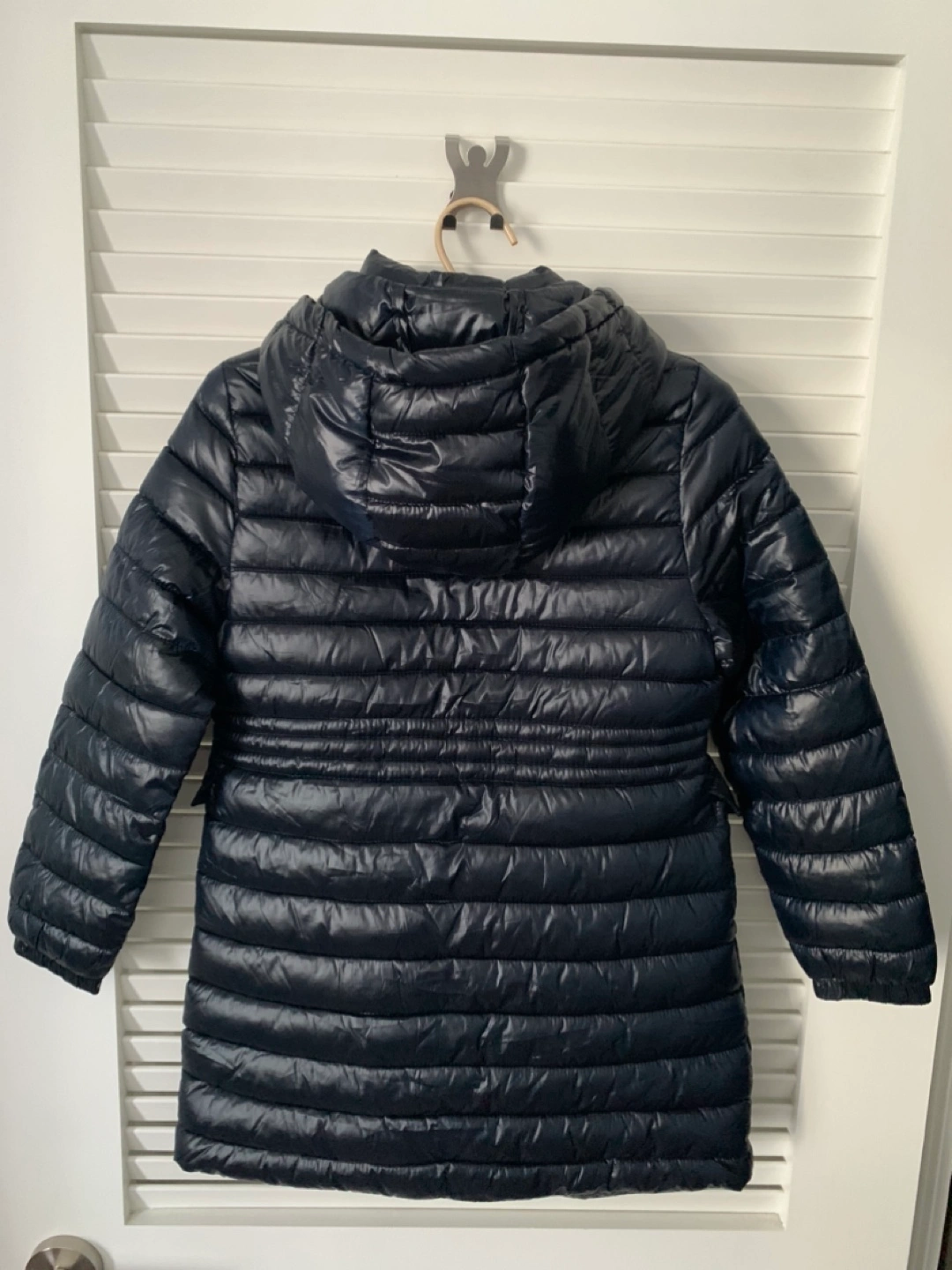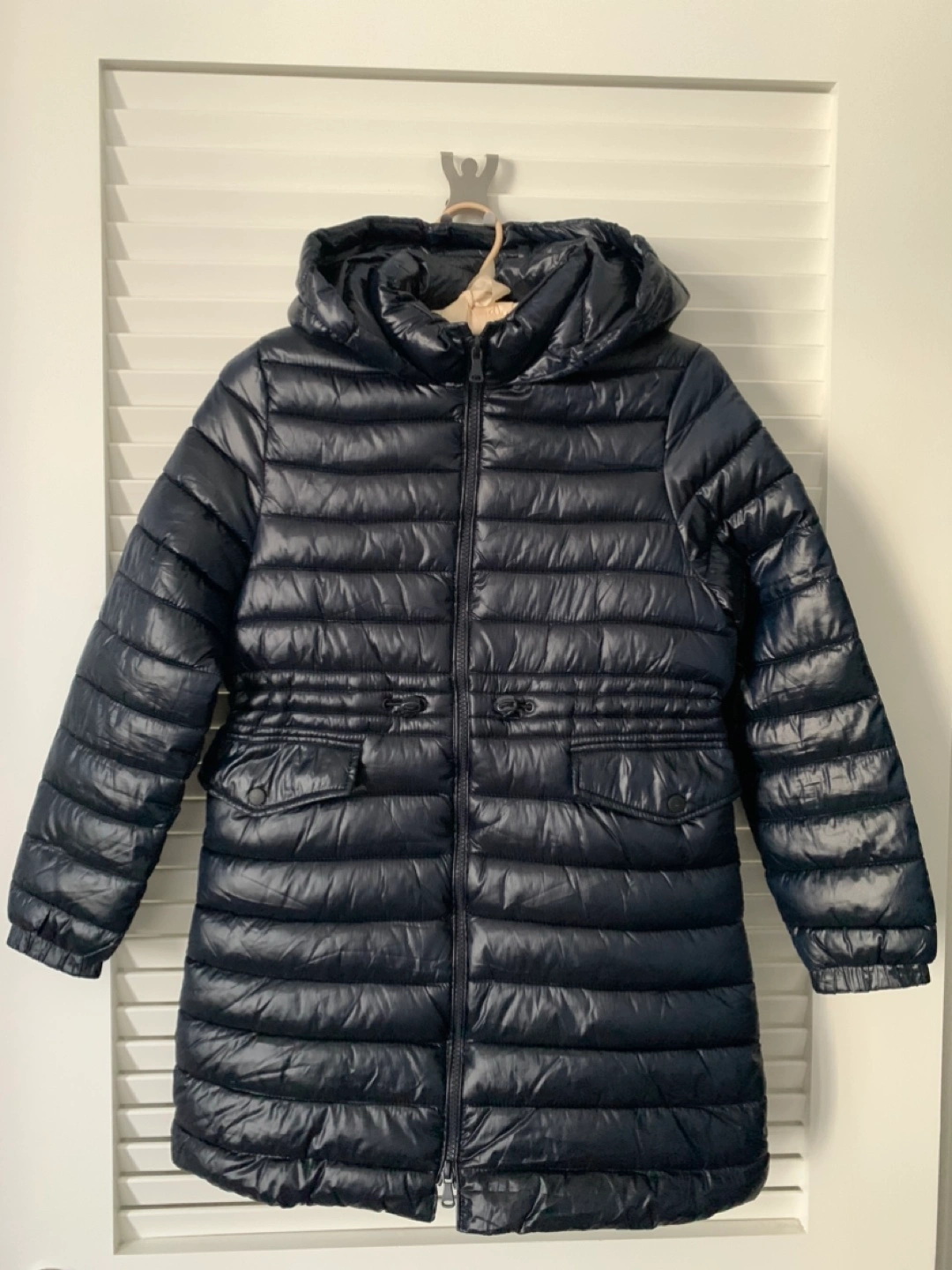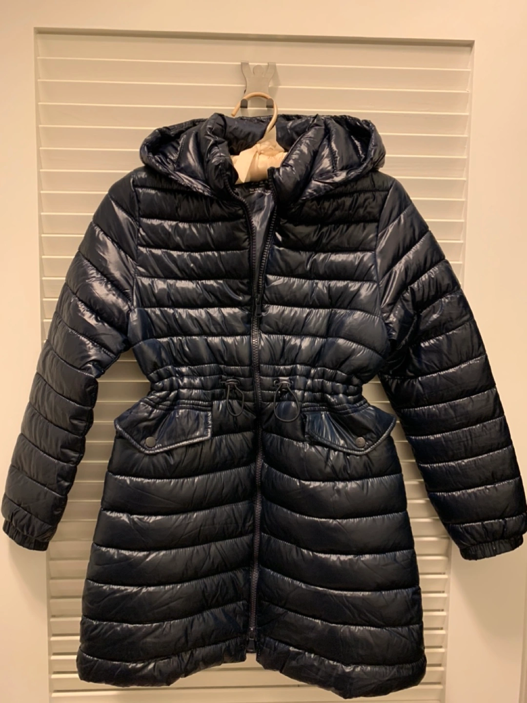 Black puffer jacket with a hood. Has a cinched waist with two side pockets.