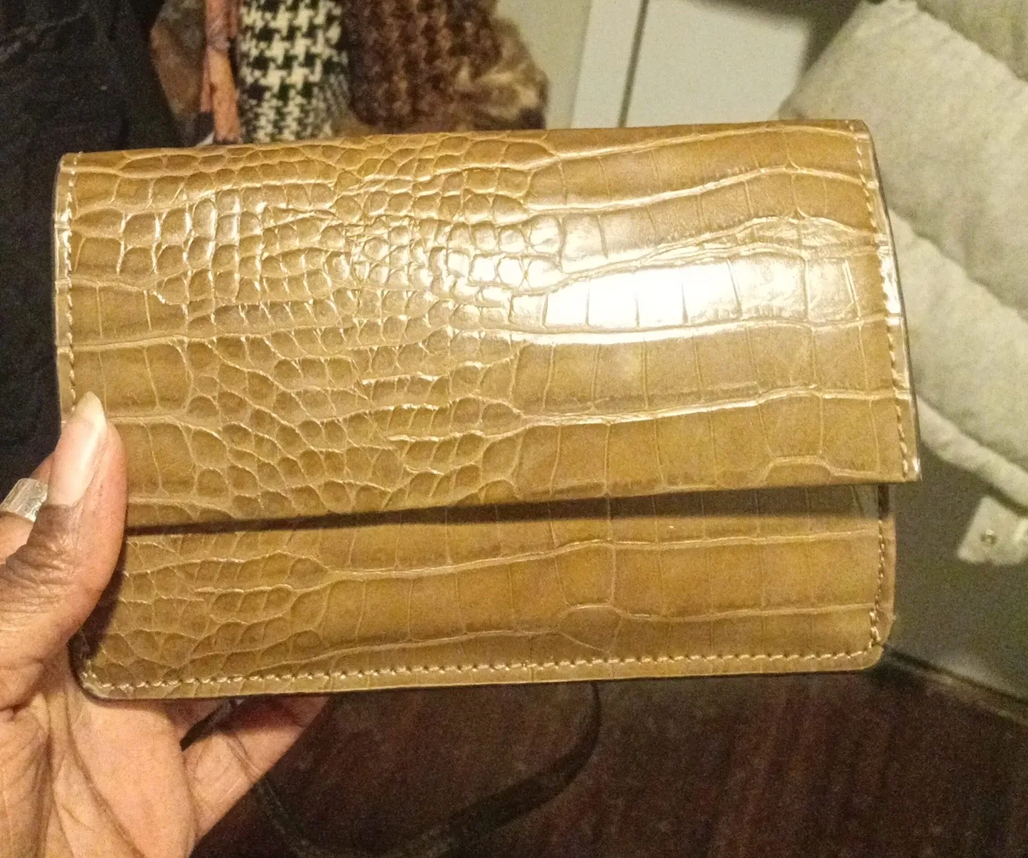 This is a stylish brown wallet with a crocodile embossed finish. It's made from a durable faux leather material. This wallet is great for keeping your cards and cash organized.