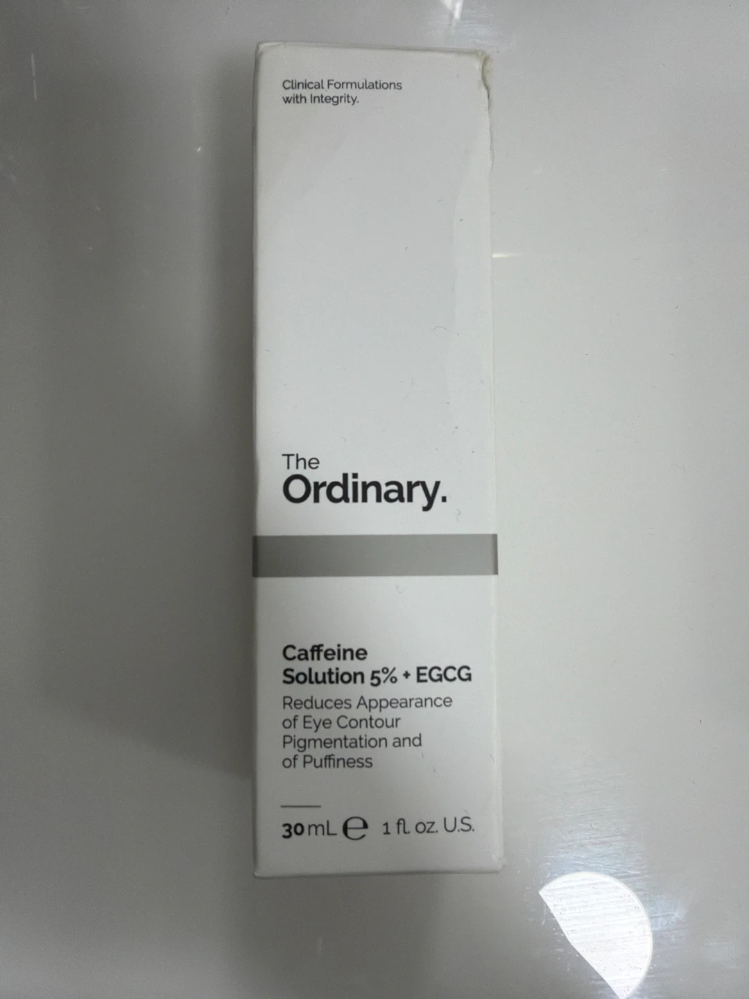 Selling The Ordinary Caffeine Solution 5% + EGCG, which reduces the appearance of eye contour pigmentation and puffiness. It comes in a 30mL (1 fl oz U.S.) bottle. This solution contains high-solubility caffeine and green tea catechin. Massage a small amount onto the eye contour AM and PM. It targets puffiness and dark circles