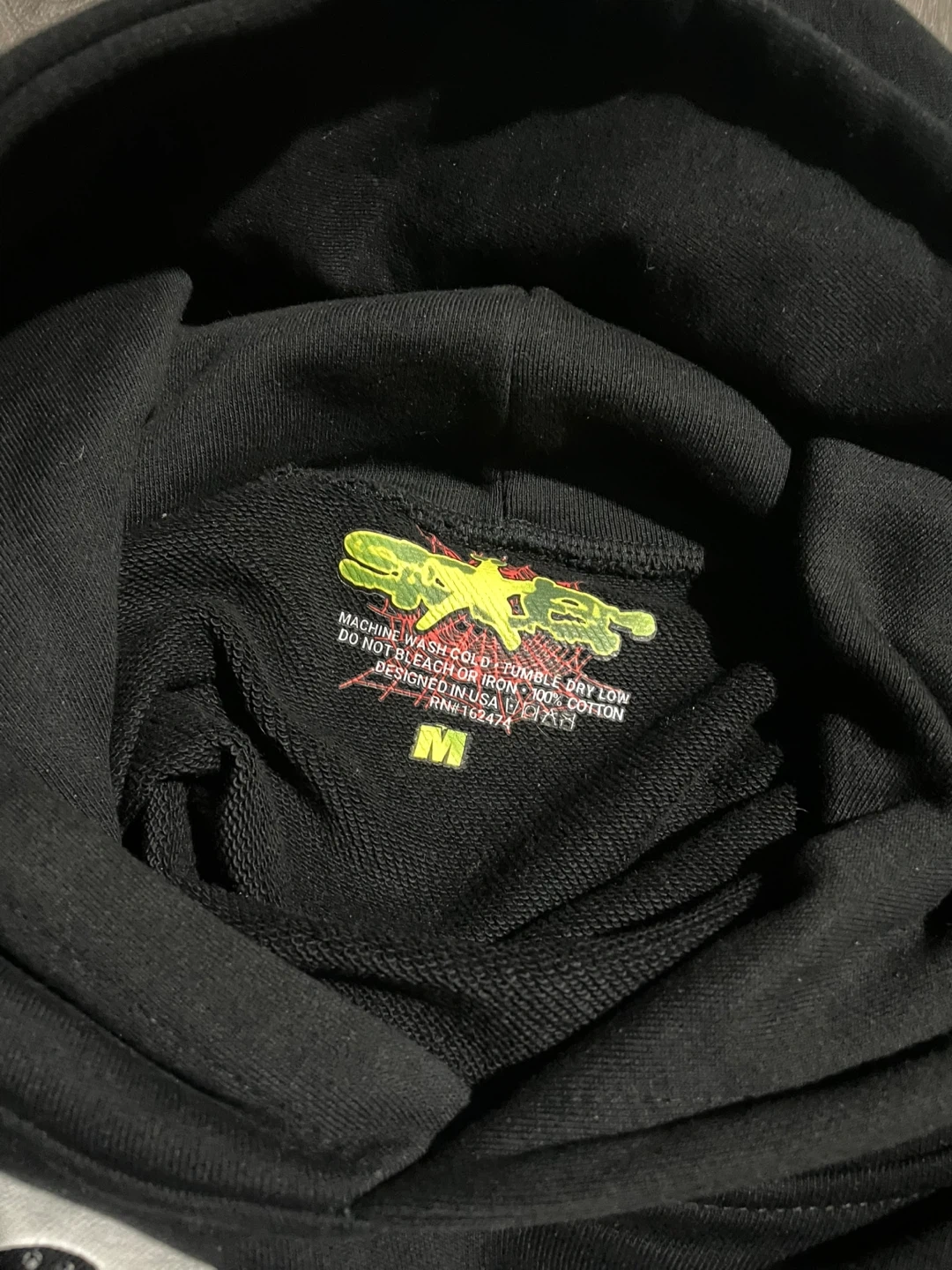 Selling a Sp5der hoodie in black! It's a size medium and made of 100% cotton. It features a spiderweb design on the front. Machine wash cold, tumble dry low. Do not bleach or iron. Pick Up Only