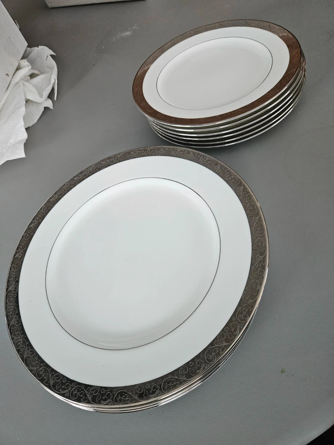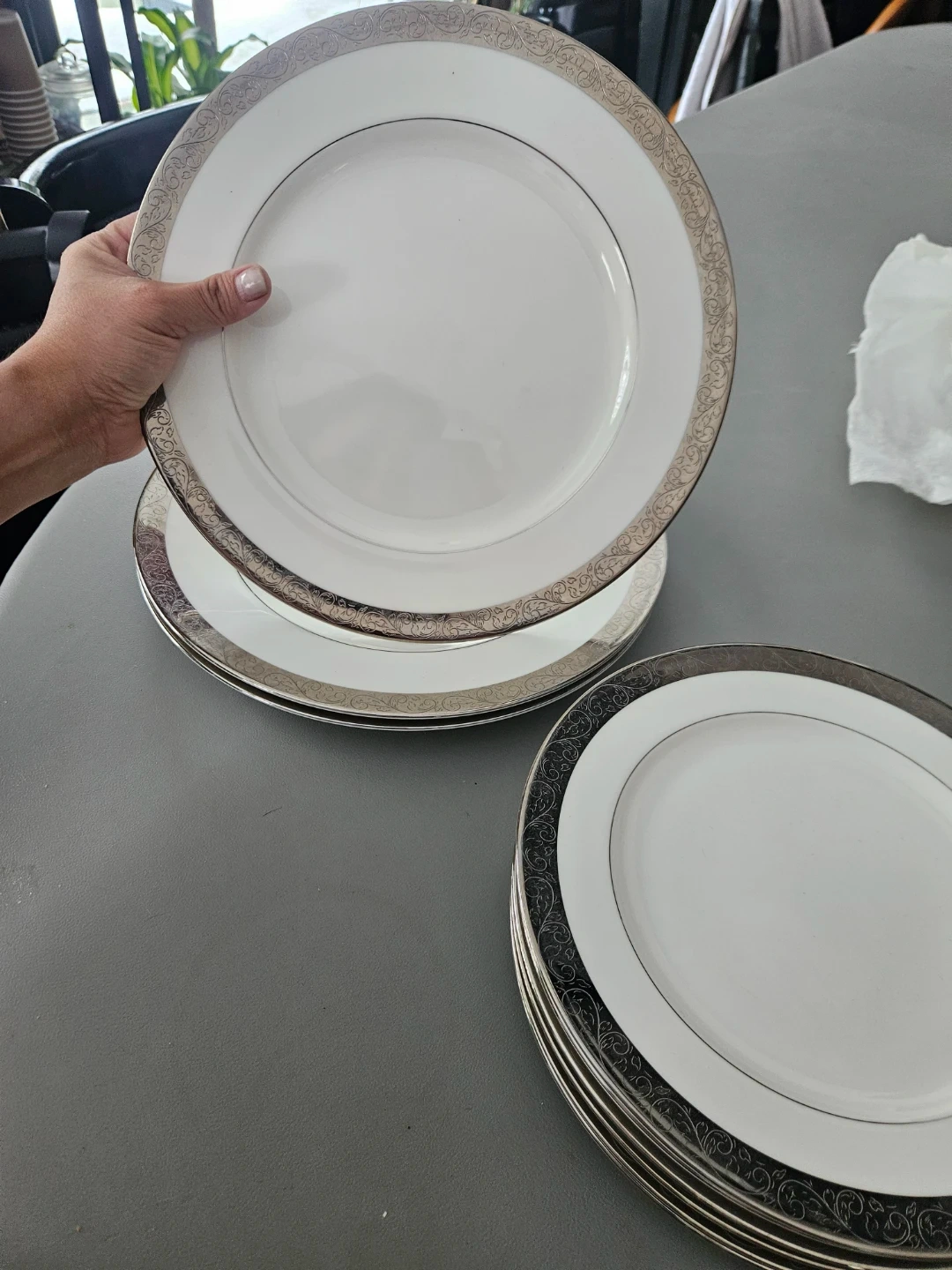 Set of six white HOMESENSE dinner plates. Each plate has a decorative silver scroll trim and a thin silver rim. Dishwasher safe. Great for everyday dining or special occasions!