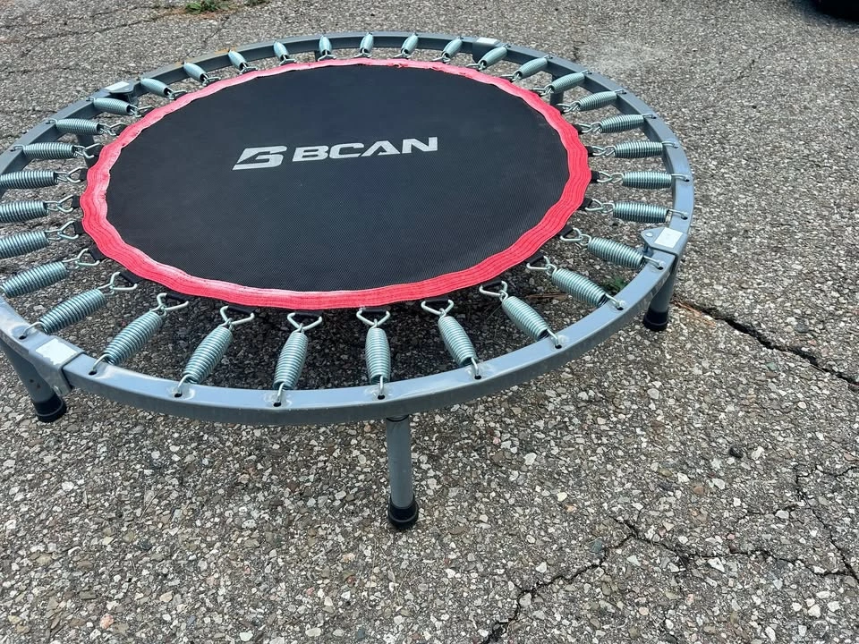 65Selling a sturdy BCAN Mini Fitness Trampoline (Rebounder), perfect for low-impact cardio, lymphatic drainage, and home workouts. It is stable, robust, and in good used condition. Selling due to moving. PRODUCT DETAILS: Brand/Model: BCAN Fitness Trampoline / Rebounder. Type: Spring-based mini-trampoline. Condition: Used, but fully functional. Key Feature Included: Comes with the essential Adjustable Handrail (5-level) for added stability during exercise. Important Note on Condition: The safety pad/spring cover is NOT included. The springs are exposed, as seen in the photos. Replacements can be purchased online if desired, but the trampoline is perfectly usable as is. Similar BCAN models with a handle retail new for approximately $150–$180 CAD.