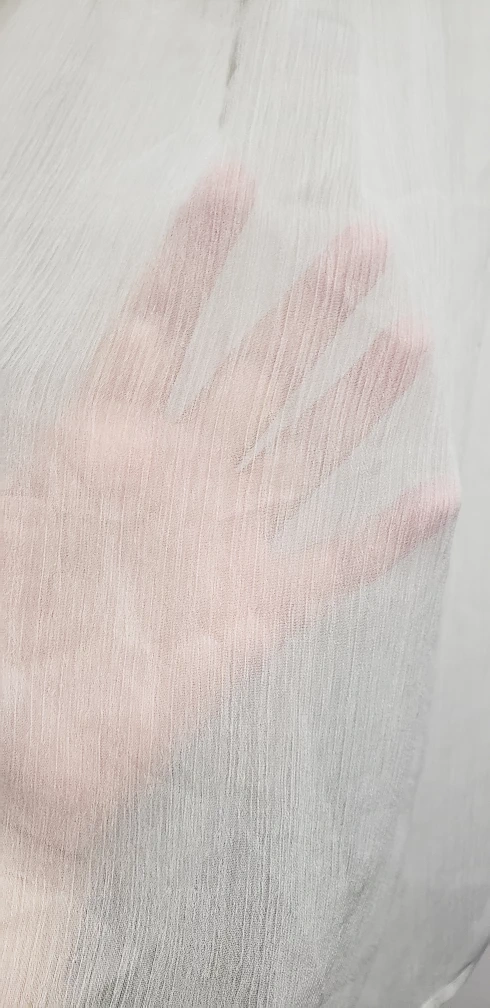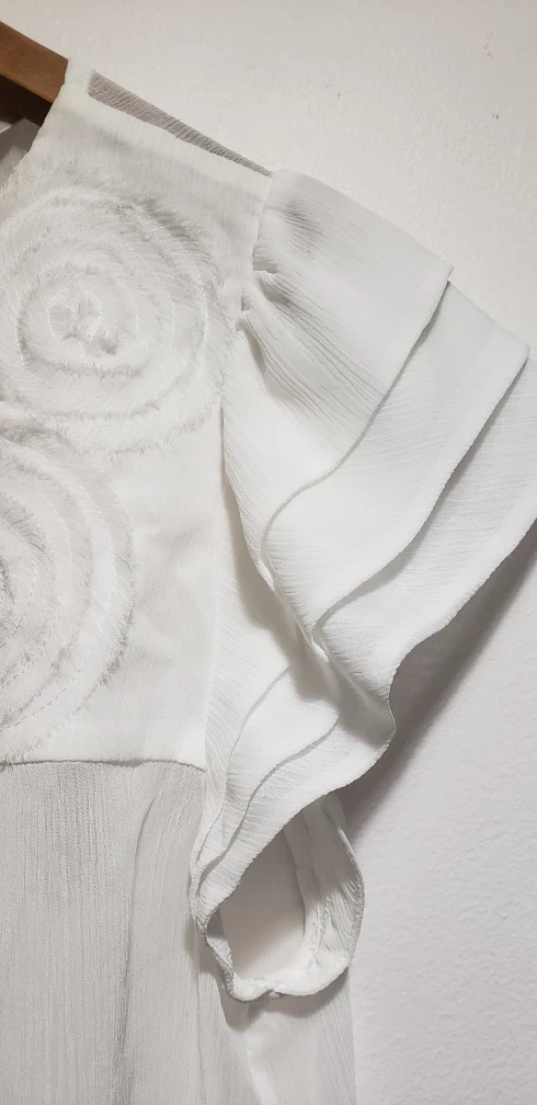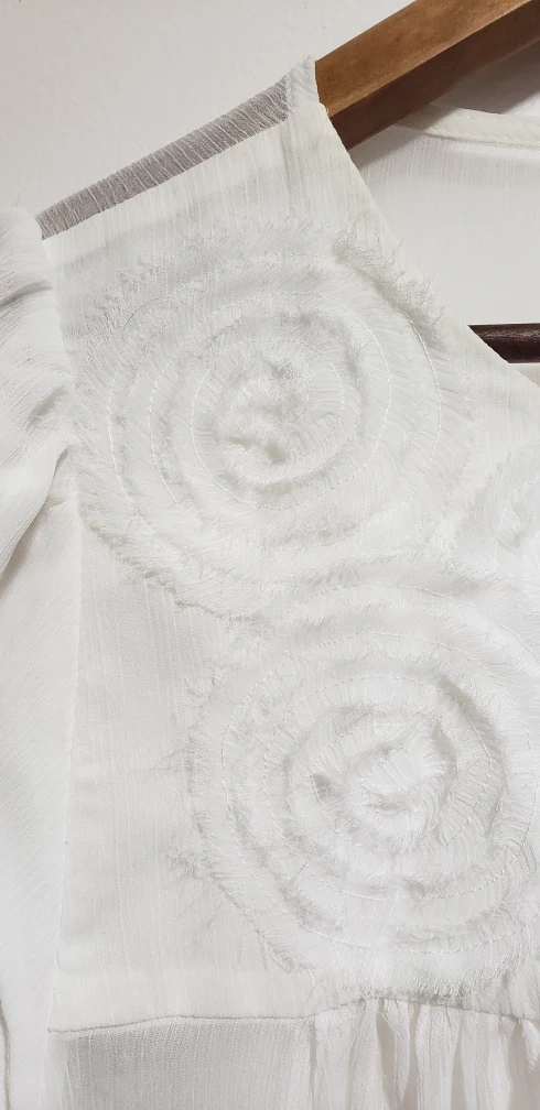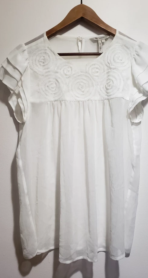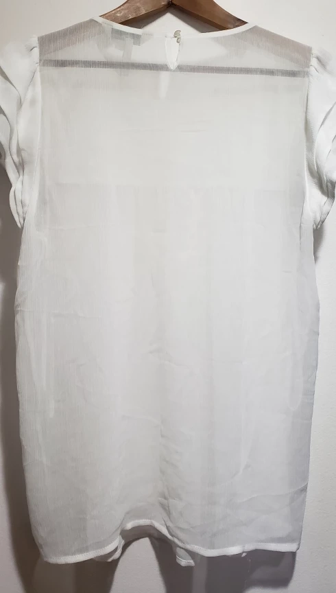 23White sheer top south detailed front. Shoulder 13.5", under arms 19", 26" long, decorative part 7" long.