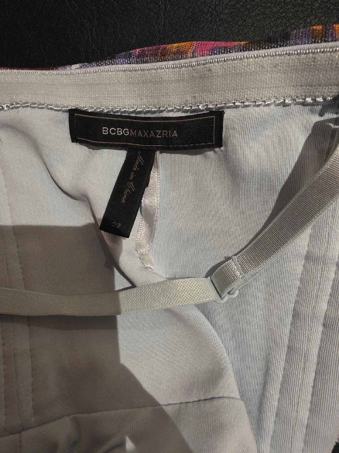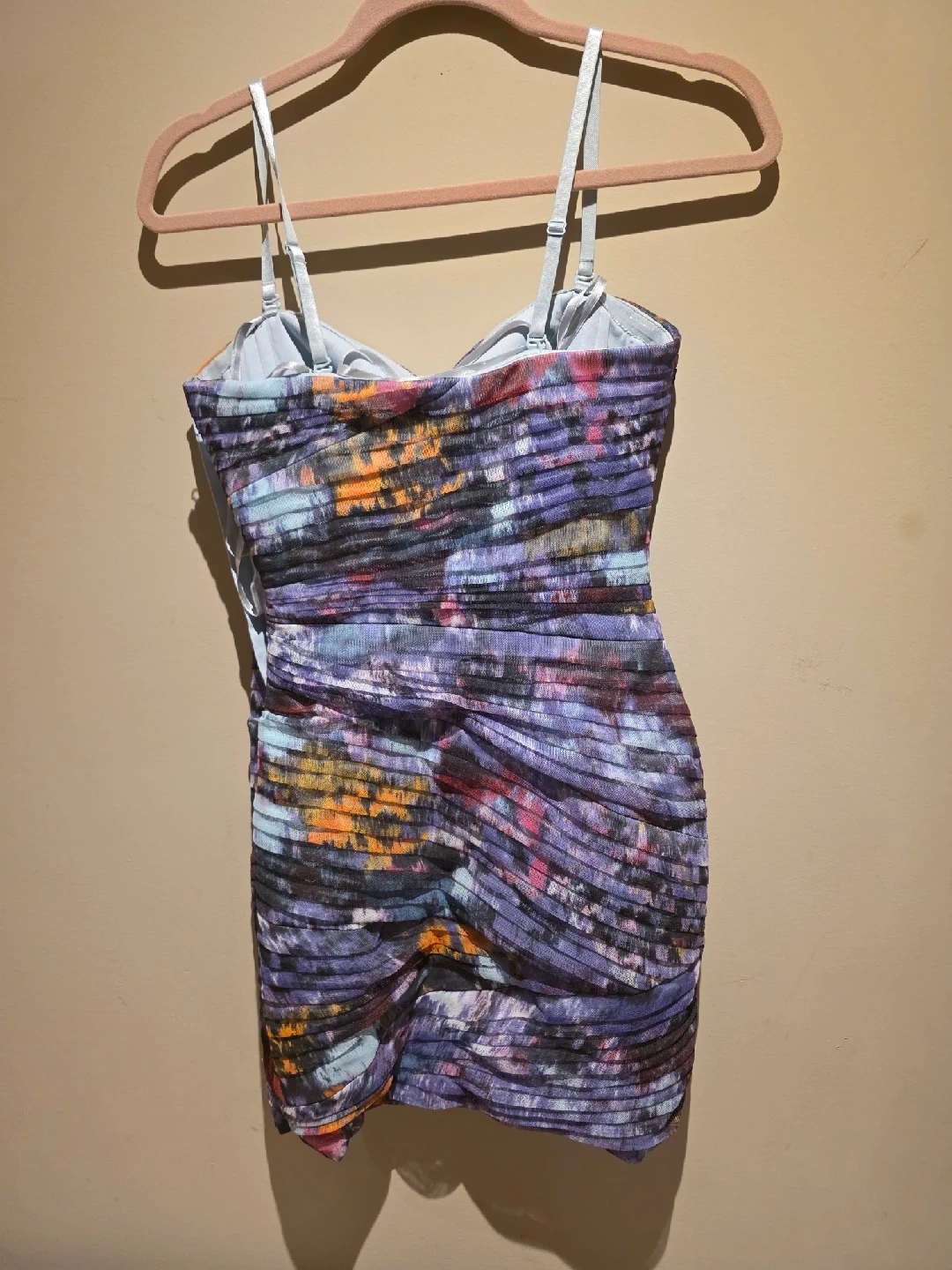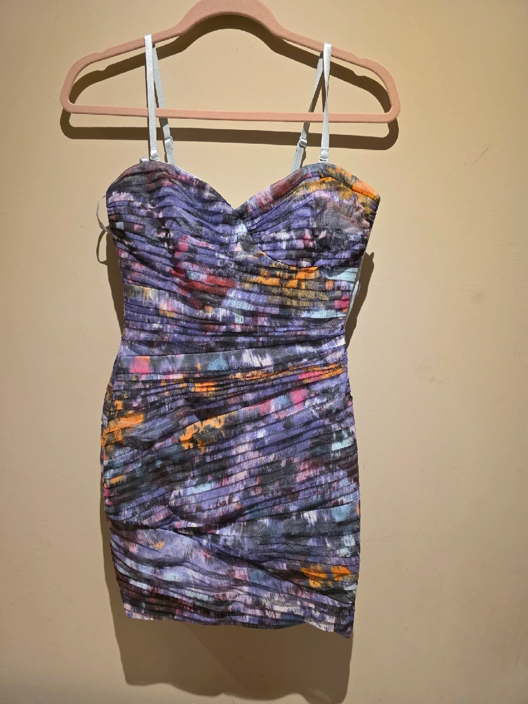 60Selling a BCBGMAXAZRIA dress in size 02. The dress features a colourful pattern with shades of purple, blue, orange, and pink. It has adjustable straps and a flattering silhouette. Perfect for a night out or special occasion!