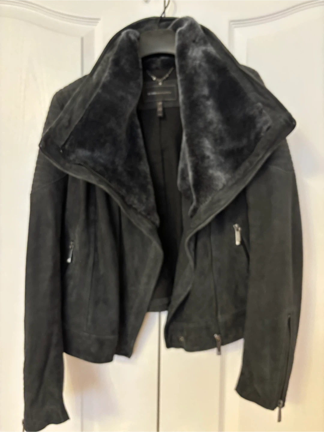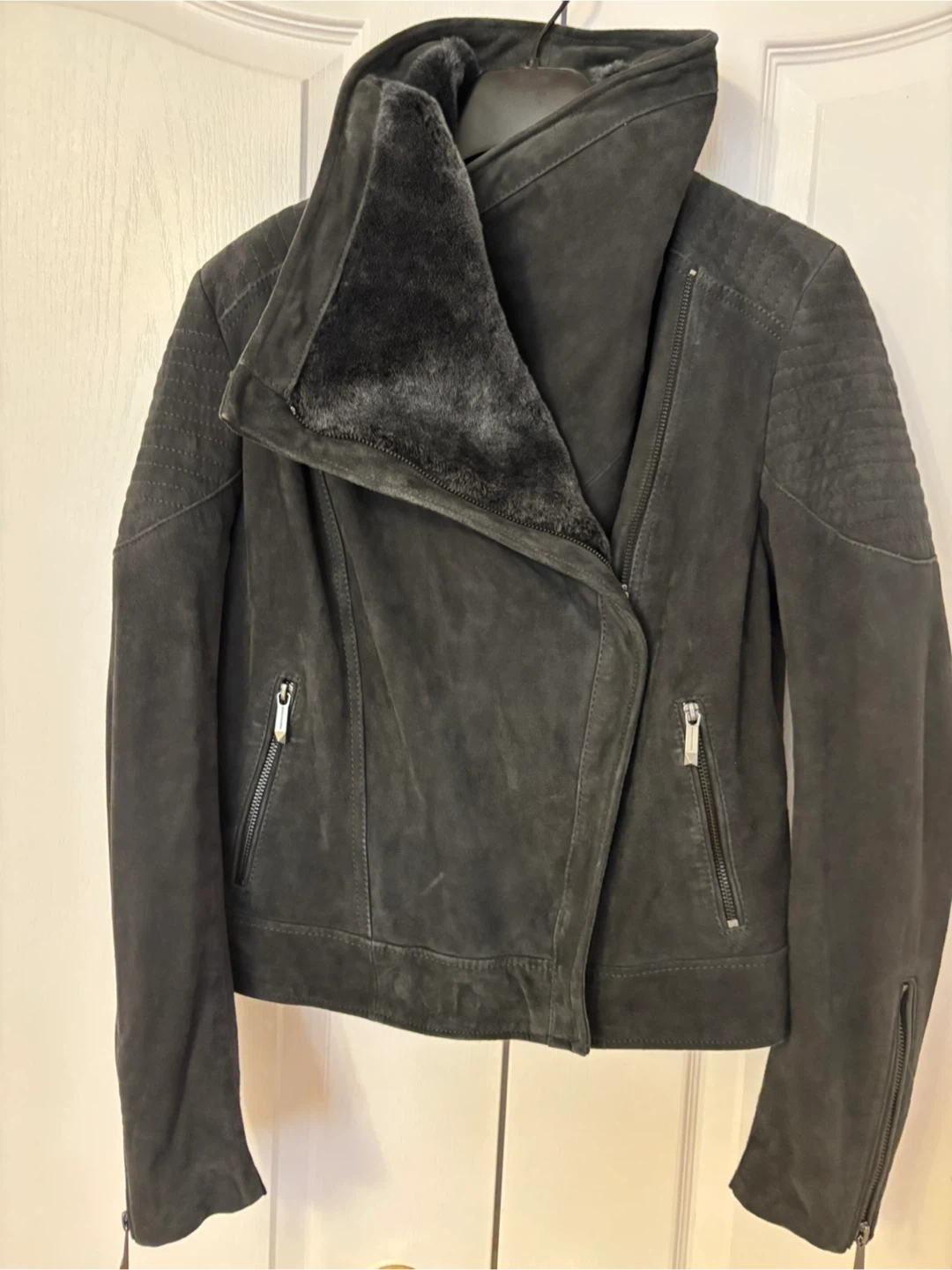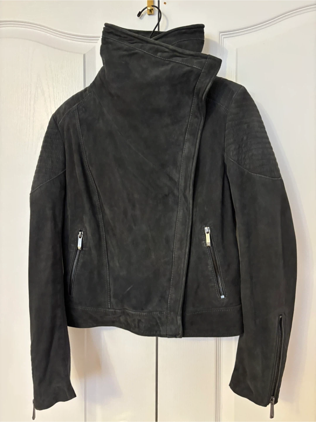 21Selling a stylish BCBGMAXAZRIA steel grey suede jacket in size M/M. It features a unique asymmetrical design and is in great condition. Perfect for adding a touch of edgy sophistication to your wardrobe!