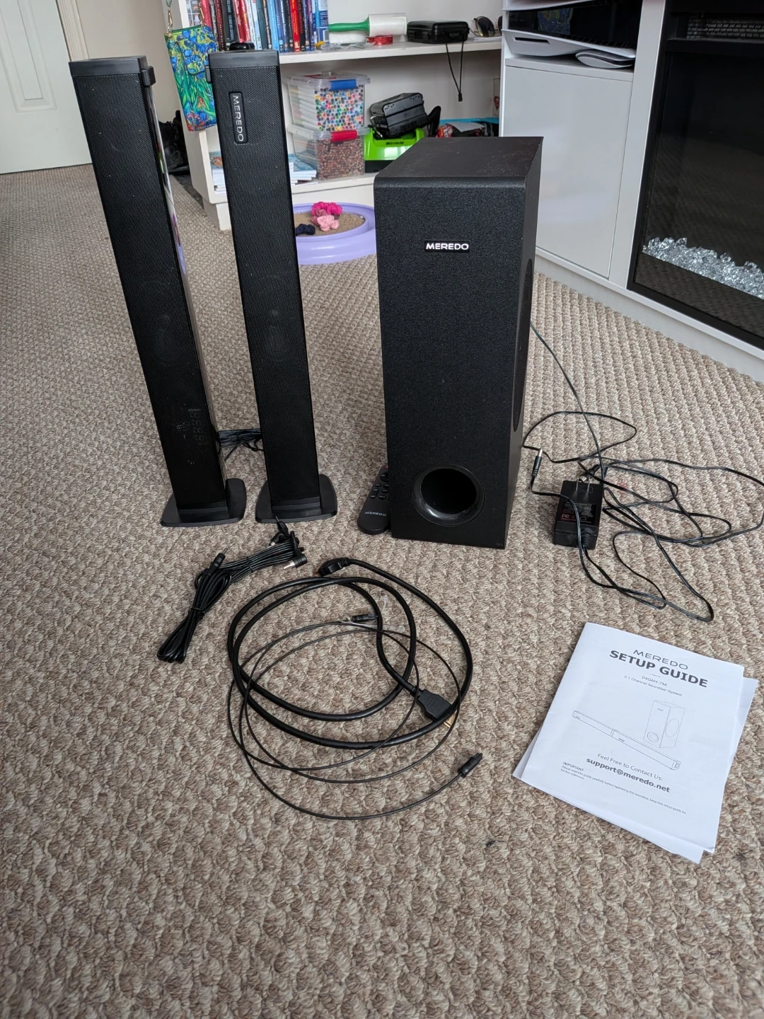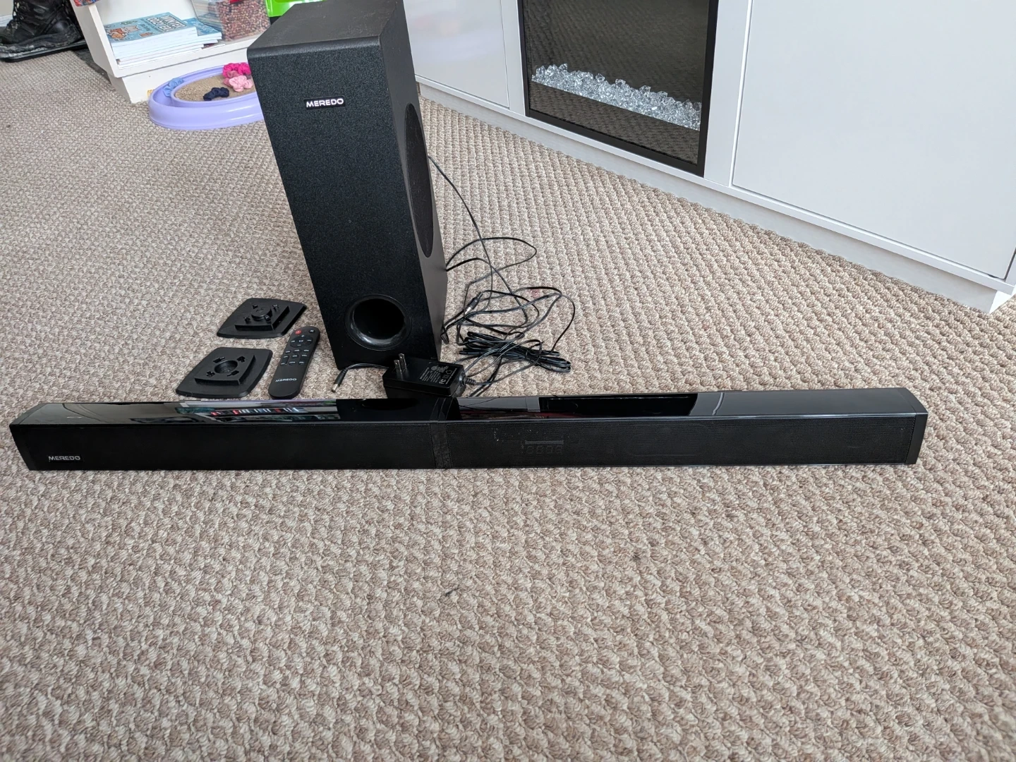 This Meredo sound system includes a soundbar, subwoofer, and two tower speakers. It comes with a remote control, power adapter, and a setup guide. Everything needed for enhanced audio is here!