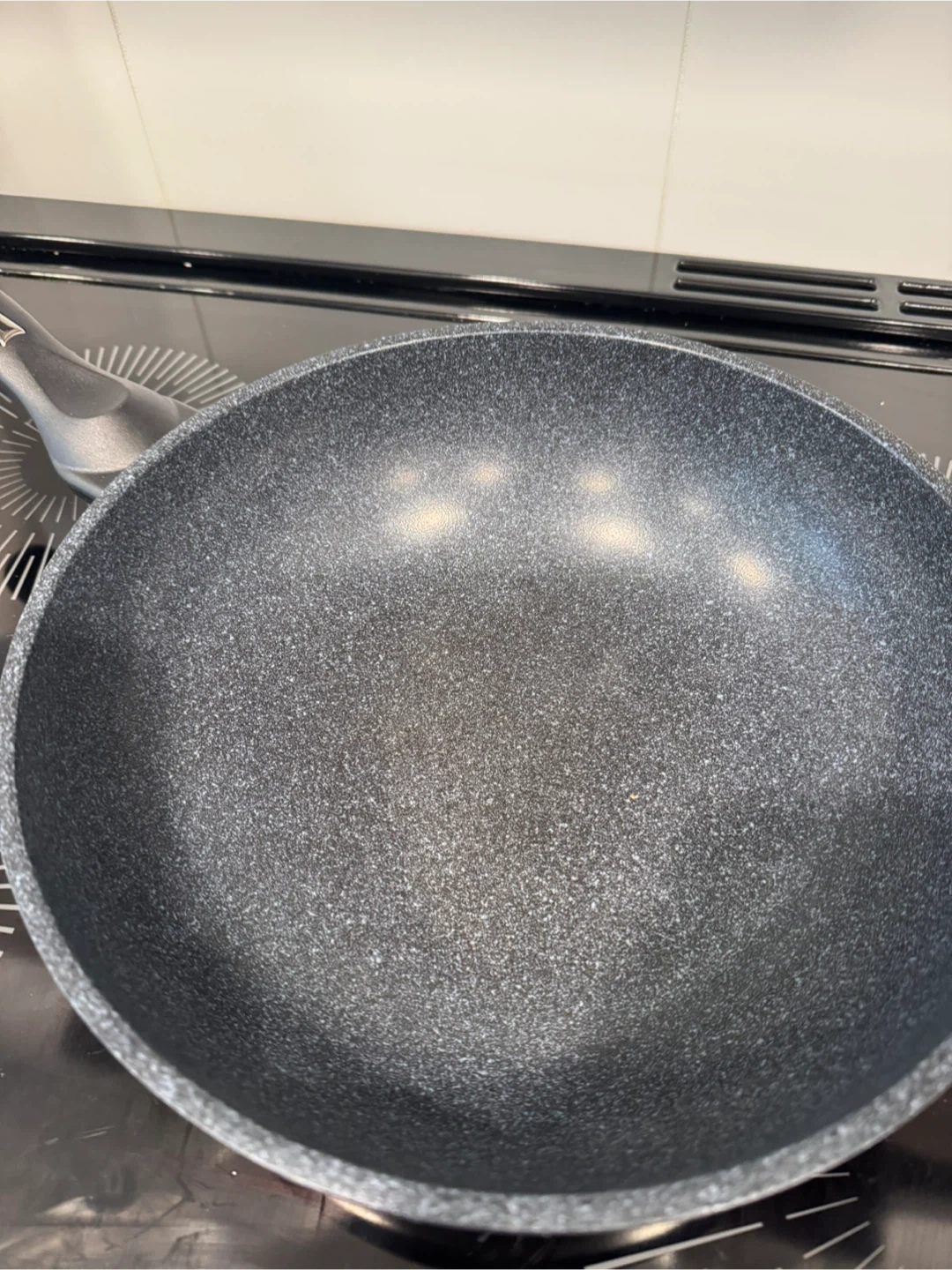 This is a granite non-stick wok pan. It has a comfortable handle and a durable construction. It's suitable for stir-frying and other high-heat cooking methods.