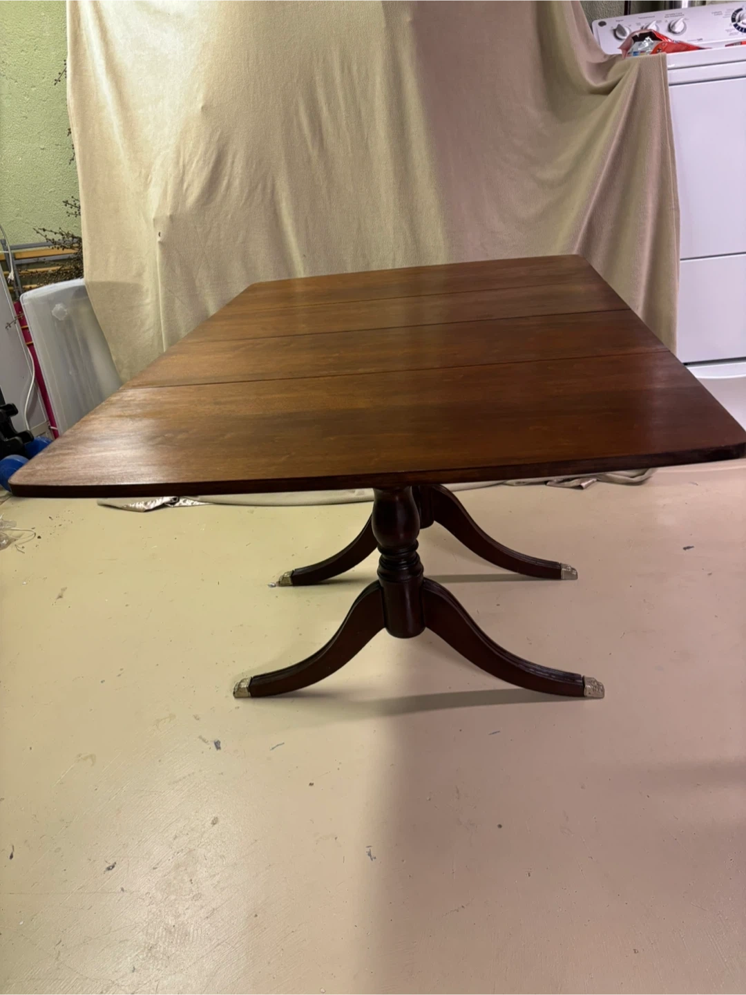 Wooden drop leaf dining table with a rich brown finish. It's a great space-saving piece that can extend for more dining room. The table features a pedestal base with elegant legs.