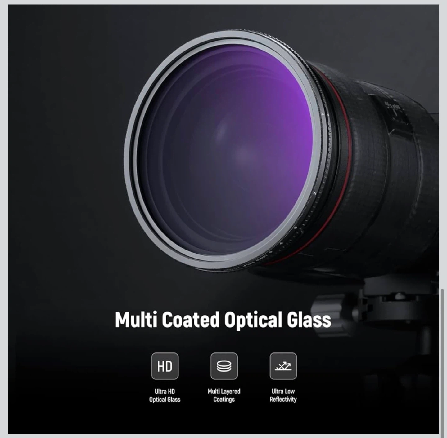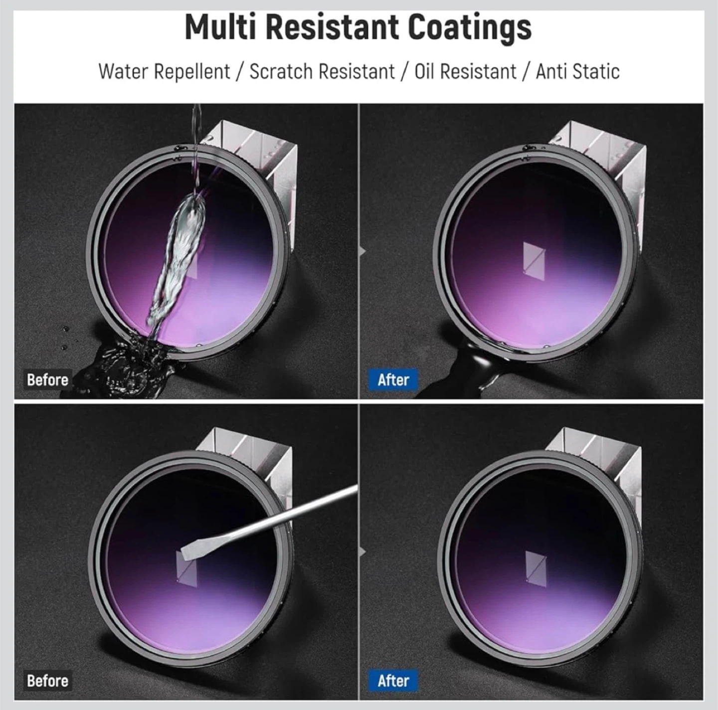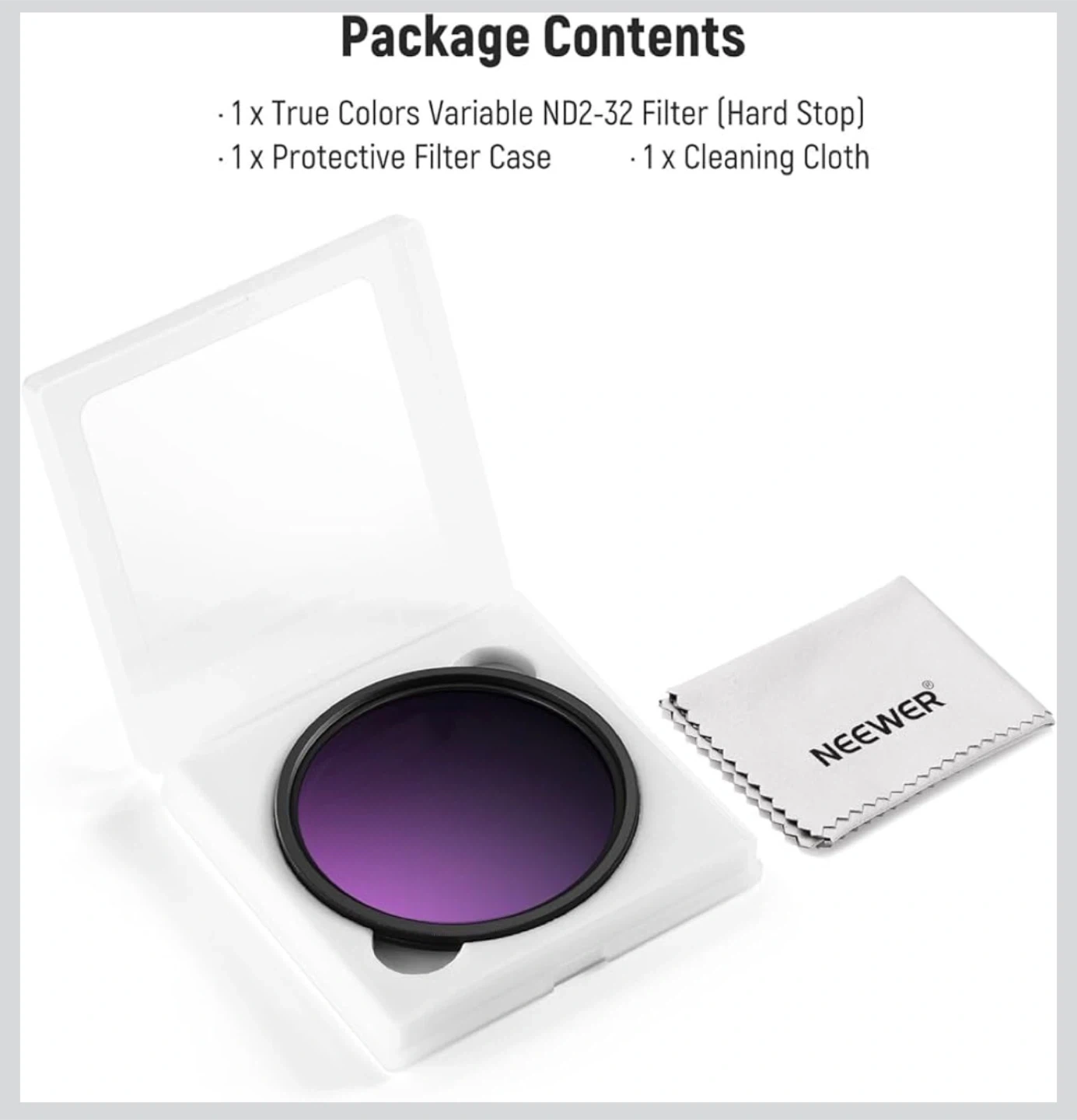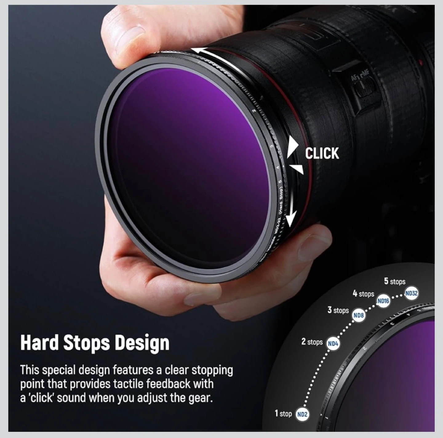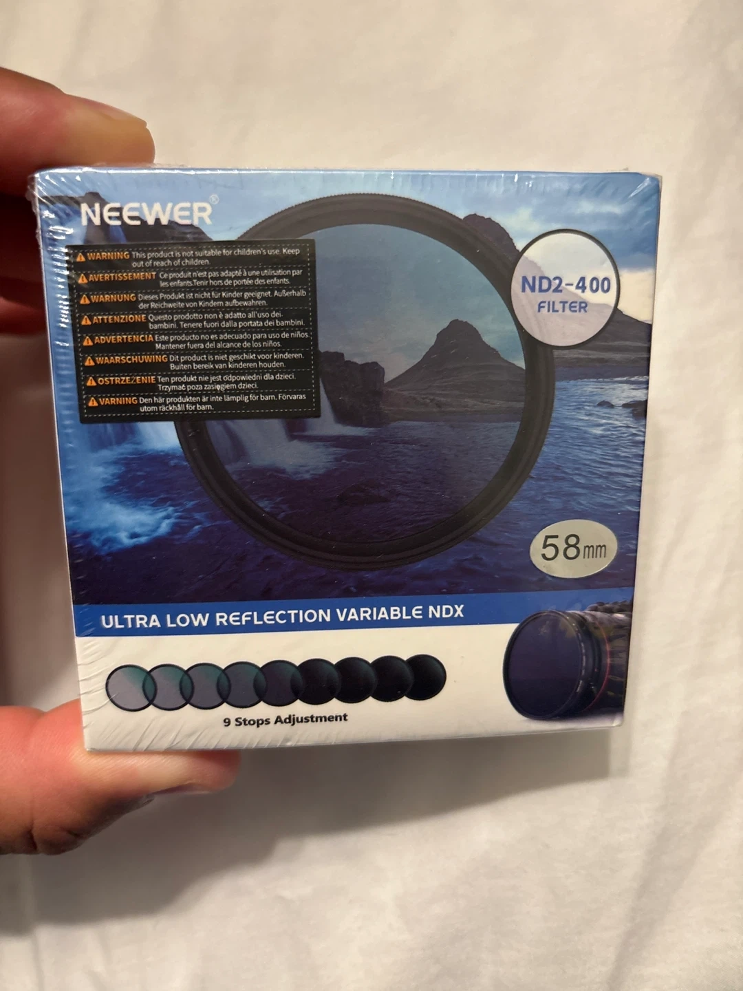 This Neewer 58mm variable ND filter allows for 1-9 stops of light exposure adjustment. It features a hard stop design with a click sound for easy gear adjustment. The filter is built with optical glass, multi-layer coating, and an aluminum frame, offering water, scratch, and fingerprint resistance.