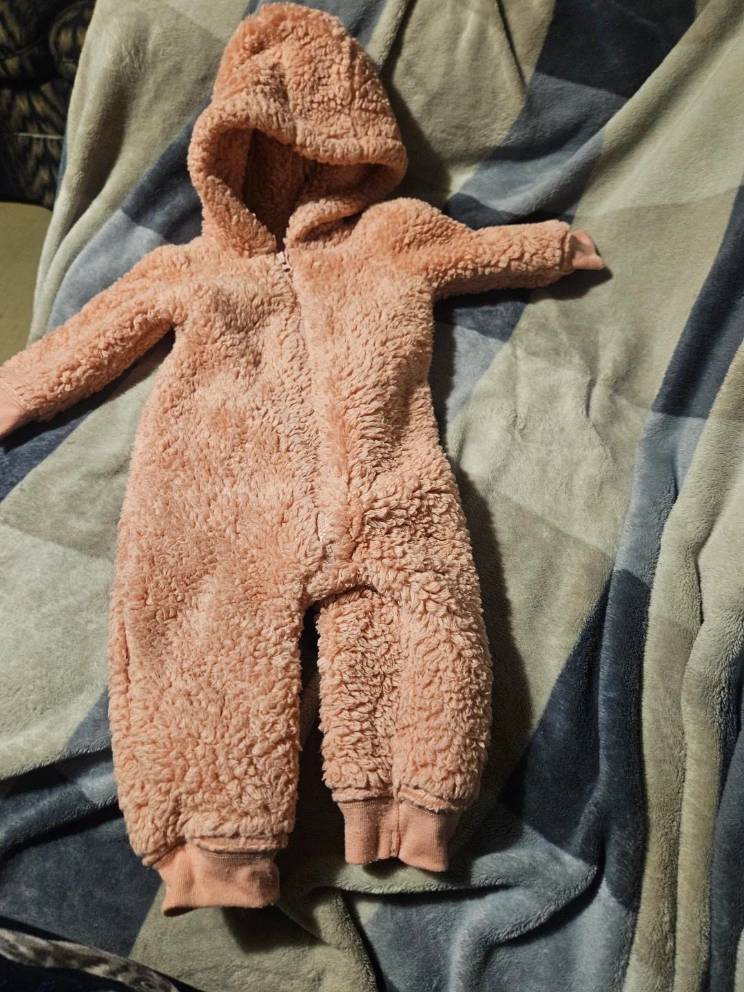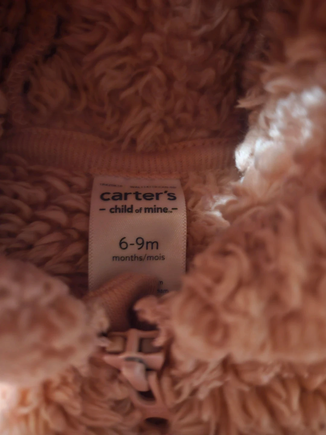 Soft pink fleece snowsuit from Carter's, perfect for keeping little ones cozy. It features a full zip front and a hood. Size 6-9 months. Ideal for cooler weather!