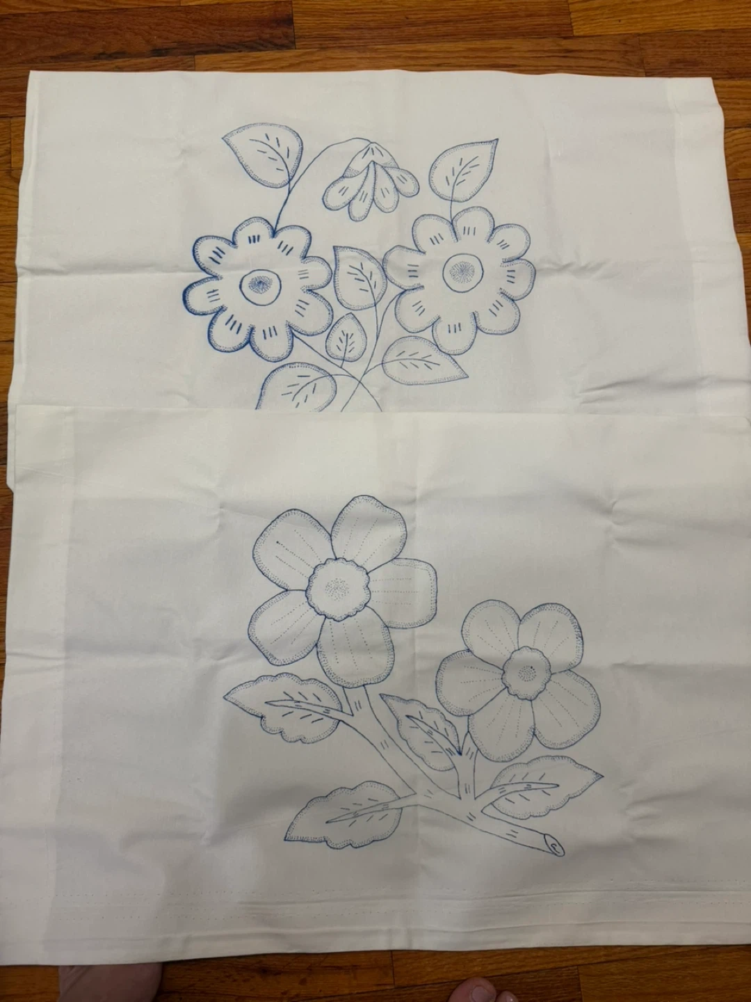 White fabric featuring hand-embroidered blue floral designs. Two distinct floral patterns are present. Cotton material.