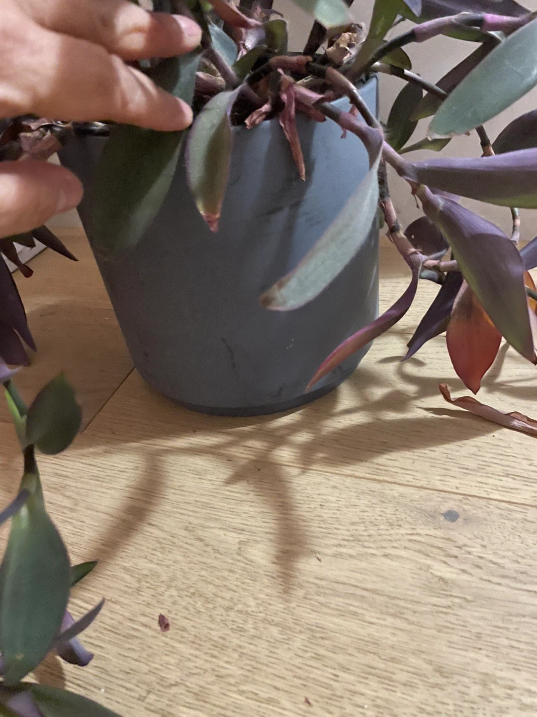 This is a healthy Purple Heart plant in a dark grey ceramic pot. It's a trailing plant with lovely purple and green foliage. It's ready for a new home!