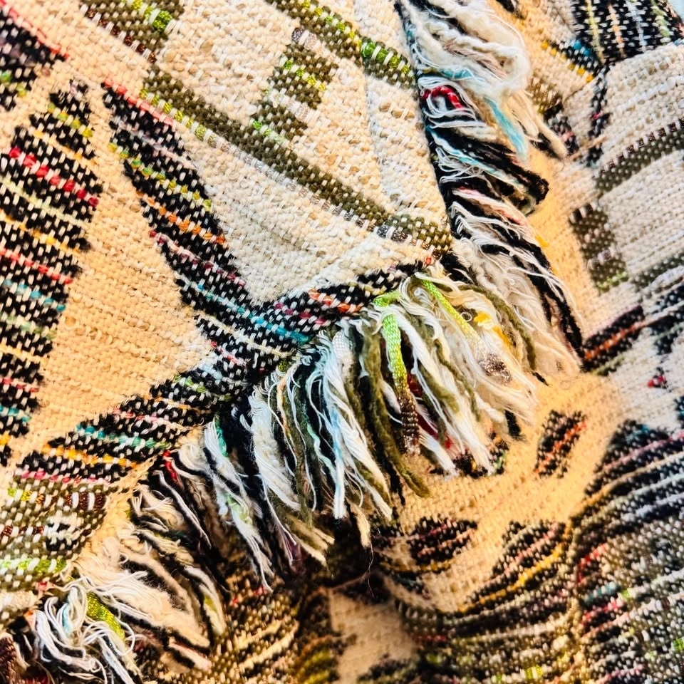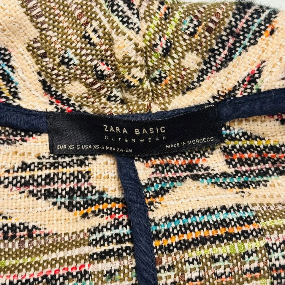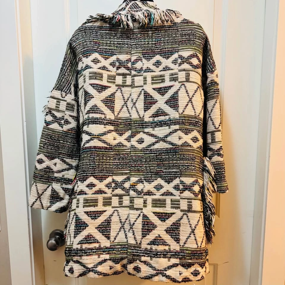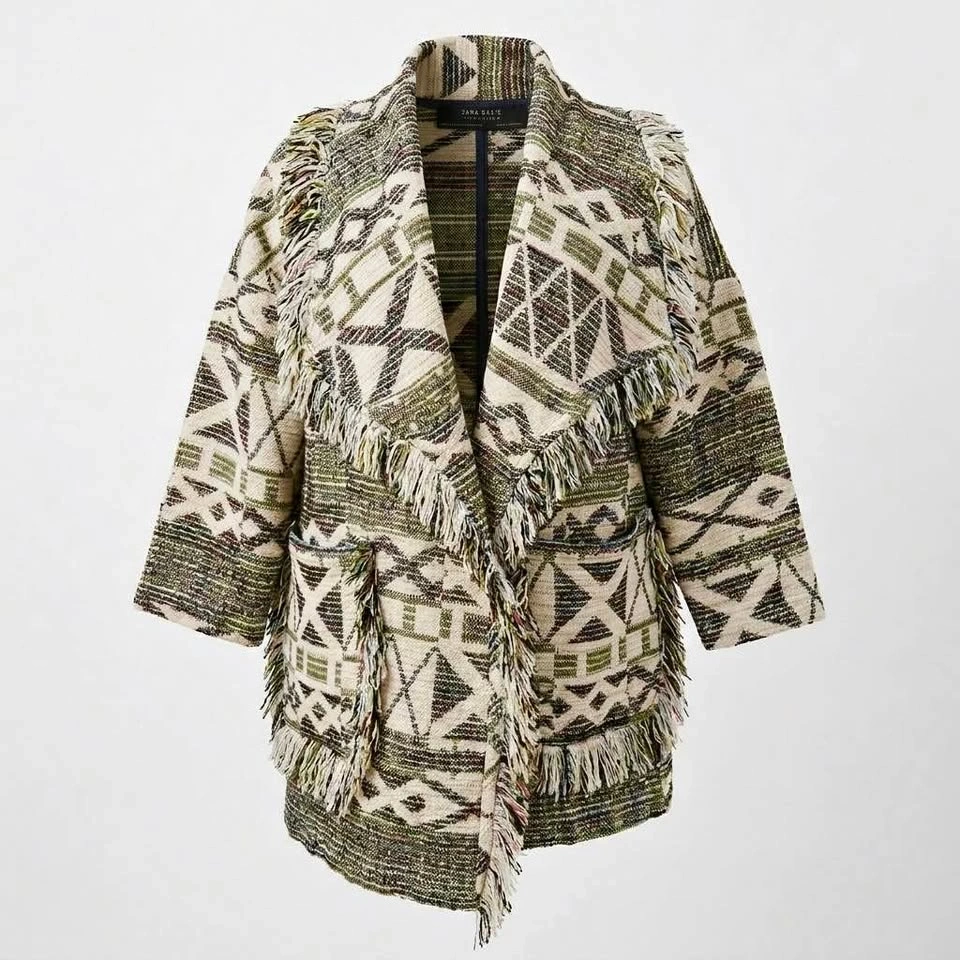 Elevate your layer game with this stunning Zara Basic fringe cardigan. Featuring a heavy-weight jacquard knit with a bold tribal geometric pattern, this piece blends the comfort of a sweater with the structure of a light jacket. The multi-texture weave includes chevron and diamond motifs in a versatile earth-tone palette.