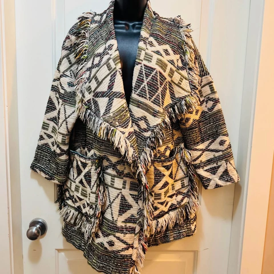 Zara Tribal Geometric Fringe Knit Cardigan Jacket - Oversized Bo