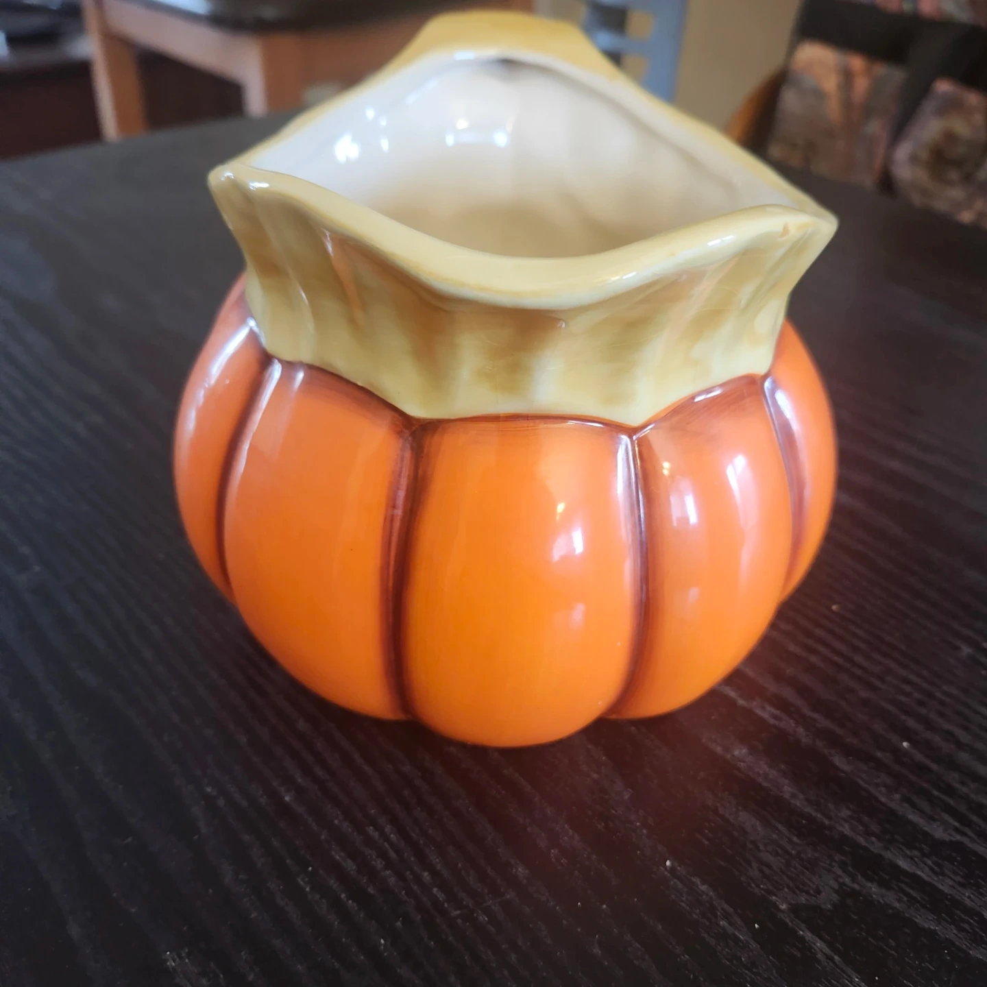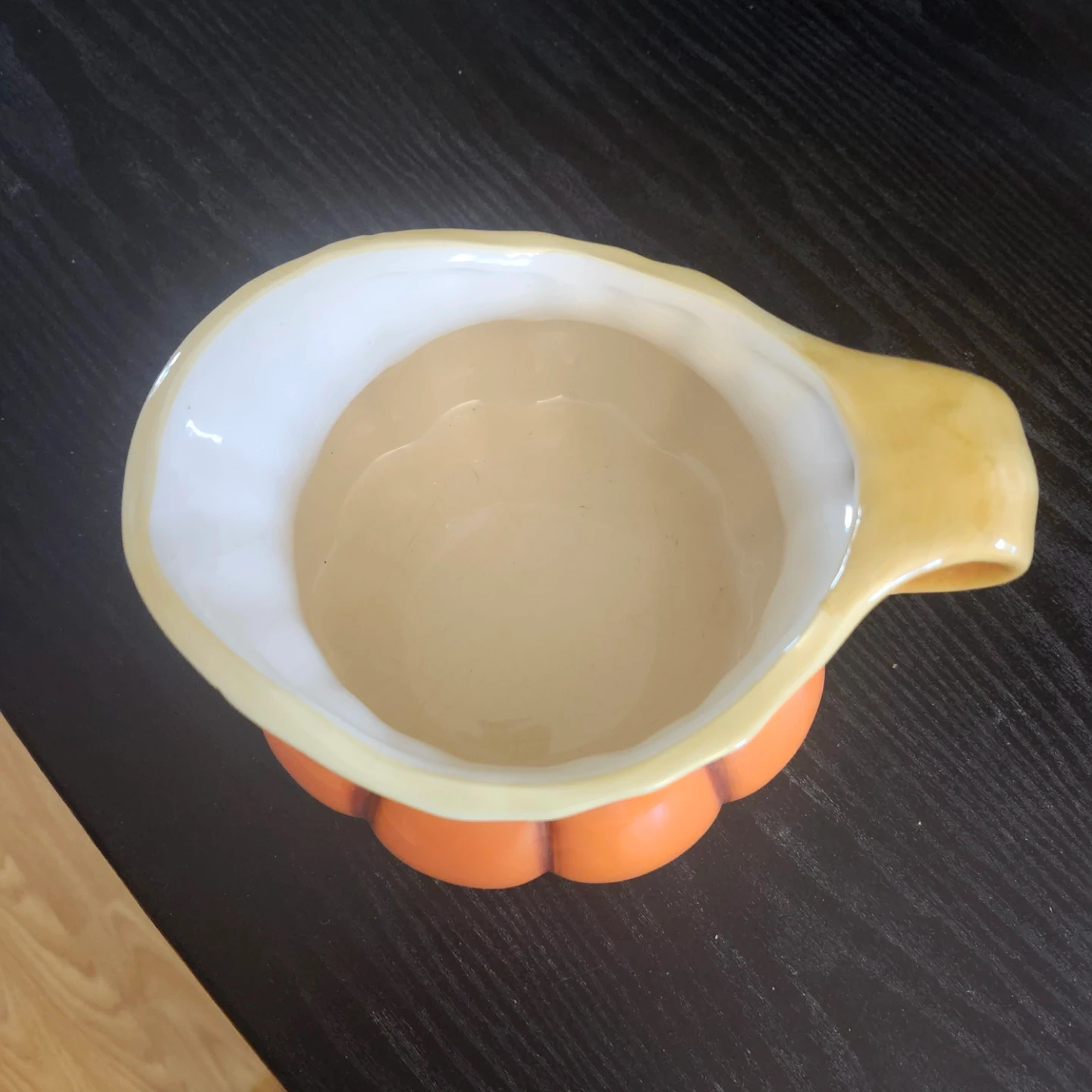 A cute pumpkin-shaped pitcher, perfect for adding a touch of autumn to your table setting! The pitcher is orange with a cream-coloured interior and handle.