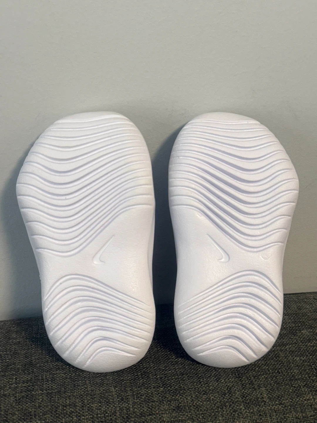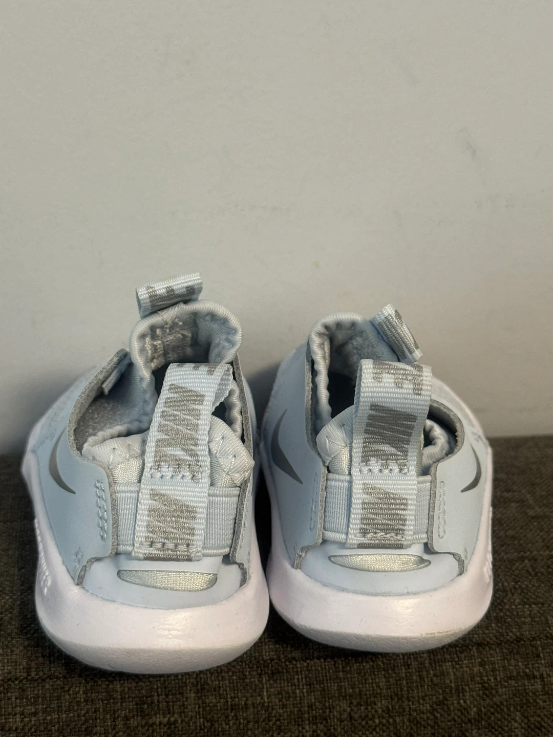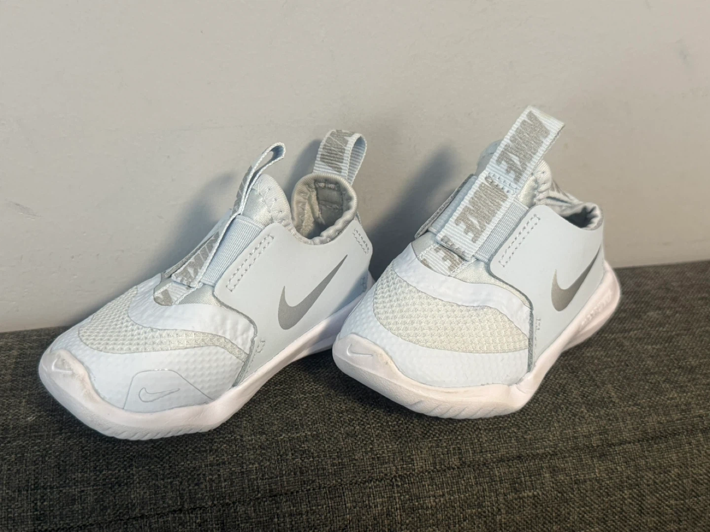 These are light blue Nike Flex Advance toddler shoes. They feature a slip-on design with adjustable straps for a secure fit. They're made with breathable mesh and have a flexible rubber sole for comfort.