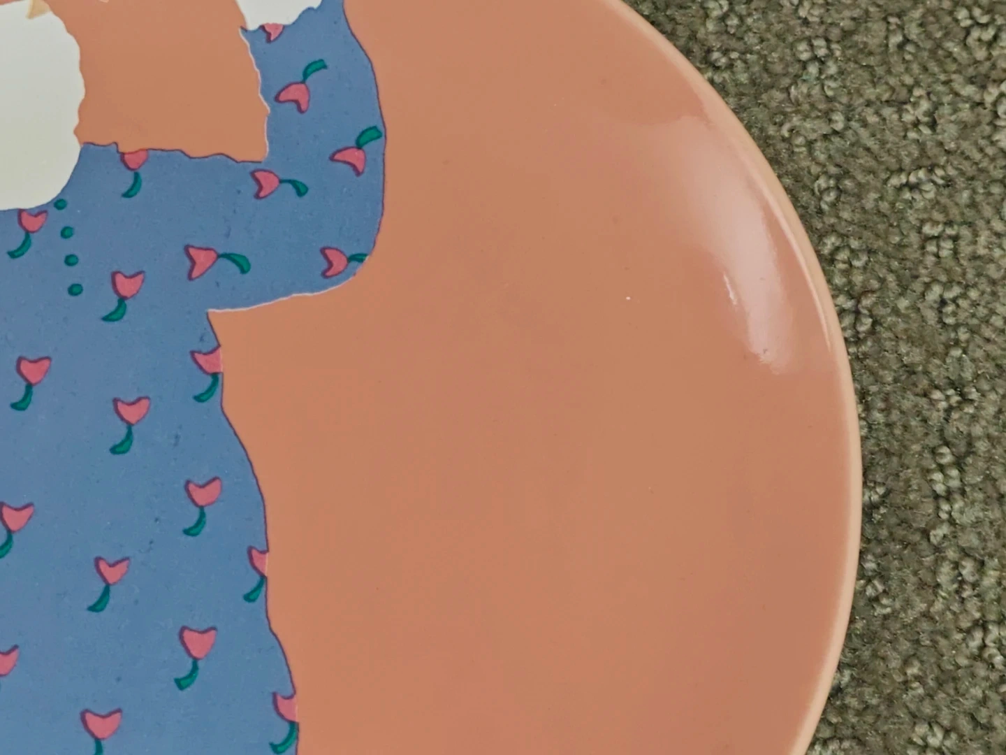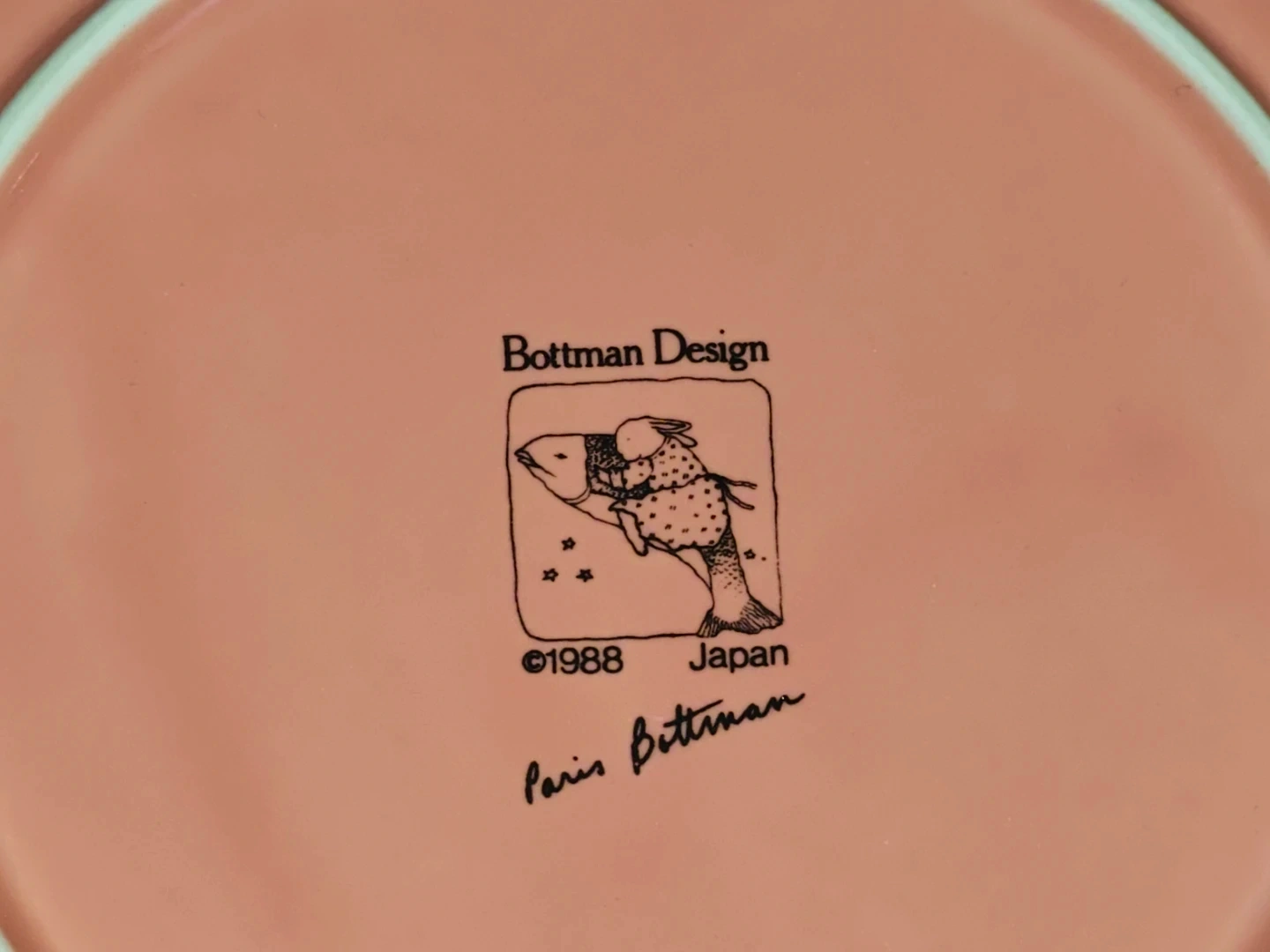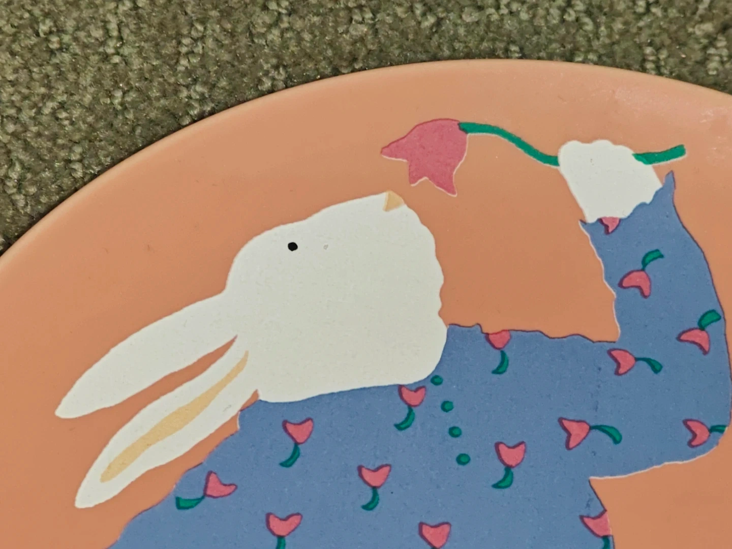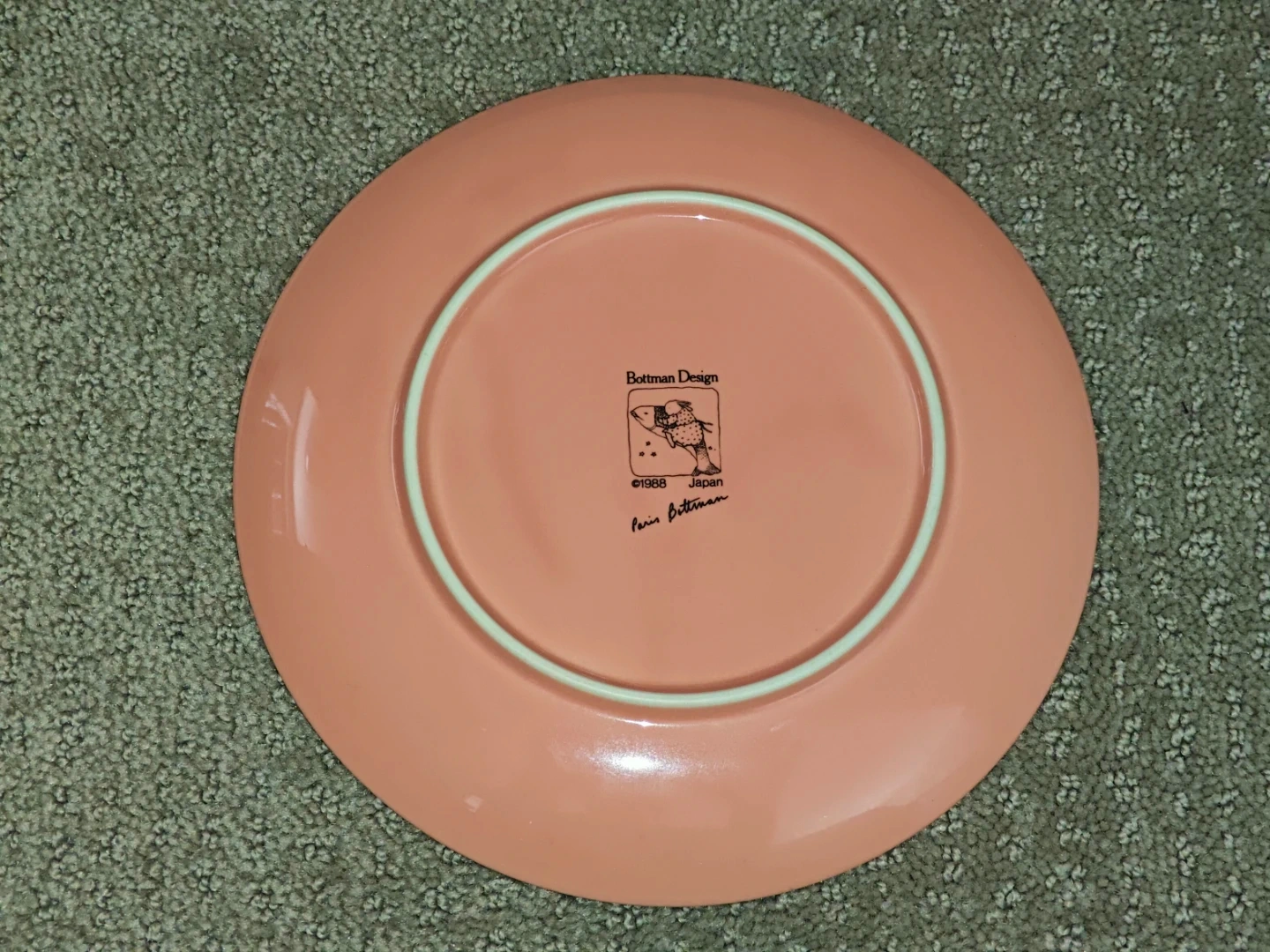 I am selling a Vintage 1988 Paris Bottman Design Plate Rabbit In Dress with Tulip Flower in great condition. This plate’s wonderful graphics features a rabbit smelling a tulip in a blue dress with tulips on a peachy pink glaze background. The bottom is marked Made in Japan. Bottman Designs, 1988. The plate has a glossy look on the plate.
