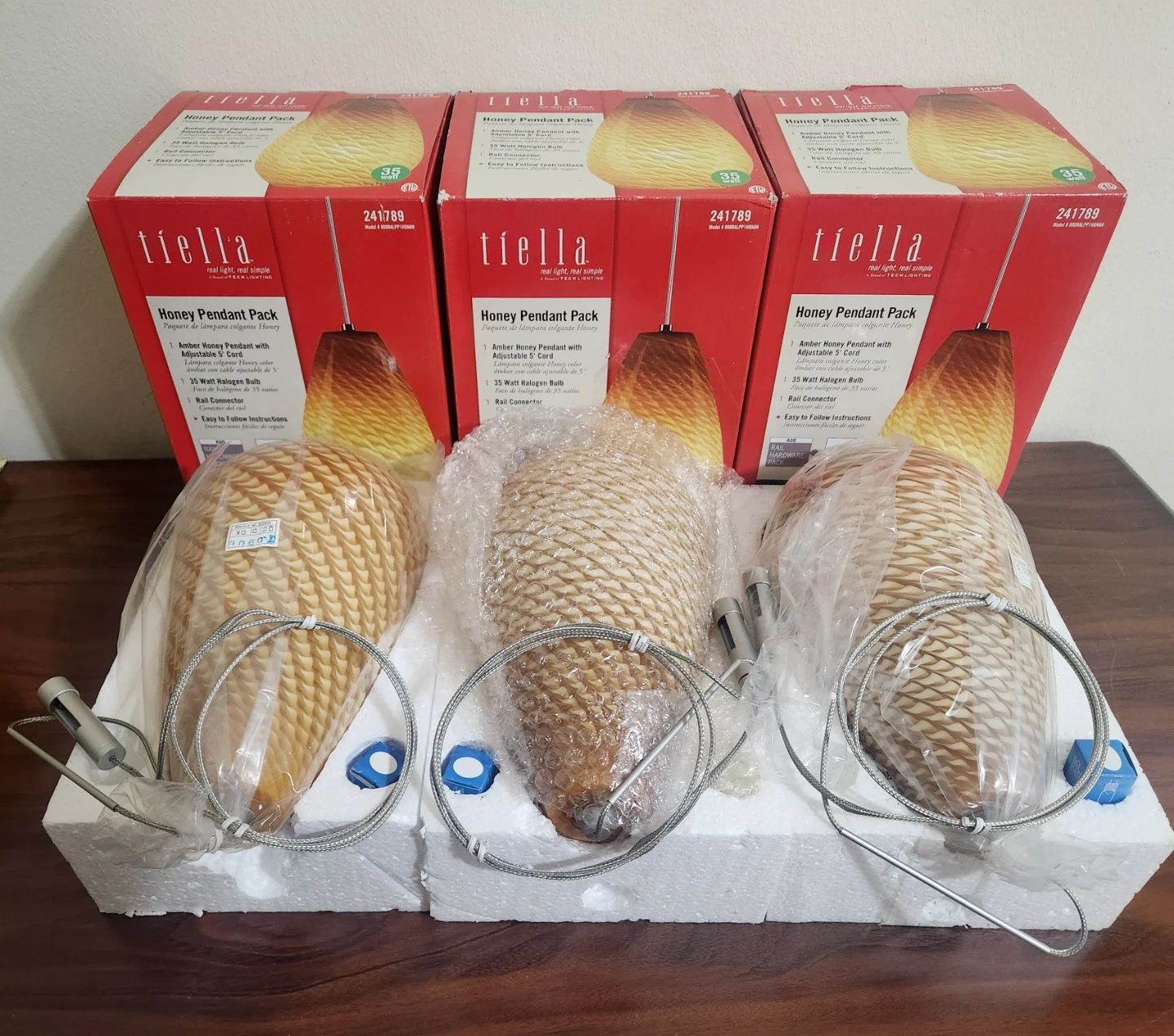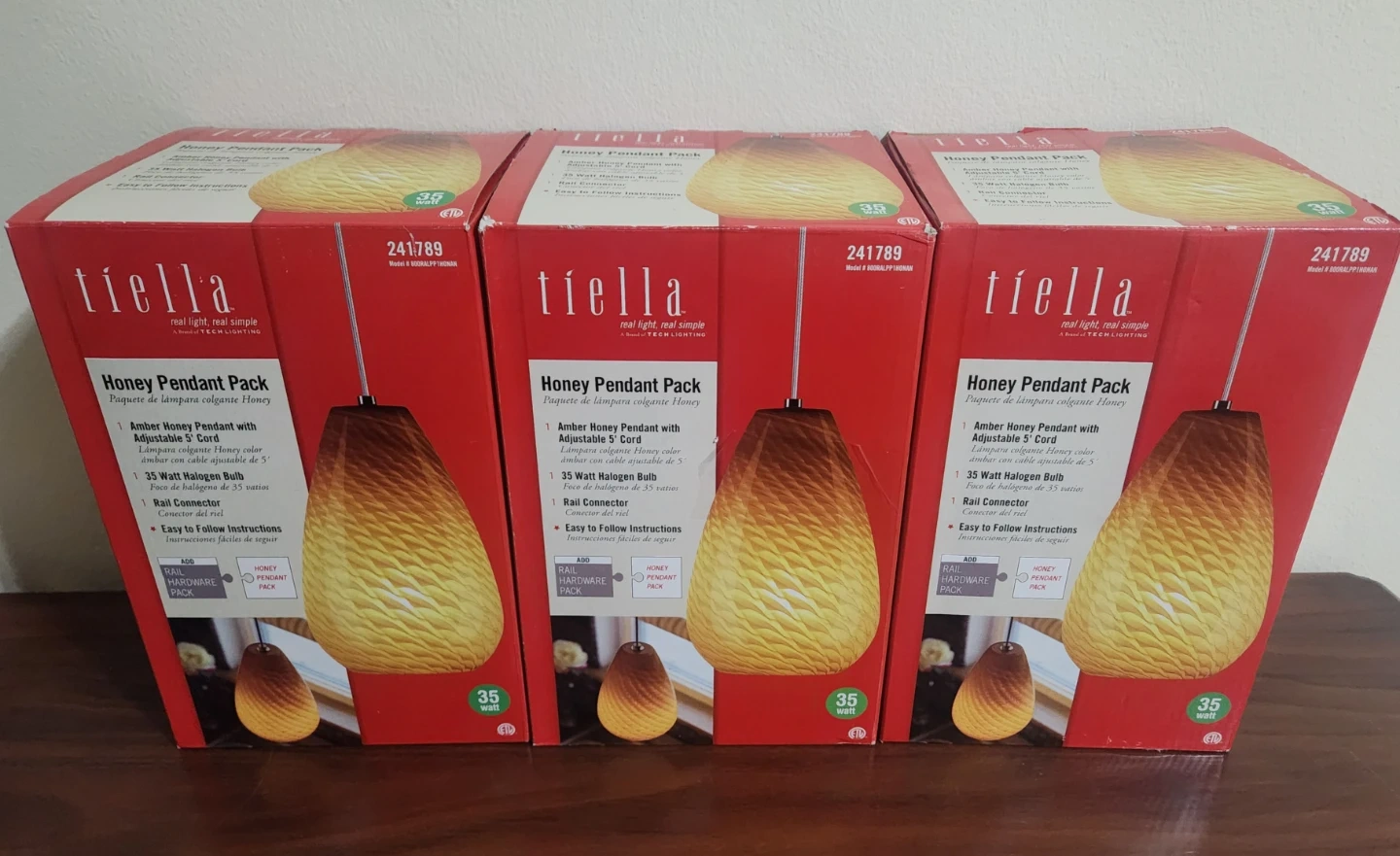 I'm selling a set of three brand new Tiella Honey Pendant lights! These amber honey pendant lights come with an adjustable 5' cord and a 35-watt halogen bulb. They also include a rail connector and easy-to-follow instructions! The original box is included as well