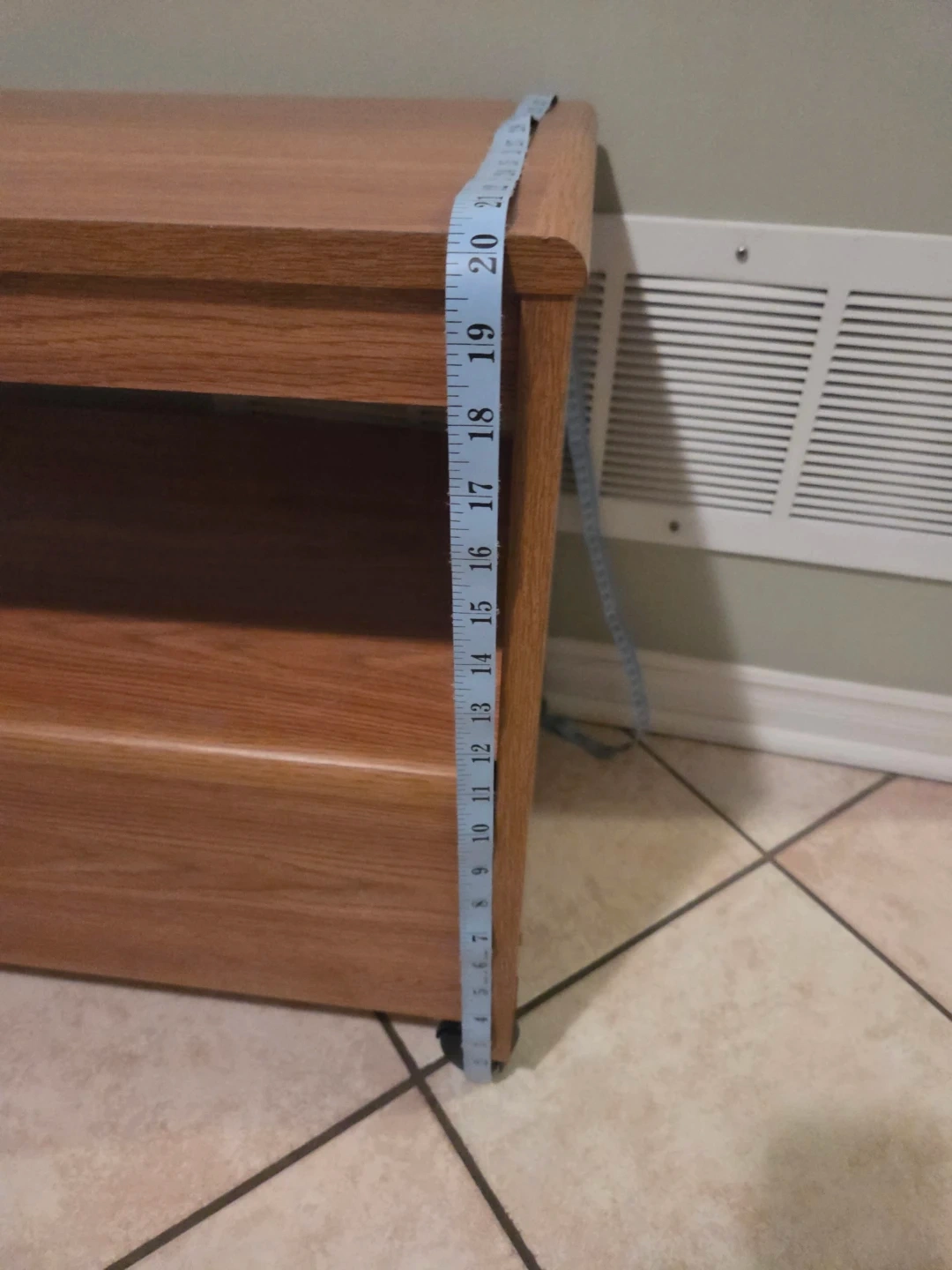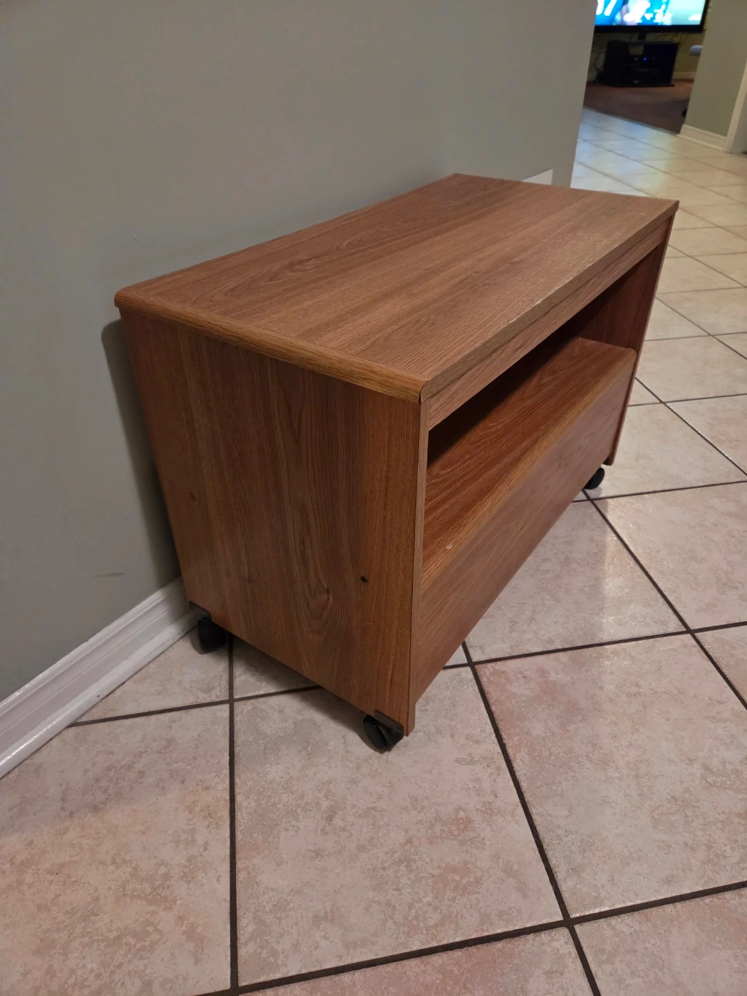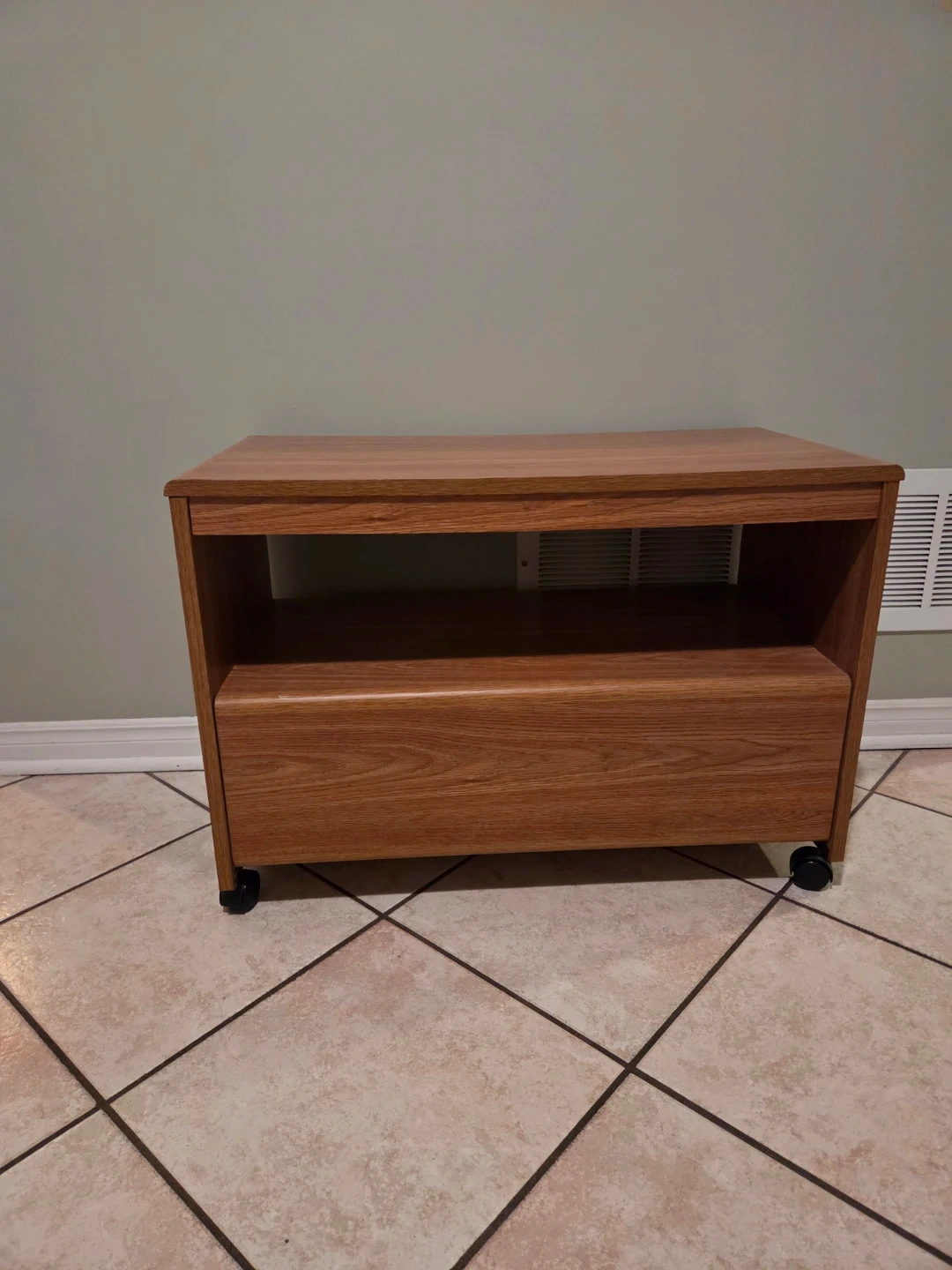 Selling a wooden TV stand. It's in good condition and has wheels for easy moving. The dimensions are approximately 28 inches wide and 20 inches deep and 14 3/4 inches deep. It also features a shelf for storage