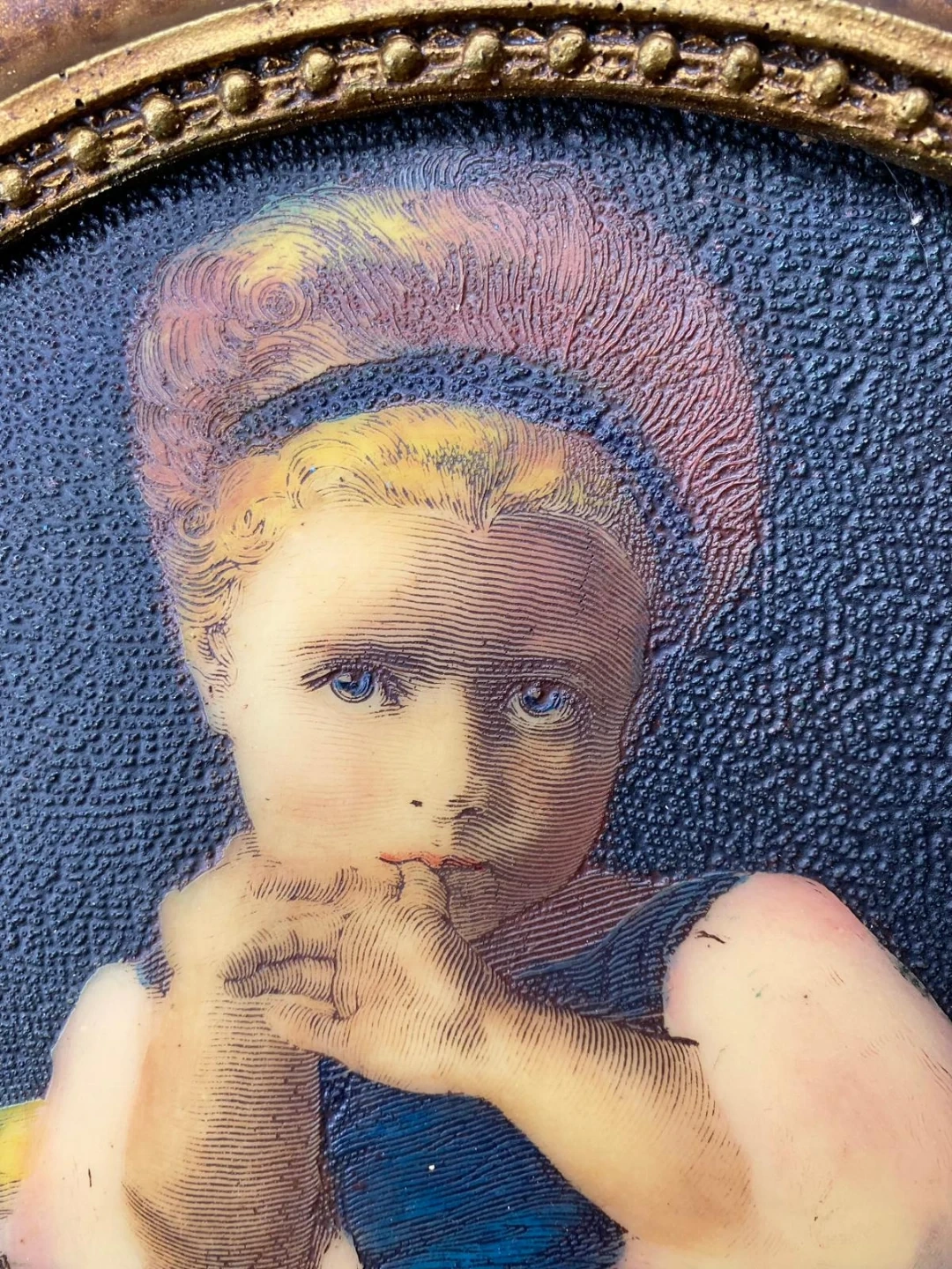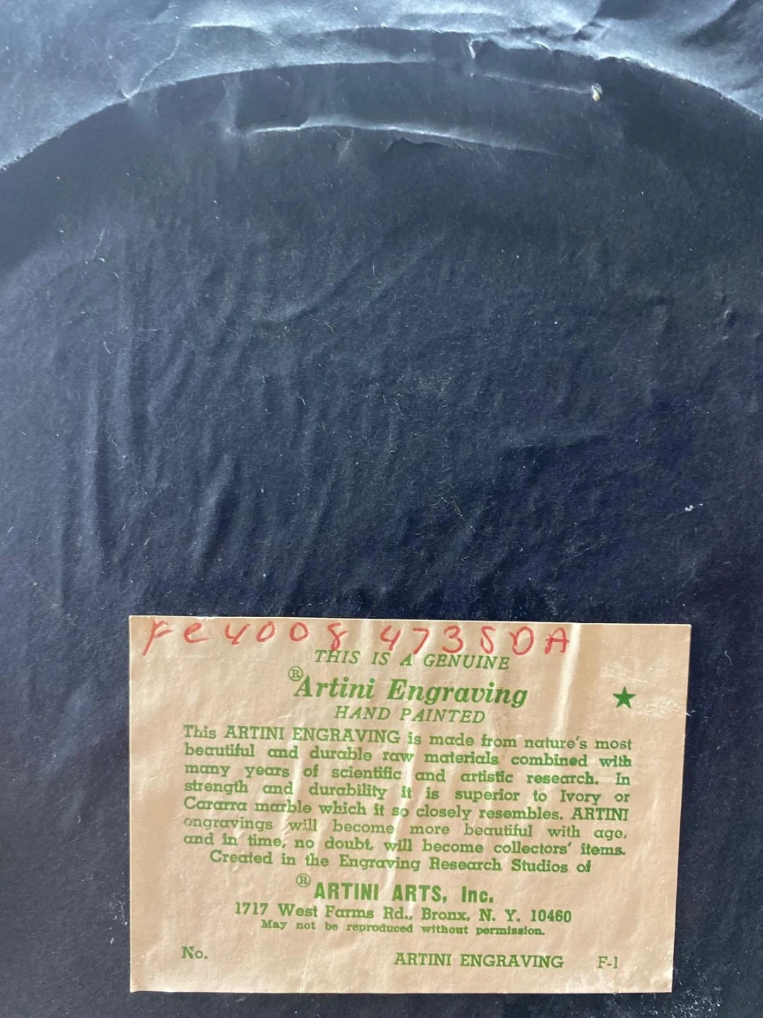 This is a genuine Artini Engraving, hand painted. It's made from nature's most beautiful and durable raw materials combined with many years of scientific and artistic research in strength and durability. According to the back, it is superior to Ivory or Carrara marble, which it so closely resembles. Artini engravings will become more beautiful with age, and in time, no doubt, will become collectors' items. Created in the Engraving Research Studies of Artini Arts, Inc.