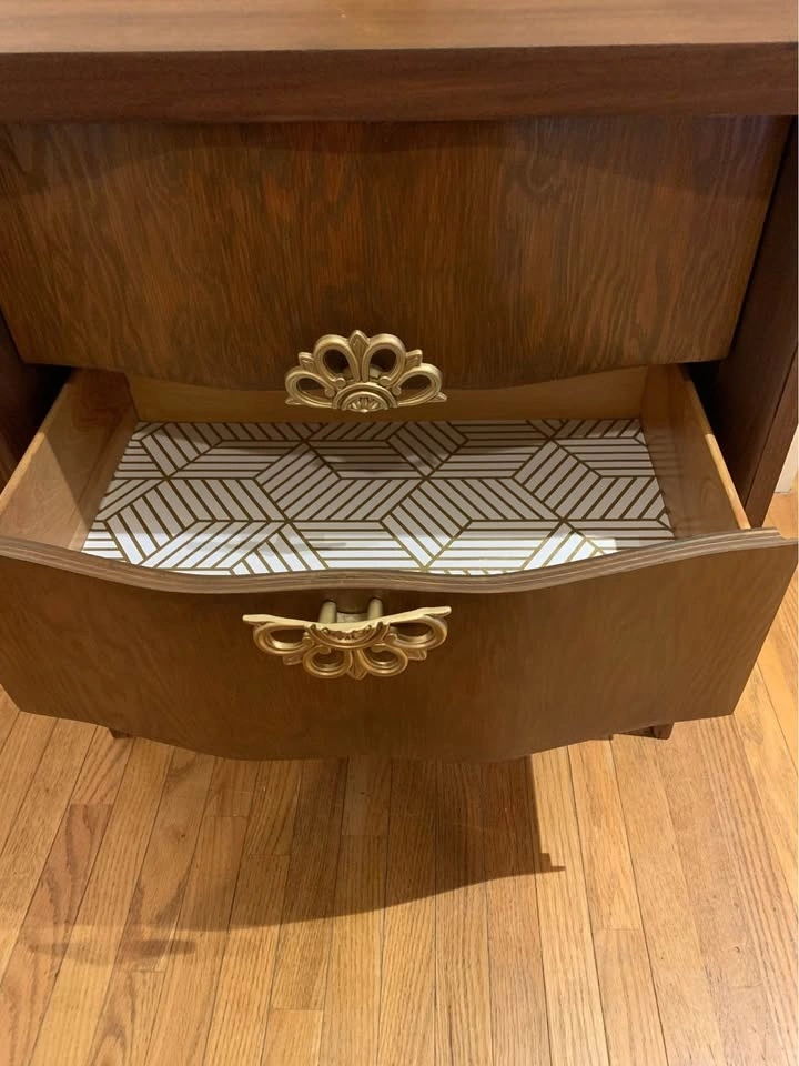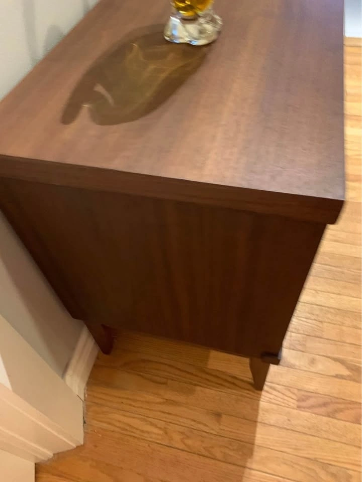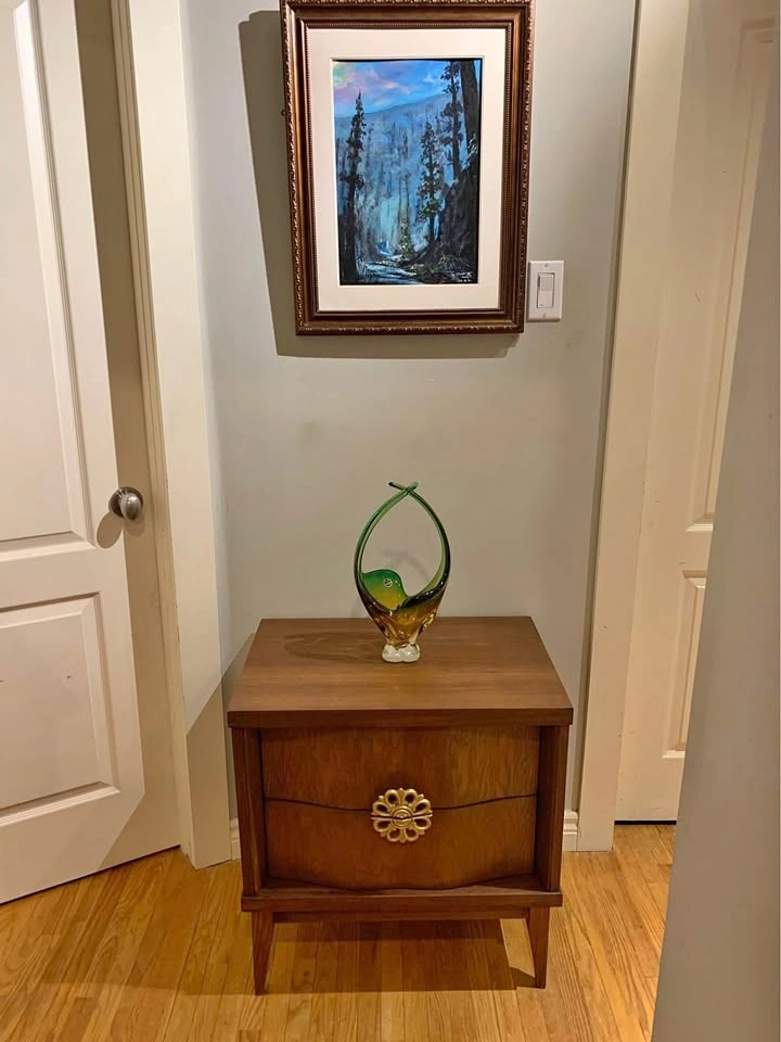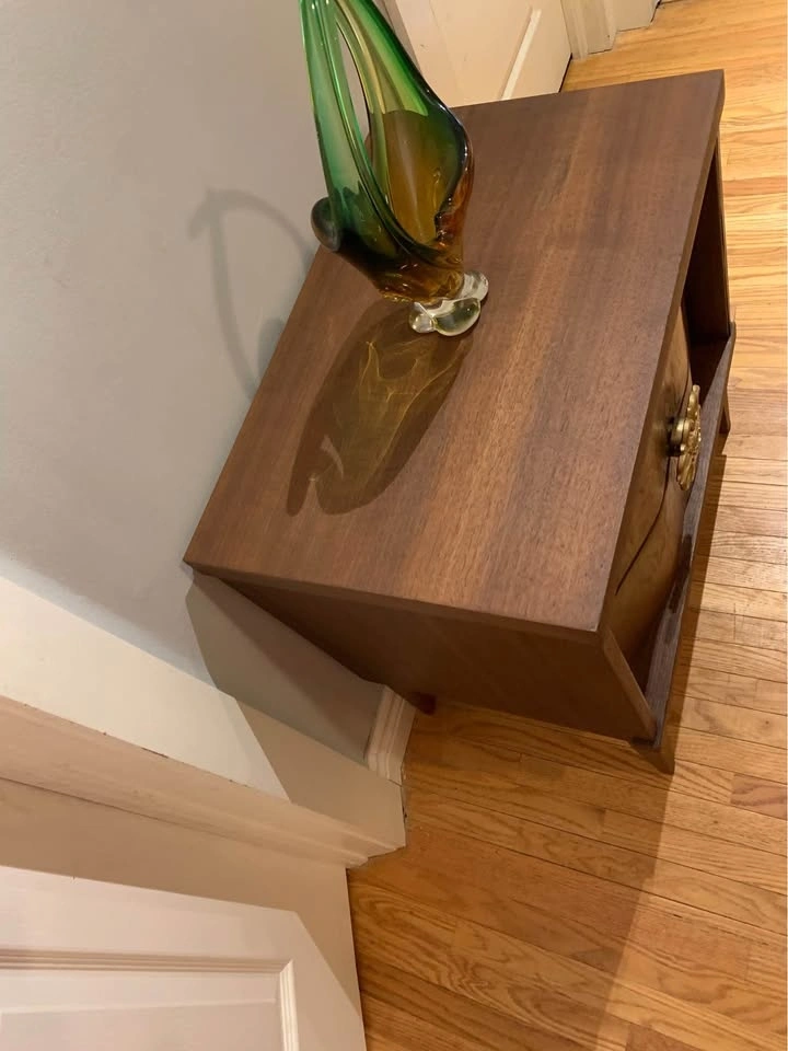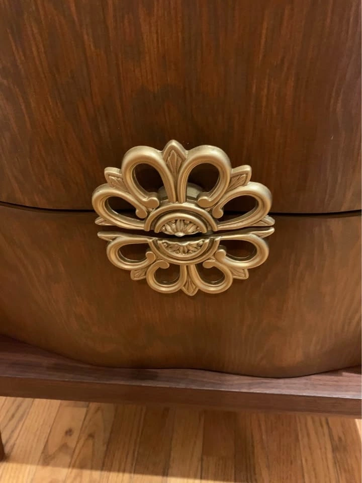 Beautifully refinished classic Mid-Century Modern (MCM) walnut nightstand, likely dating from the 1950s or 60s. It features characteristic MCM design elements, including tapered "stiletto" legs and a distinctive bowed drawer front adorned with an ornate brass floral-sunburst pull that spans both drawers. Top coated for full protection. Dimensions: Width-24”, Height-25”, Depth-16”. Pick up in Brampton L6T 2S6.
