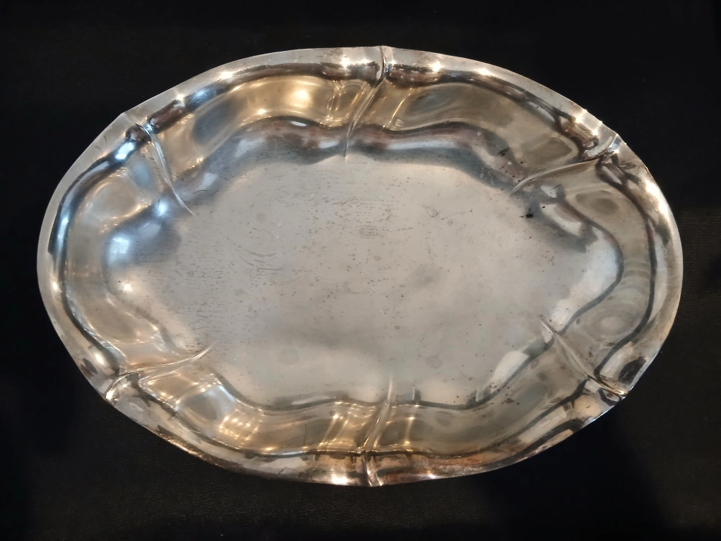 A lovely vintage serving tray with a scalloped edge. It's made of silver-plated metal and has four small ball feet. Perfect for serving appetizers or desserts!