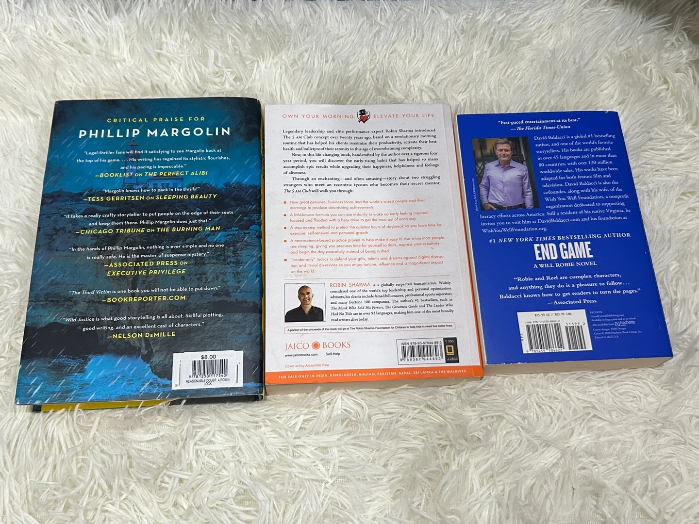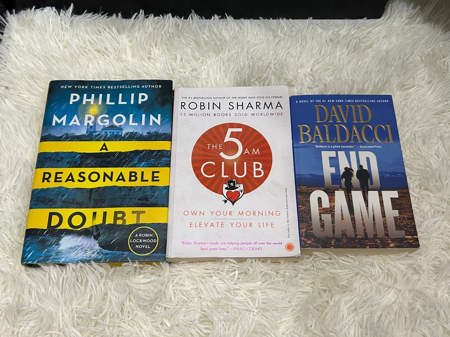 Lot of three paperback books including 'A Reasonable Doubt' by Phillip Margolin, 'The 5 AM Club' by Robin Sharma, and 'End Game' by David Baldacci. These novels cover mystery, self-help, and thriller genres. Each $4, 3 together $10