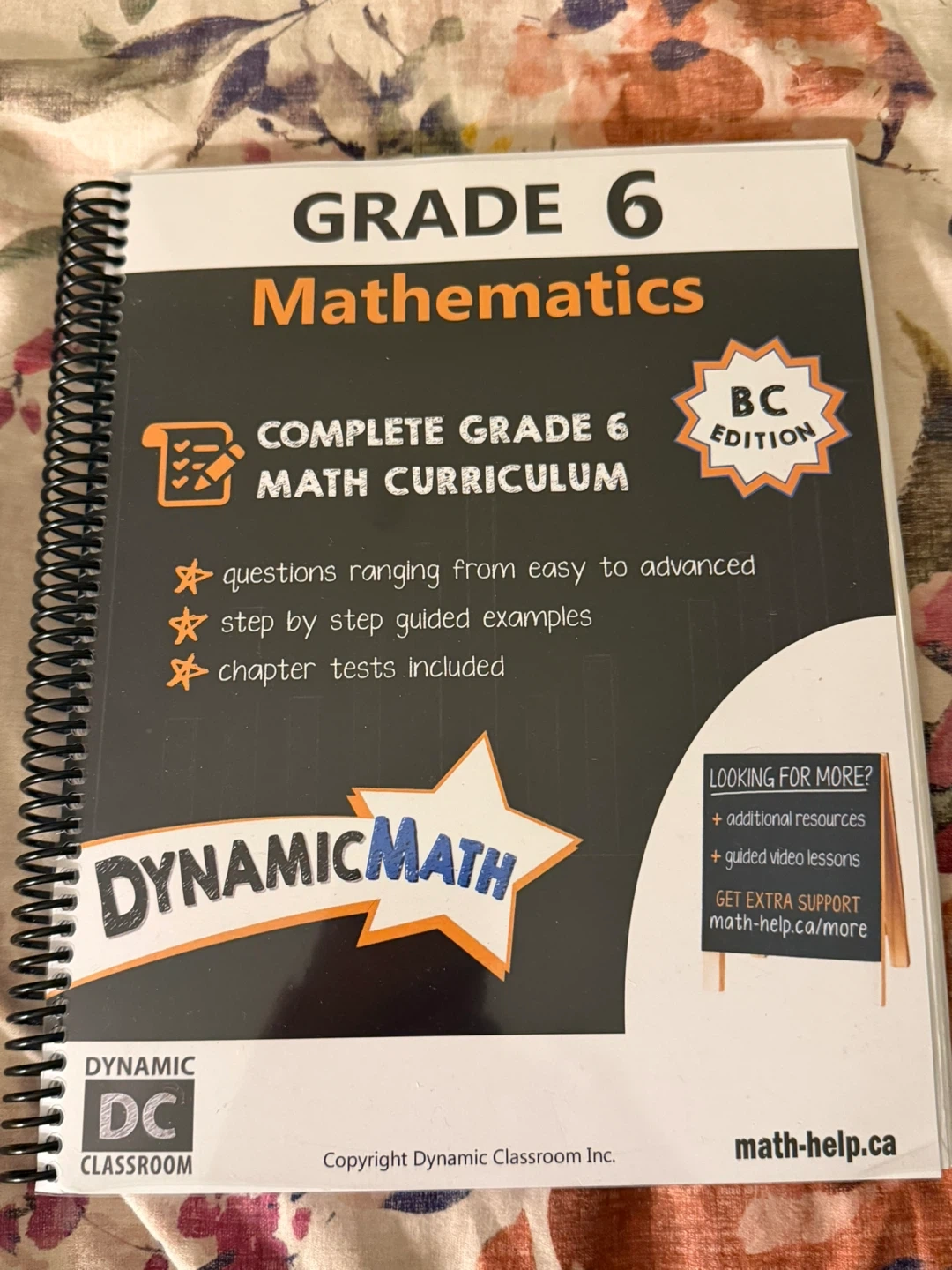 This DynamicMath book is a complete Grade 6 math curriculum for BC Edition. It includes questions from easy to advanced, step-by-step guided examples, and chapter tests. This resource is useful for students needing extra math practice or support throughout the school year.