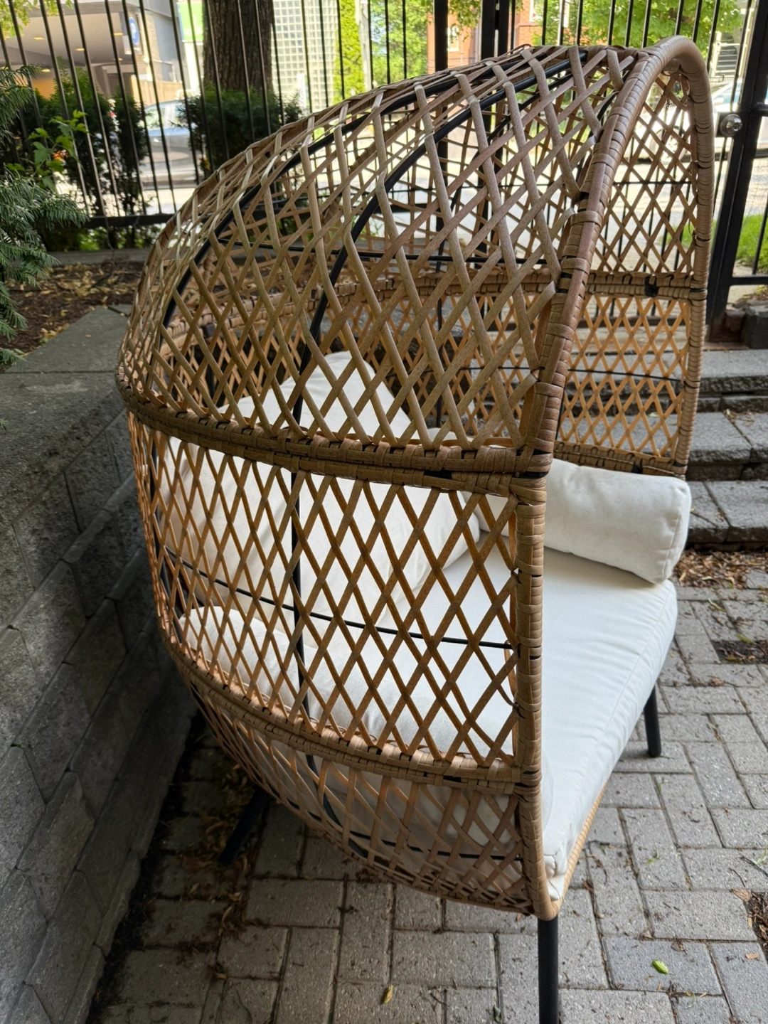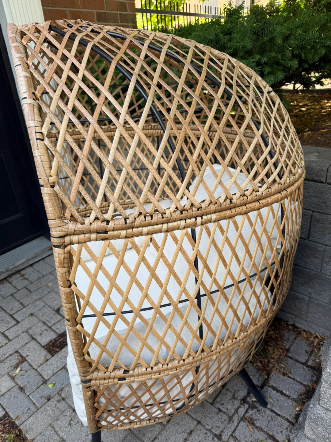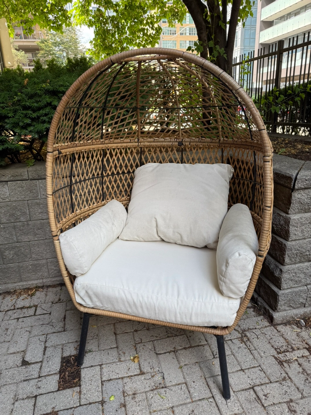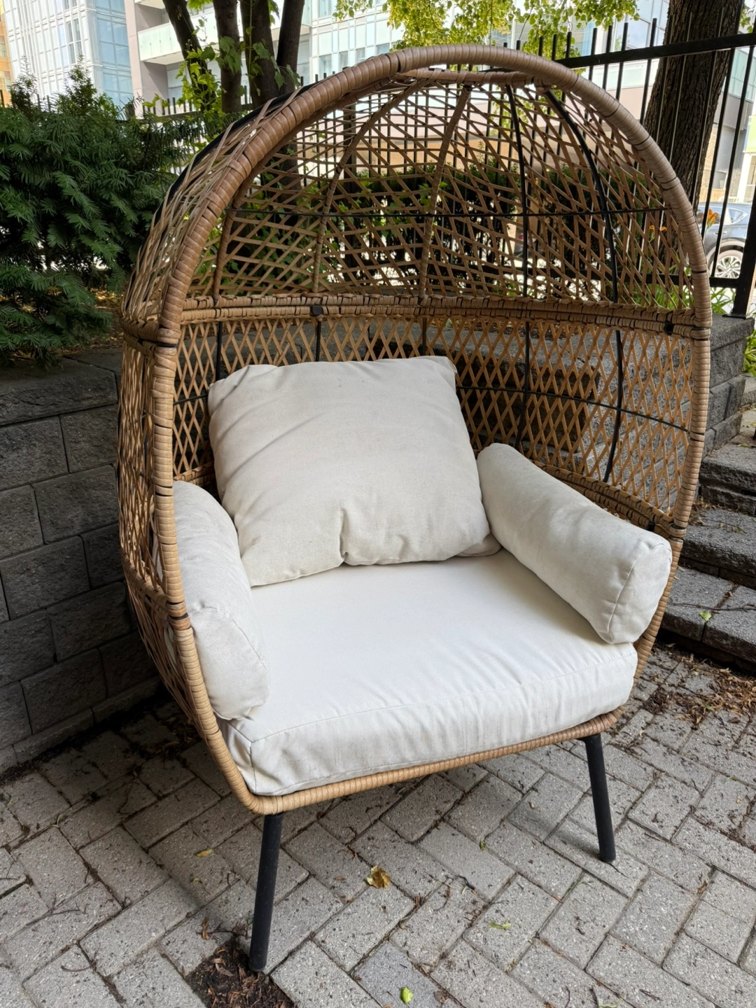 Selling a wicker egg chair that would look great in any space! The frame is a natural wicker colour with black metal legs. The frame is in great condition and ready for a new home! The cushions are a bit dirty for being exposed to the weather. Can be used or new ones can be bought easily on Amazon or Wayfair.