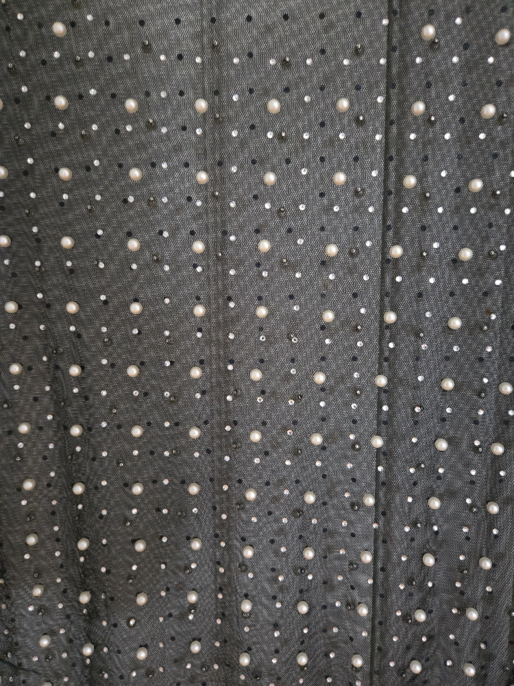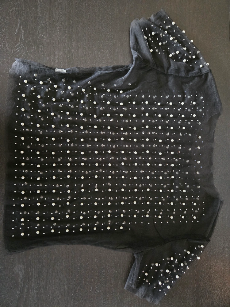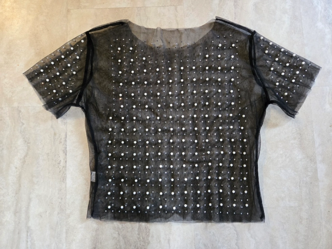 A new black mesh top. Adorned with many beads. Has short sleeves. Can easily be dressed up or down. You'll be glad you added this top to your wardrobe. Size small.