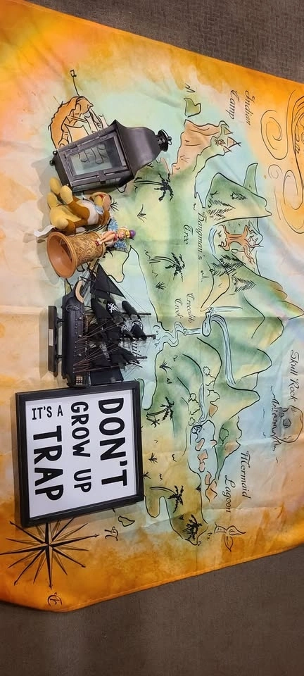 Neverland tapestry, Nana stuffed dog toy, Metal/Glass Lamp (one pane missing), Model Pirate Ship, Winter Tinker Bell Figurine, Wood Sign. Feel free to message if you have any questions!