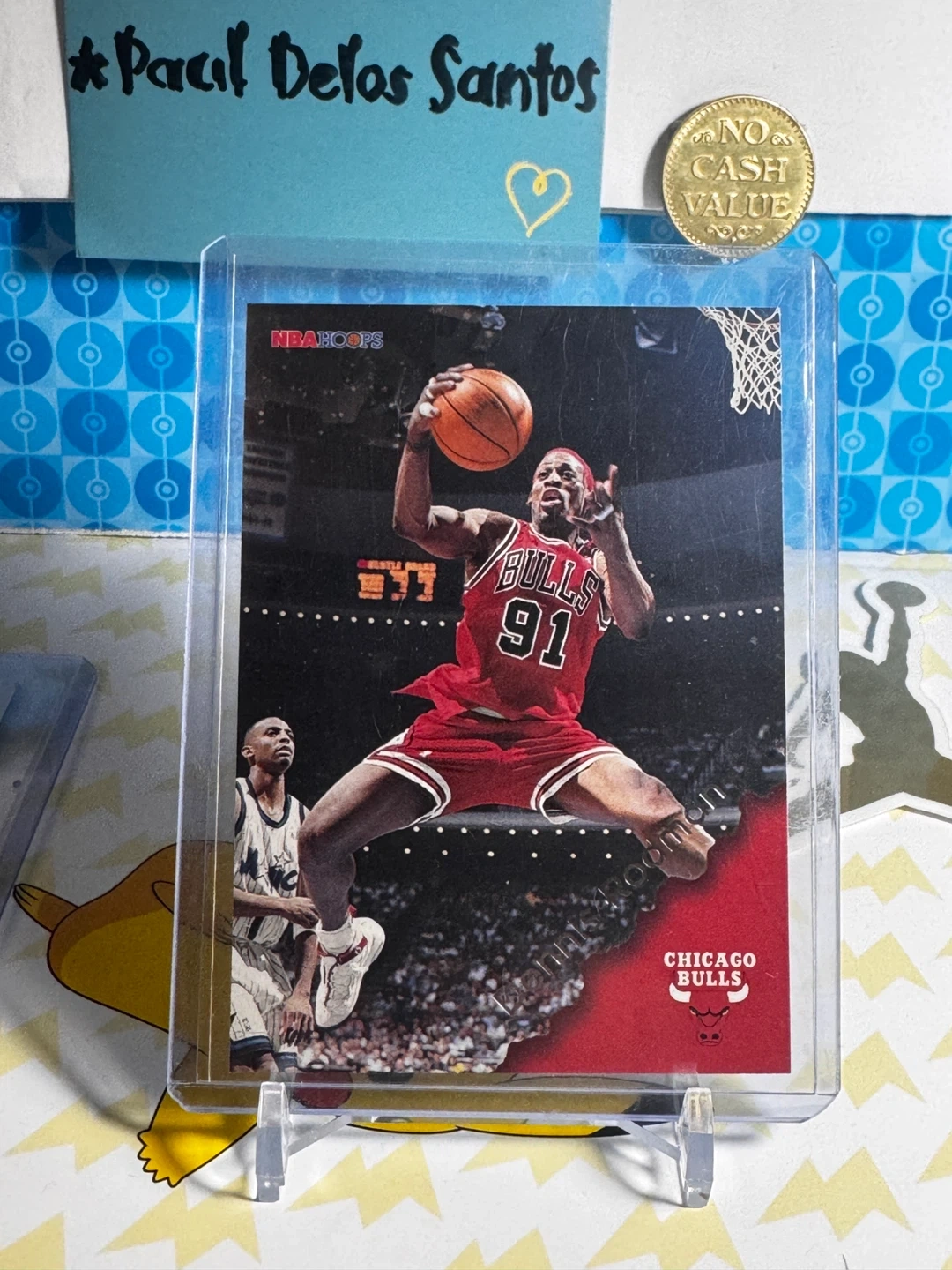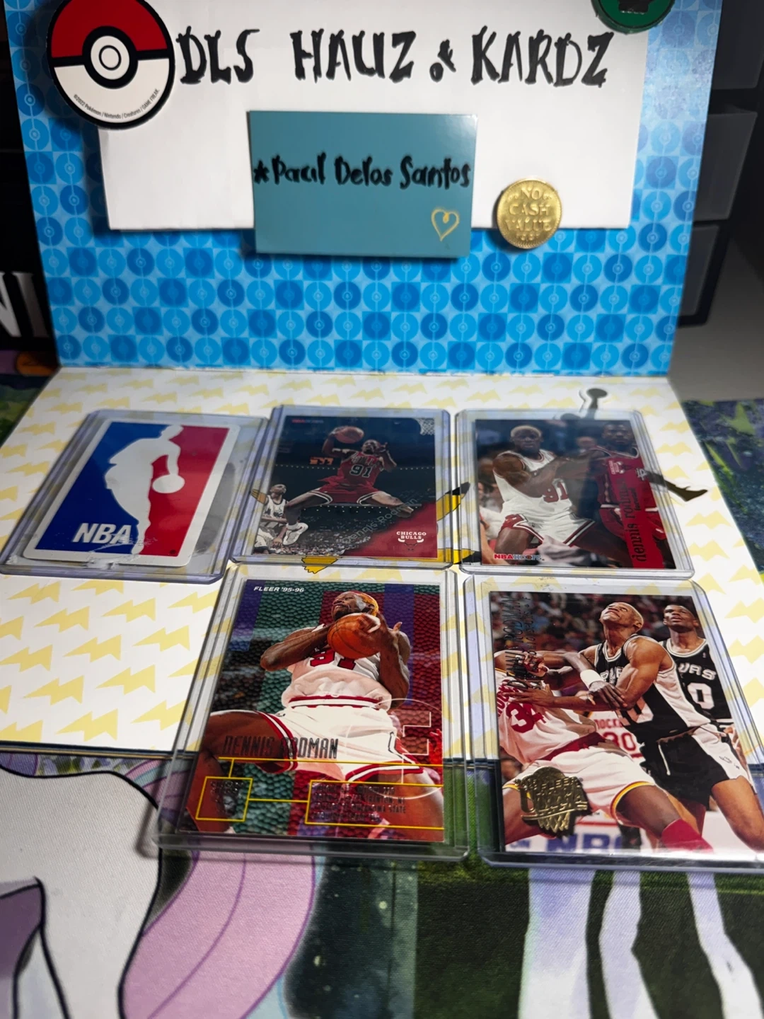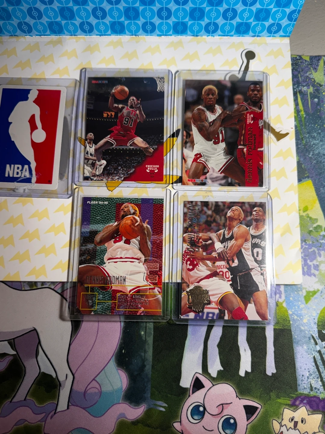 Collection of Dennis Rodman basketball cards featuring NBA Hoops and Fleer brands. Includes cards from the '95-'96 season. These cards are great for any basketball fan's collection!