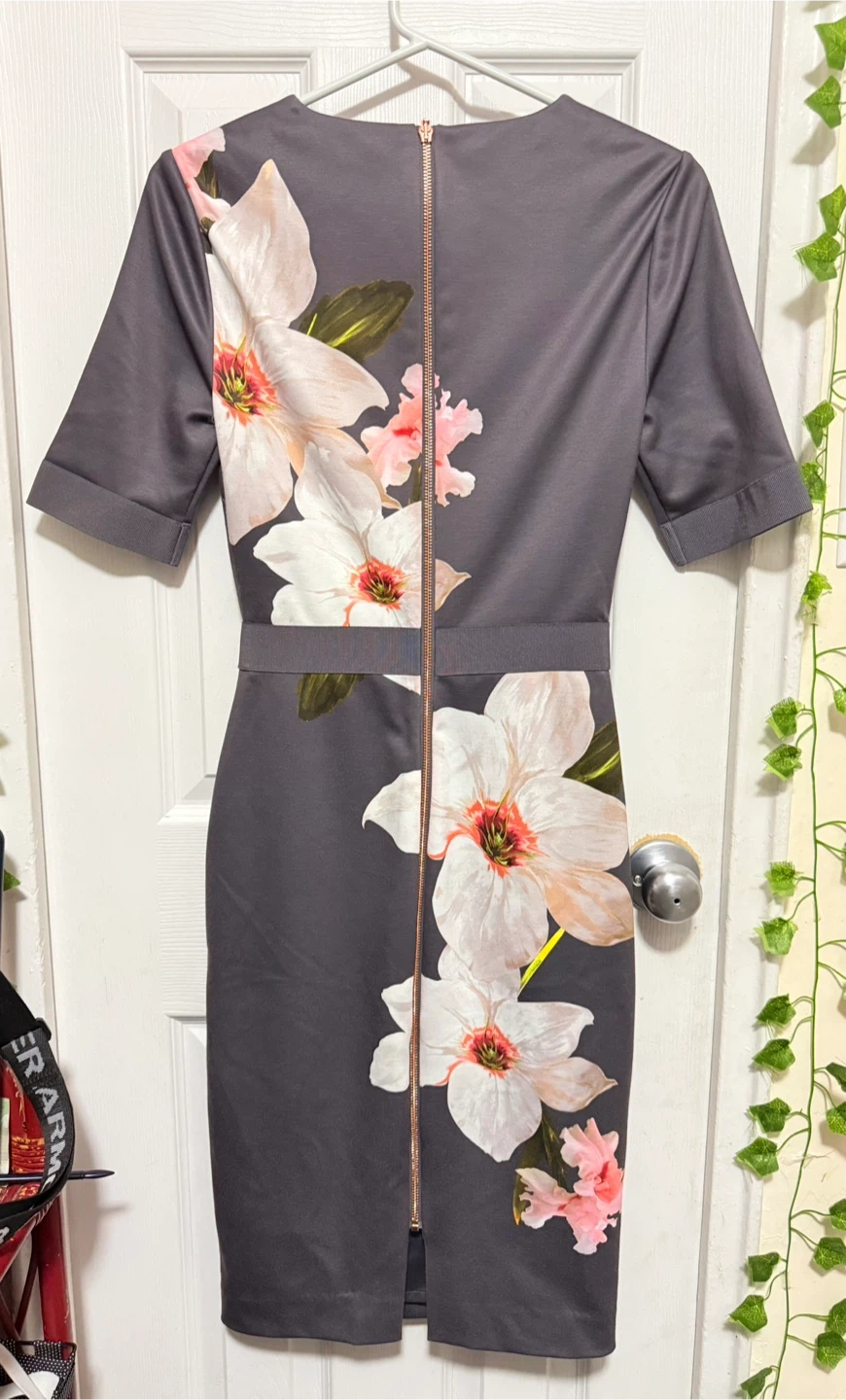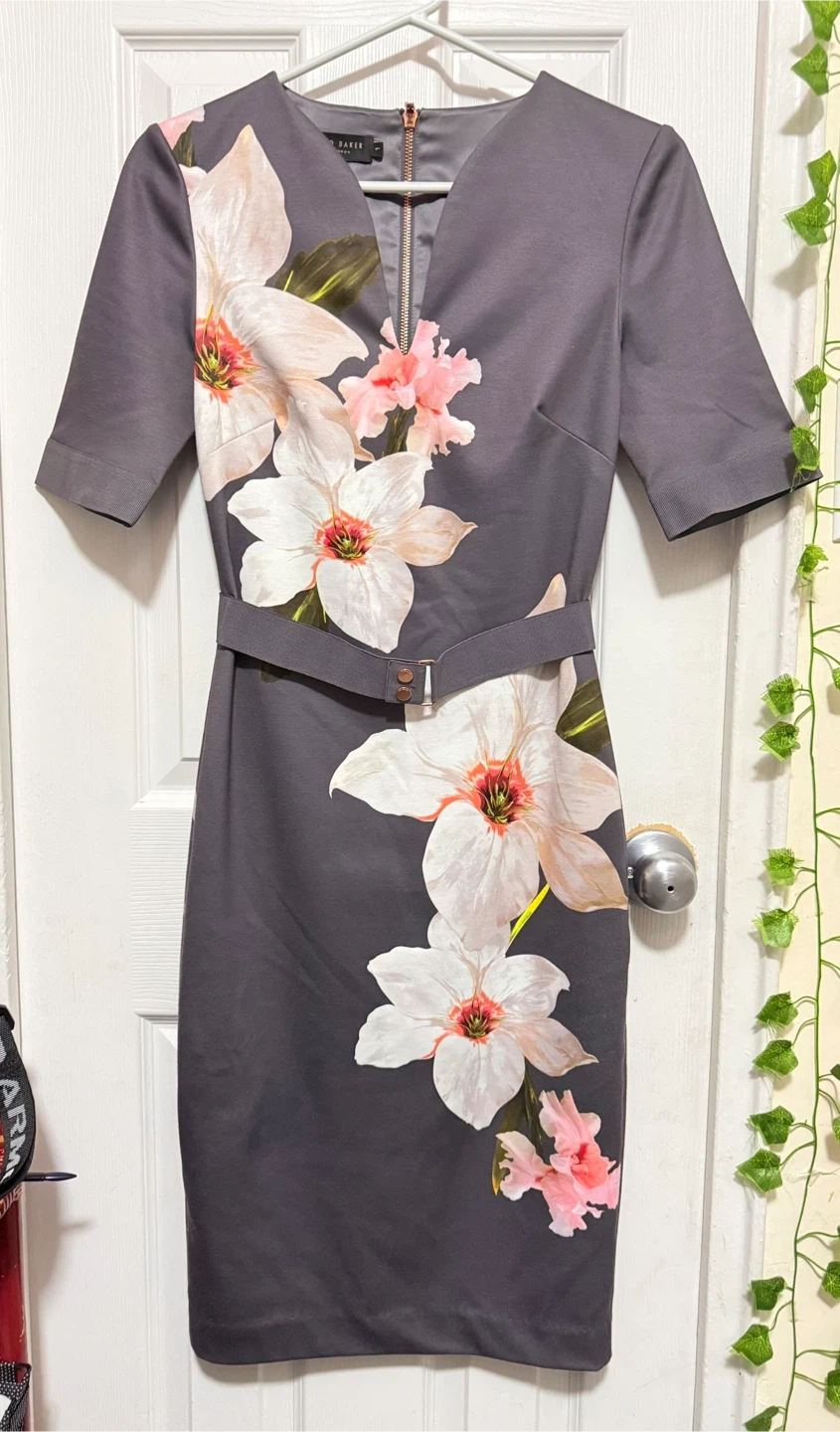 Ted Baker grey dress with a large floral print. It features short sleeves and a matching fabric belt. Zipper closure at the back. Size 1