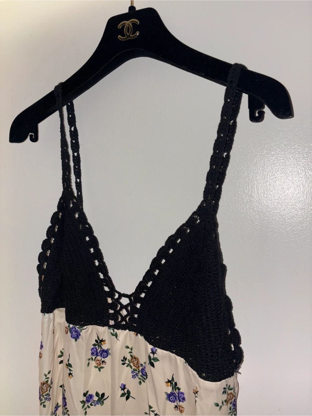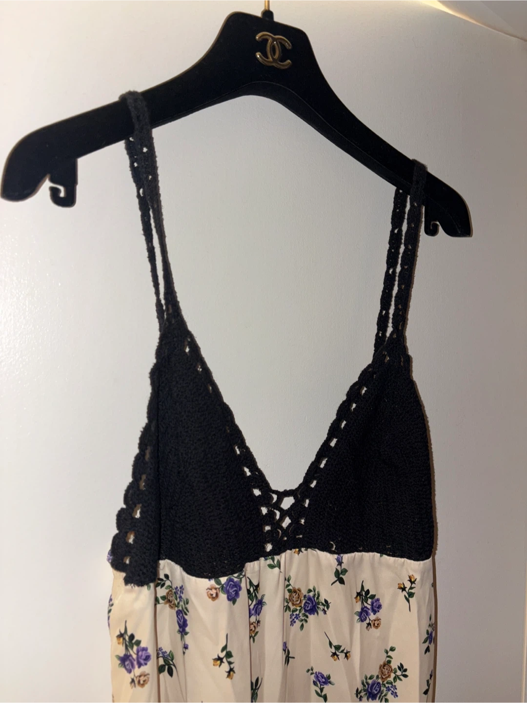 This flowy maxi dress features a black crochet bodice and a cream-coloured skirt with a delicate floral print. It's got adjustable spaghetti straps for a comfortable fit. This dress is perfect for a summer day out or a beach vacation!