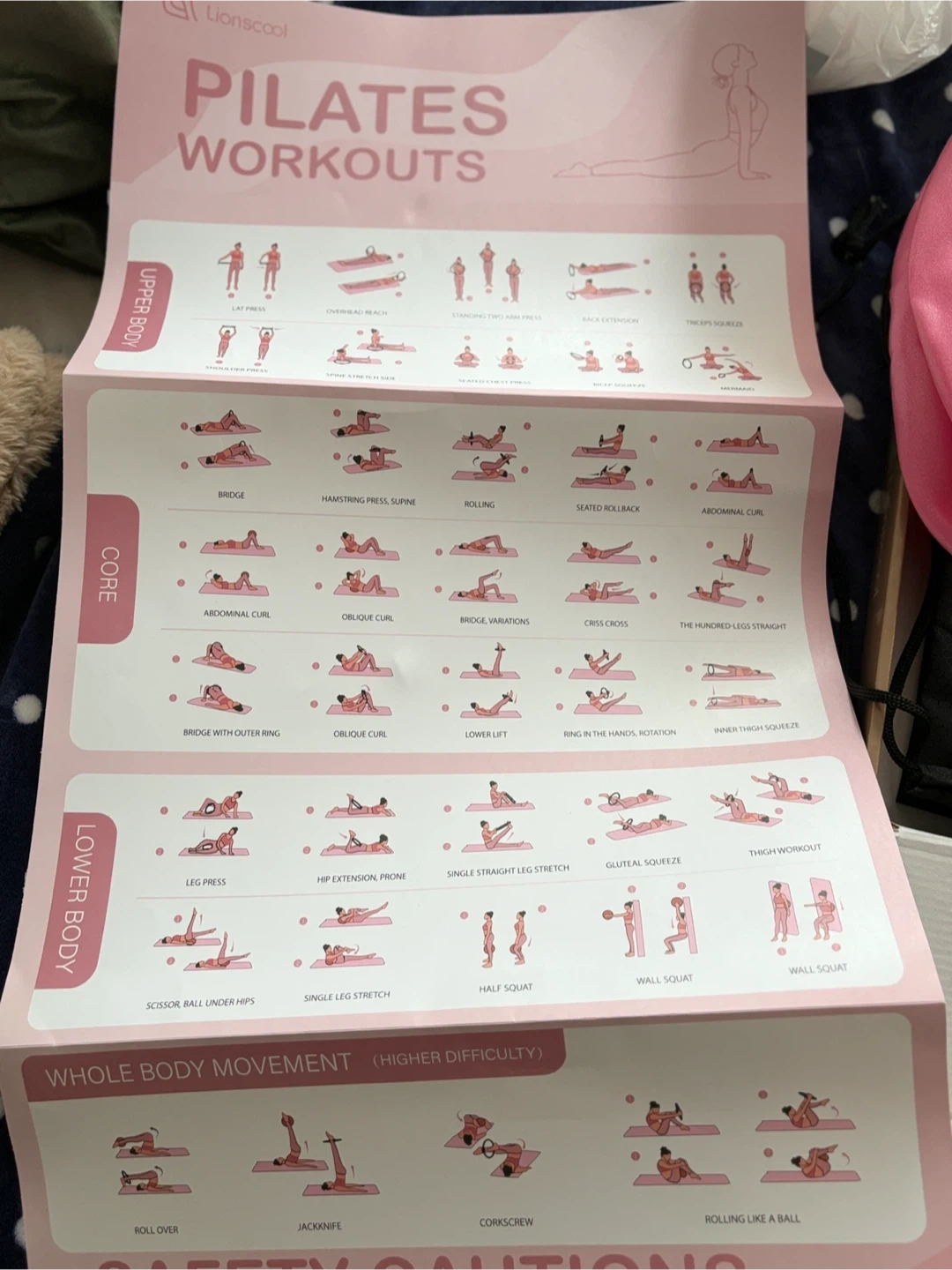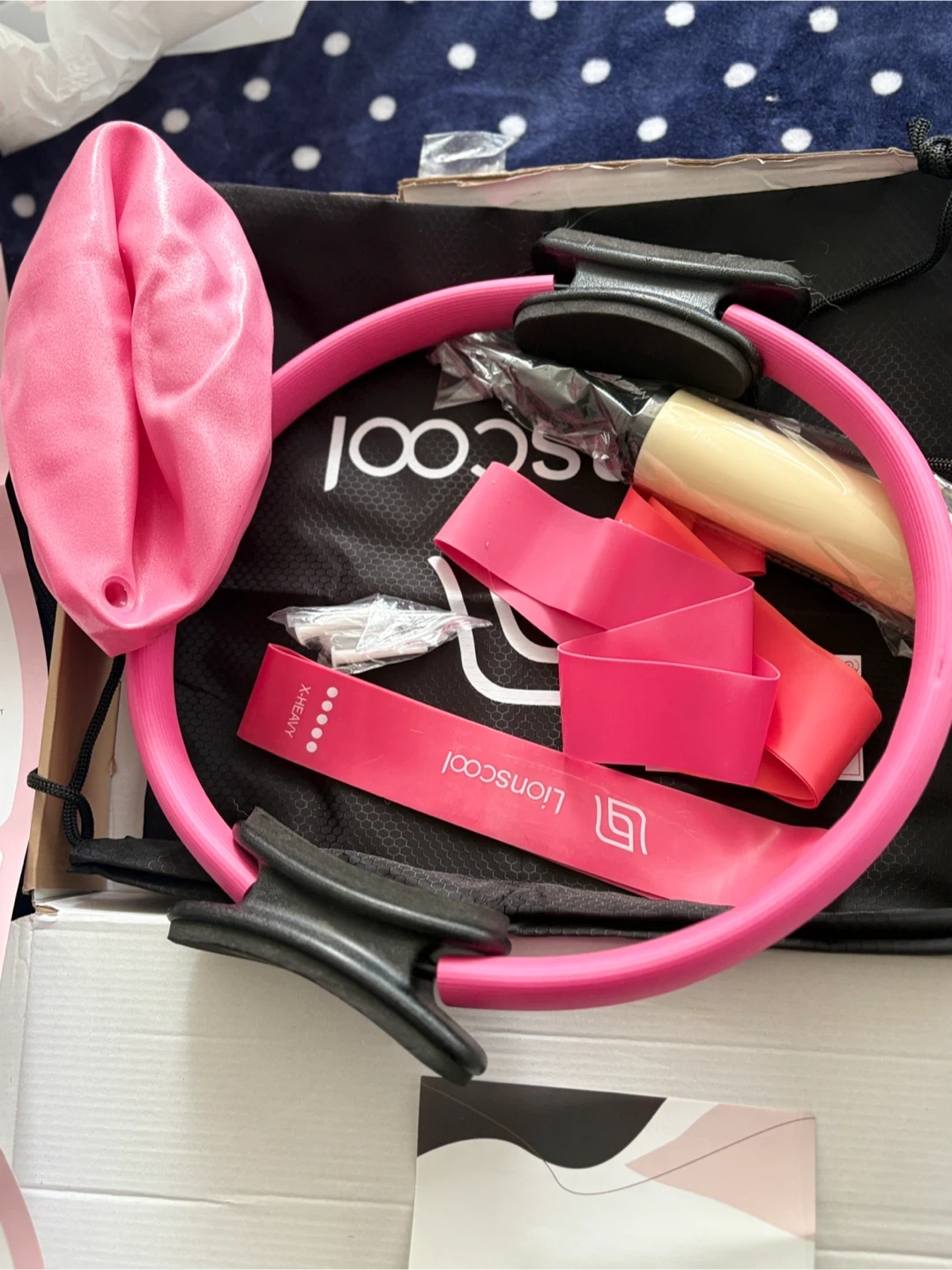 This Lionscool Pilates workout set includes resistance bands and a yoga ring. It's designed for various exercises targeting different body parts. The set also comes with a workout guide detailing different movements. This collection is great for home fitness routines!