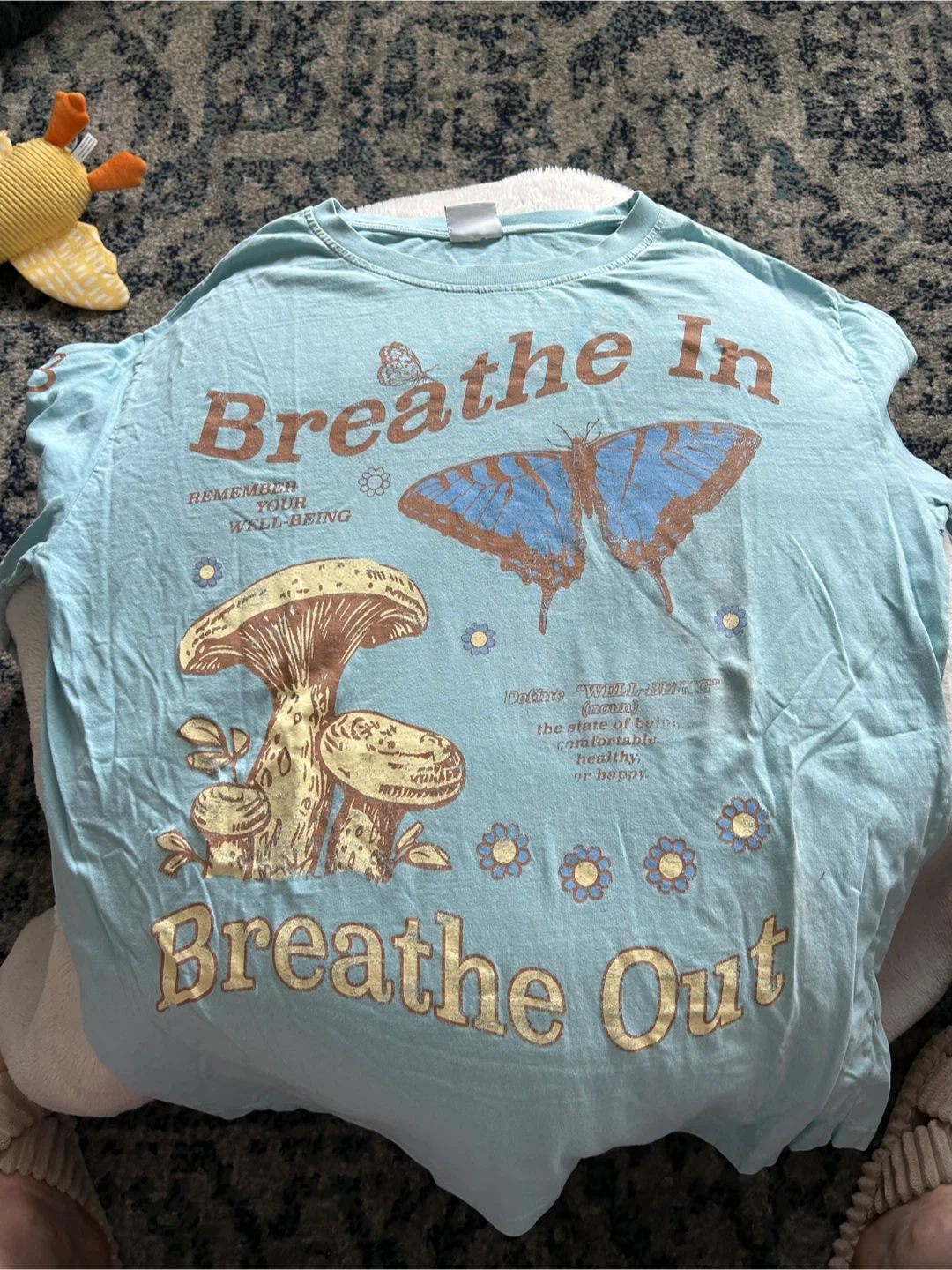 100Selling a BDG Urban Outfitters graphic tee in size M/L. It features a cute butterfly and mushroom design with the words "Breathe In, Breathe Out". It's in great condition and ready for a new home