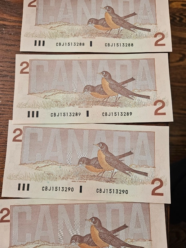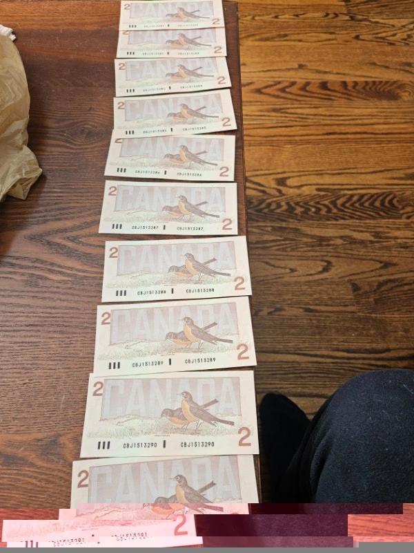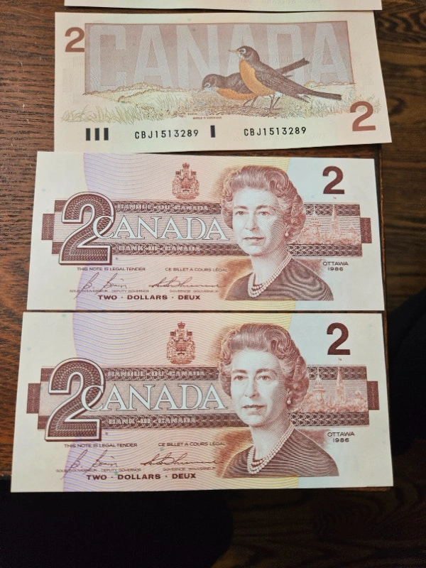 Uncirculated and mint condition 1986 Canadian 2 Dollar Bills. CBJ Serials. Bonin - Thiessen. Selling individually at $5 each, or 10x $2 bills with sequential serials for $90.