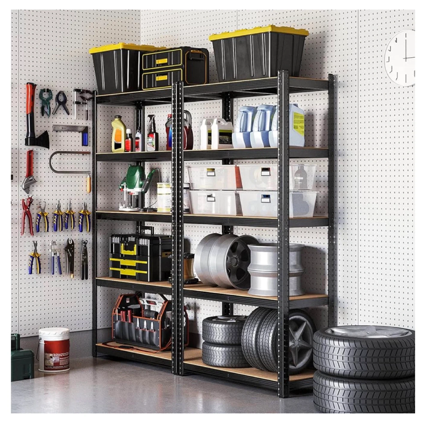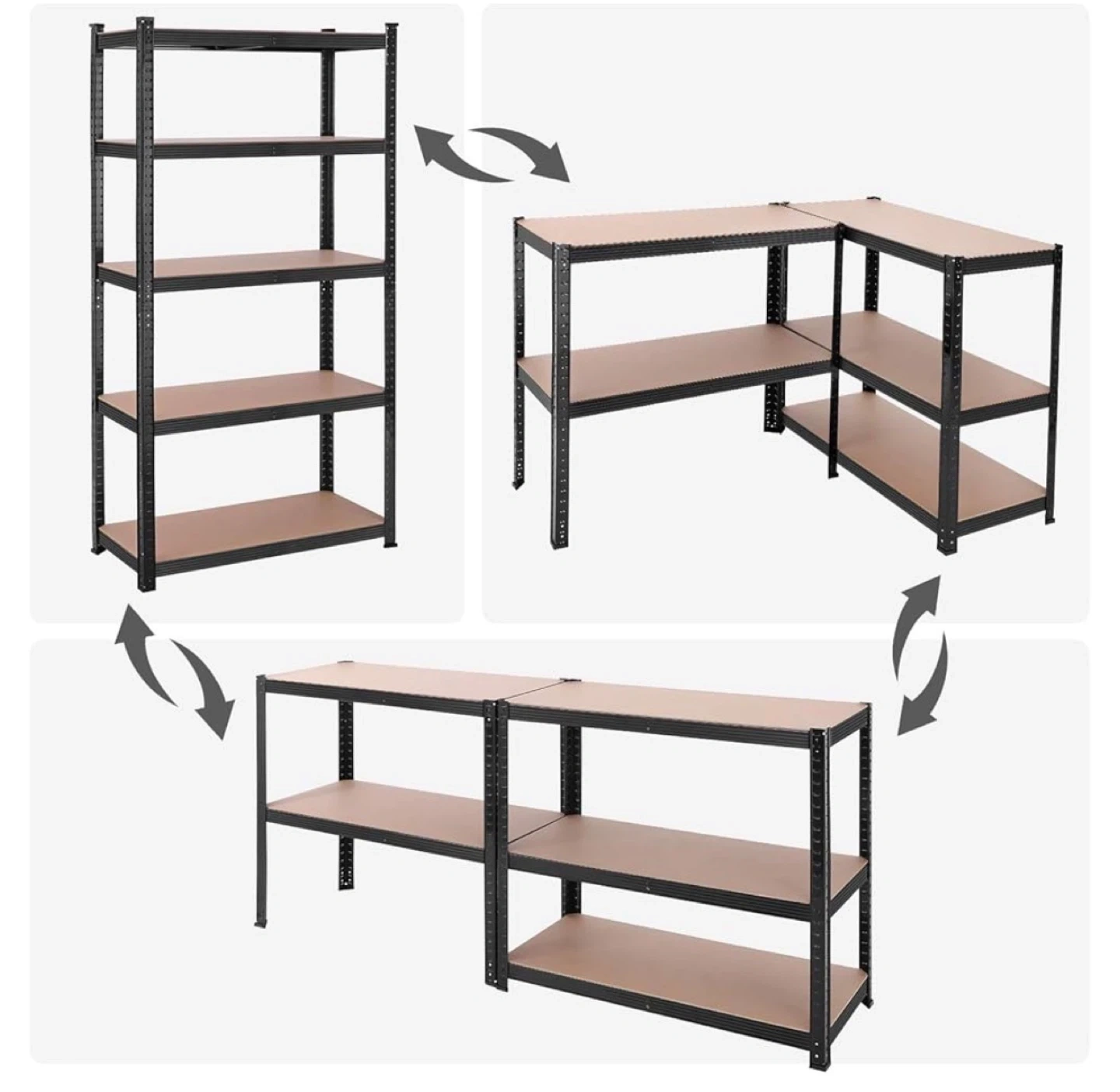 This five-tier shelving unit offers substantial storage. Each shelf holds up to 175kg. It's constructed from durable metal with particleboard shelves. The unit can be configured in various ways, including as an 'L' shape or two separate units. This is handy for organizing garages, workshops, or storage rooms!