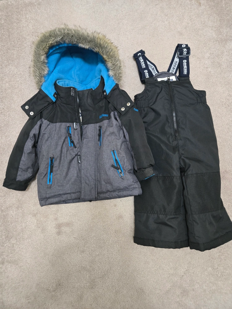 Black and grey snowsuit with fur-lined hood, jacket and bib overalls. size is 2T. smoke and pet free home. Message if interested.