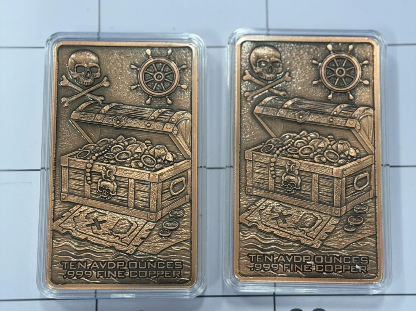 Two 10-ounce bars of 999 fine copper. Each bar depicts a famous pirate: William Kidd and Bartholomew Roberts. Features detailed embossed designs.