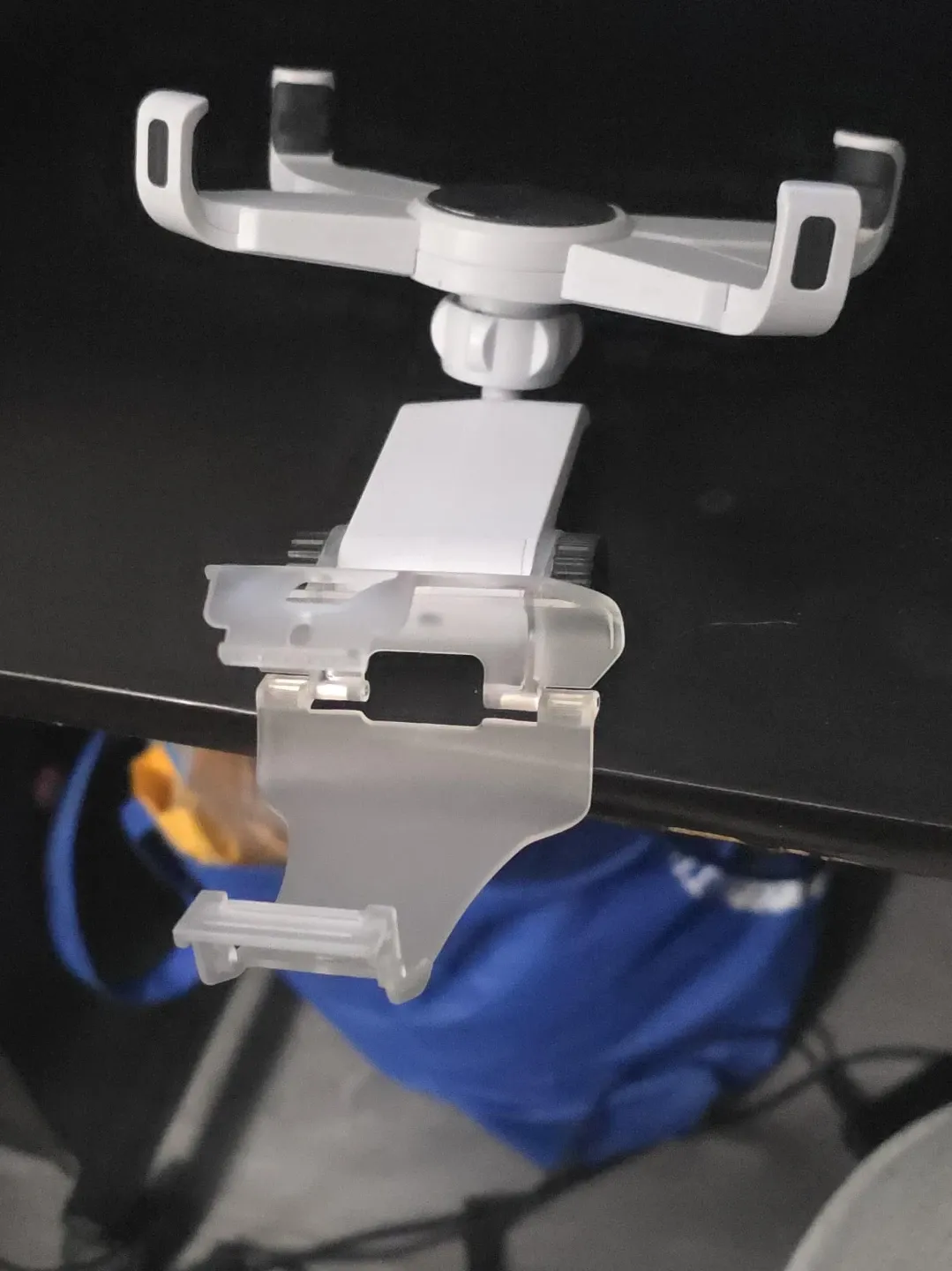 This is a white clamp mount for holding a tablet or phone. It features an adjustable arm and a strong clamp base. It's made of plastic. Just add a ps5 controller and snap ur mobile phone for and emerging hand held gaming device
